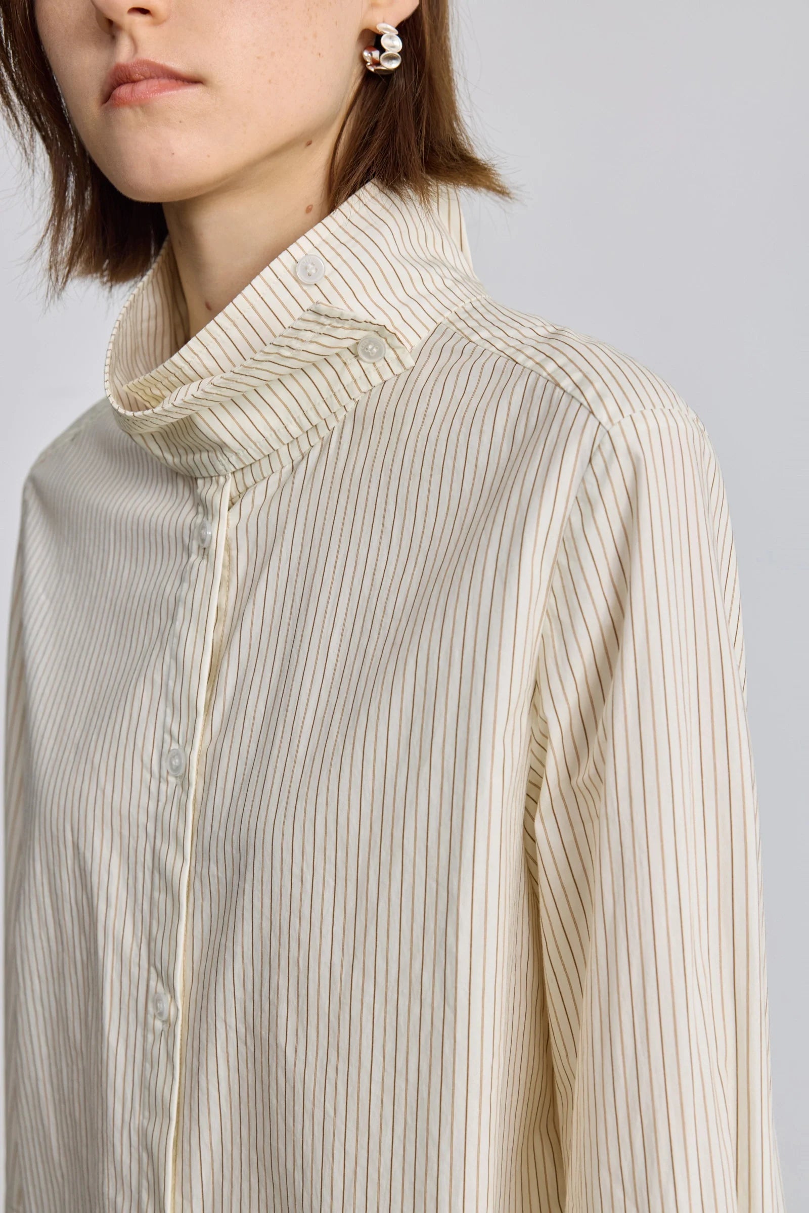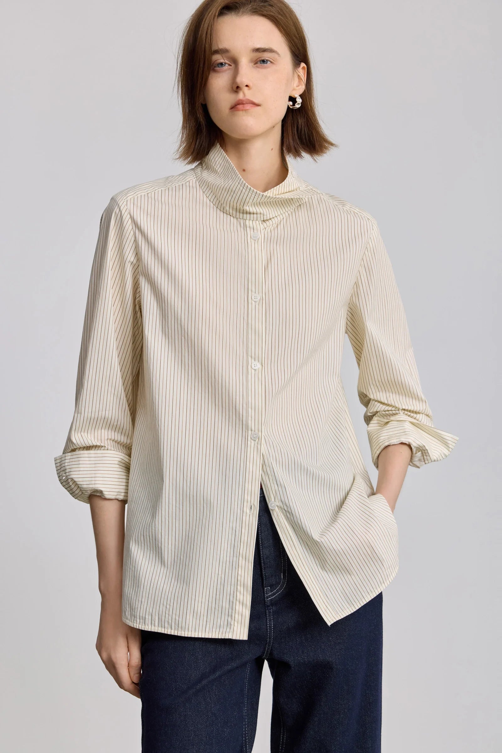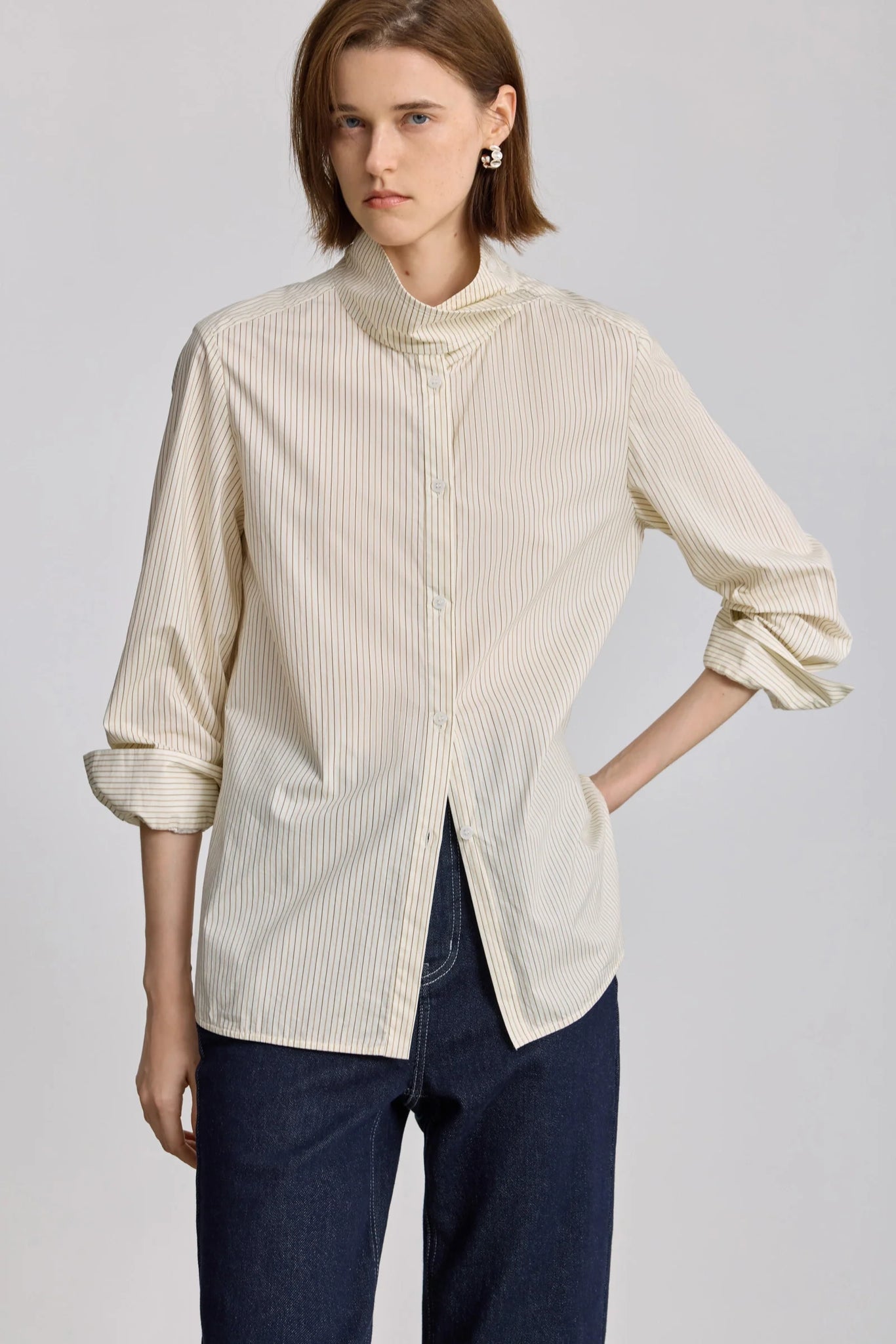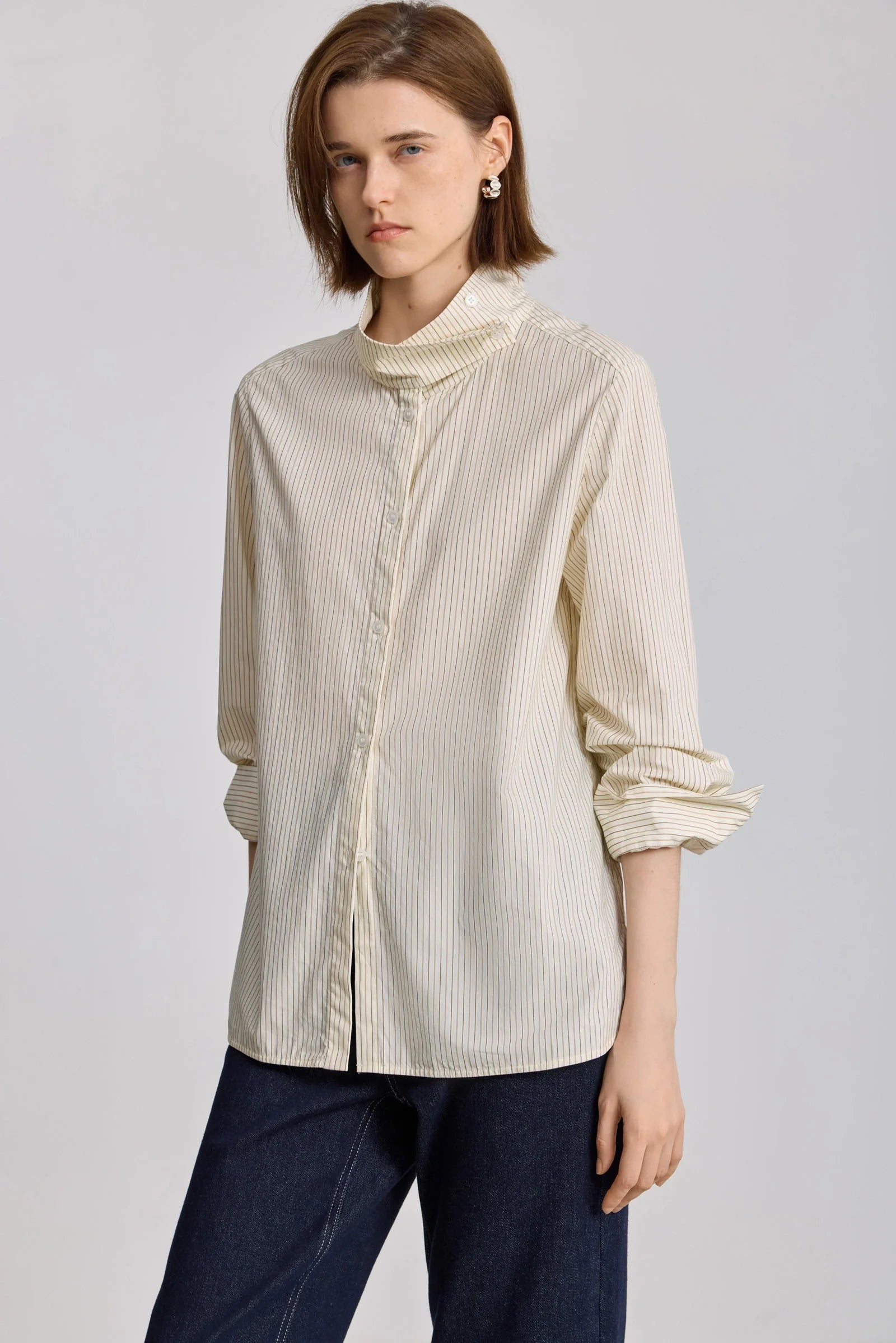 • A simple stand-up collar top; the flexible button design creates an expressive wear experience