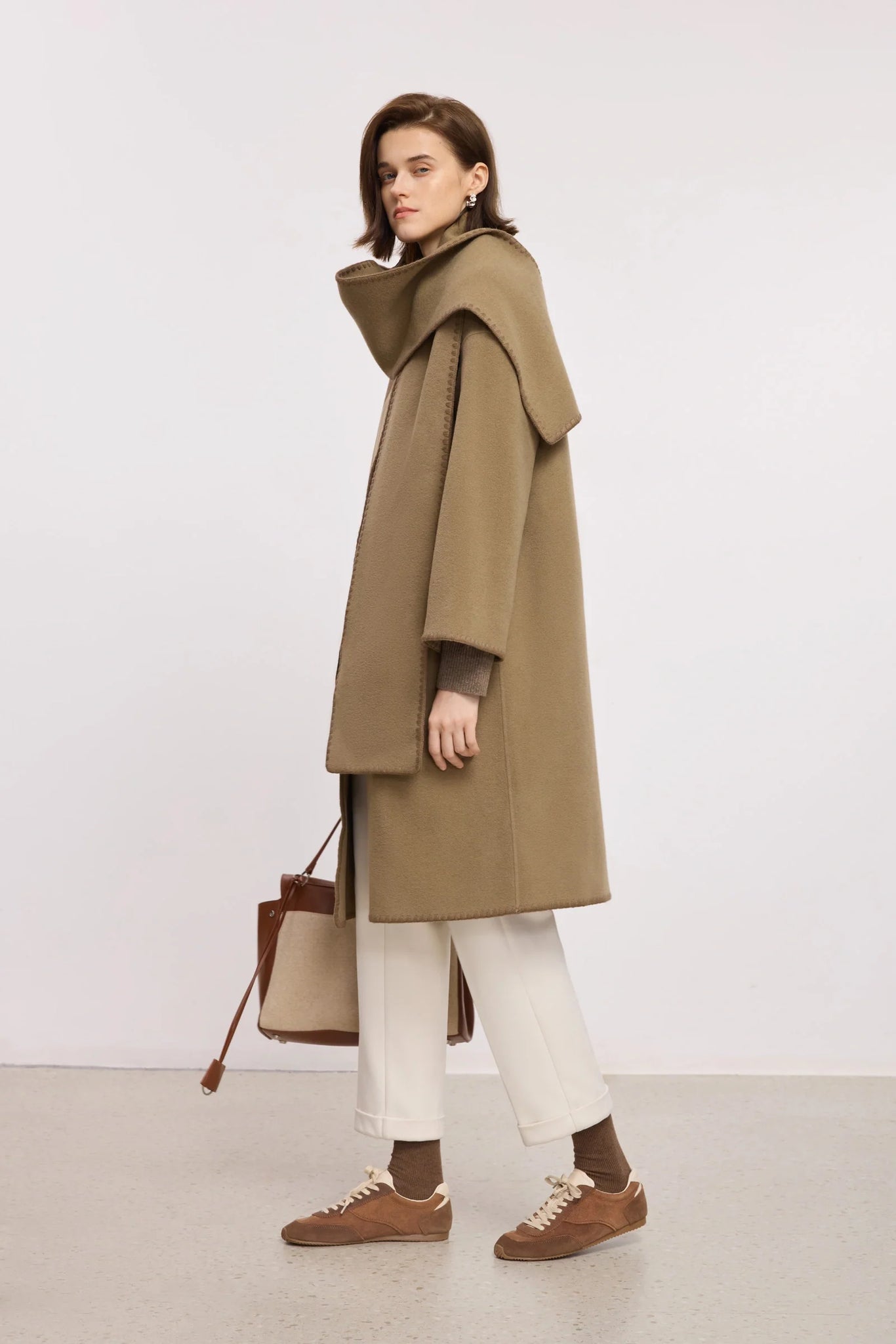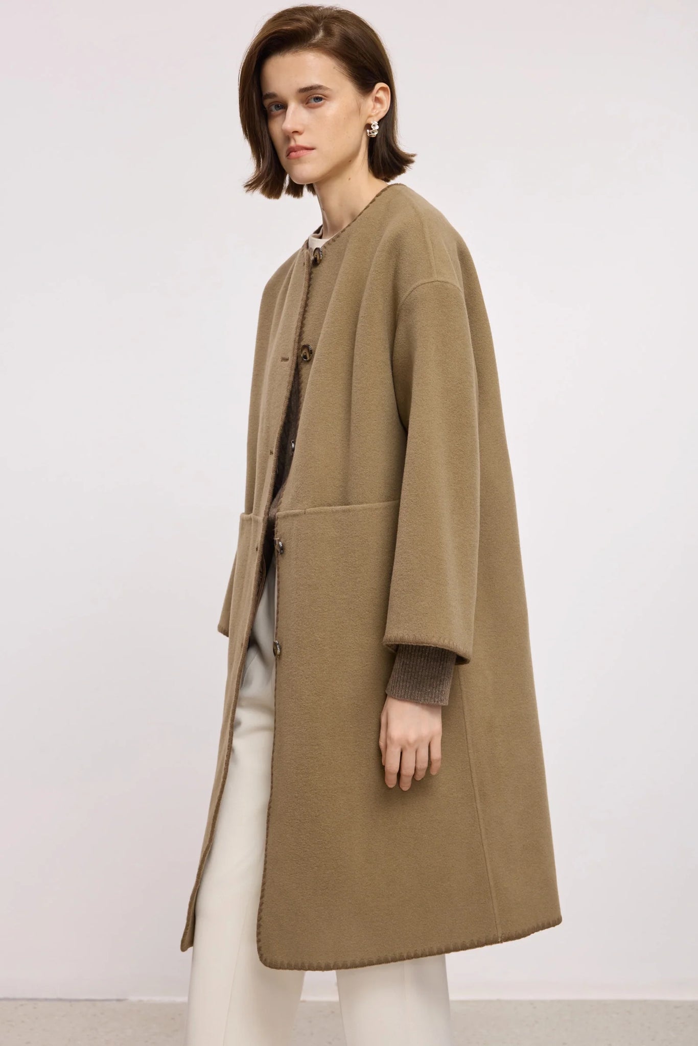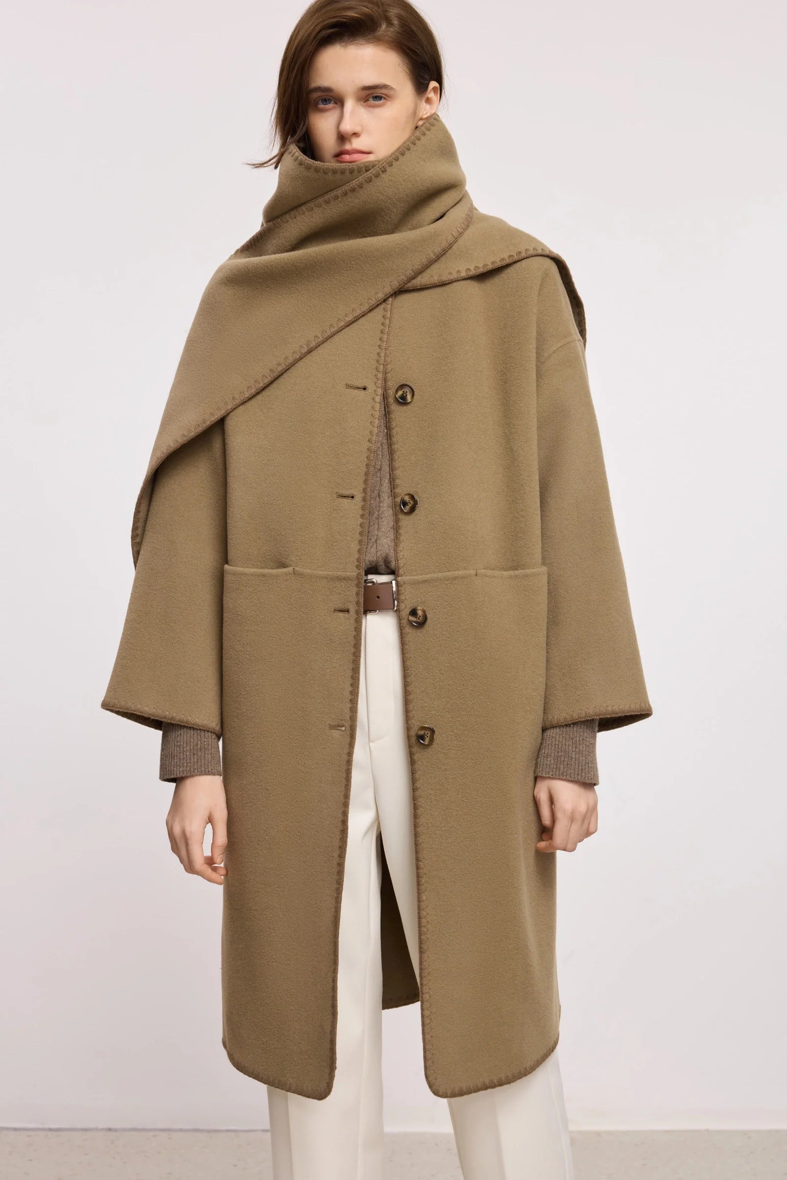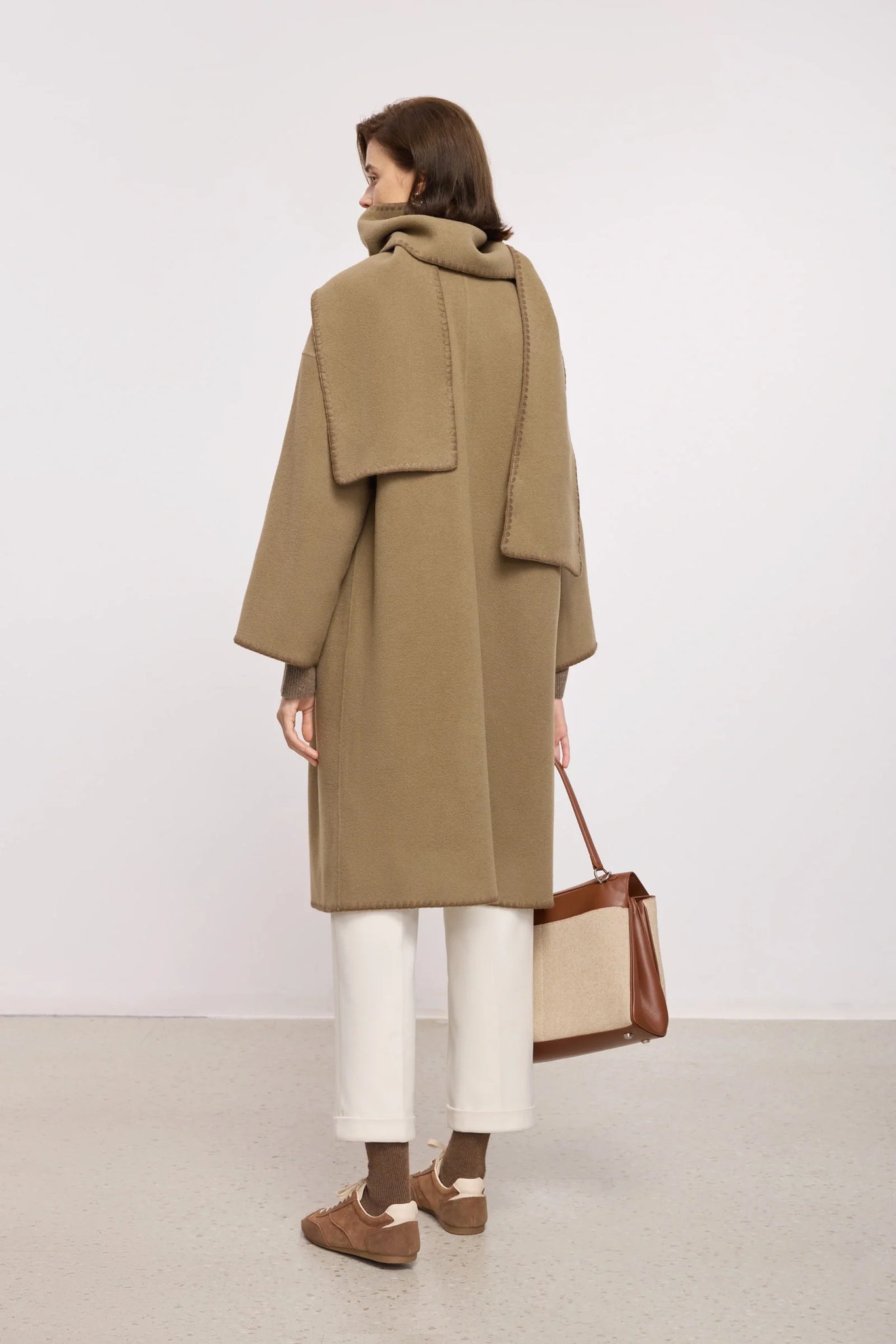 The loose, straight-fit wool coat creates a crisp silhouette, evoking a sharp and powerful look. The detachable scarf allows for versatile styling, protecting against the cold while also transforming your look. Contrasting shell embroidery on the placket, collar, and cuffs adds a subtle touch of sophistication, elevating the overall look.