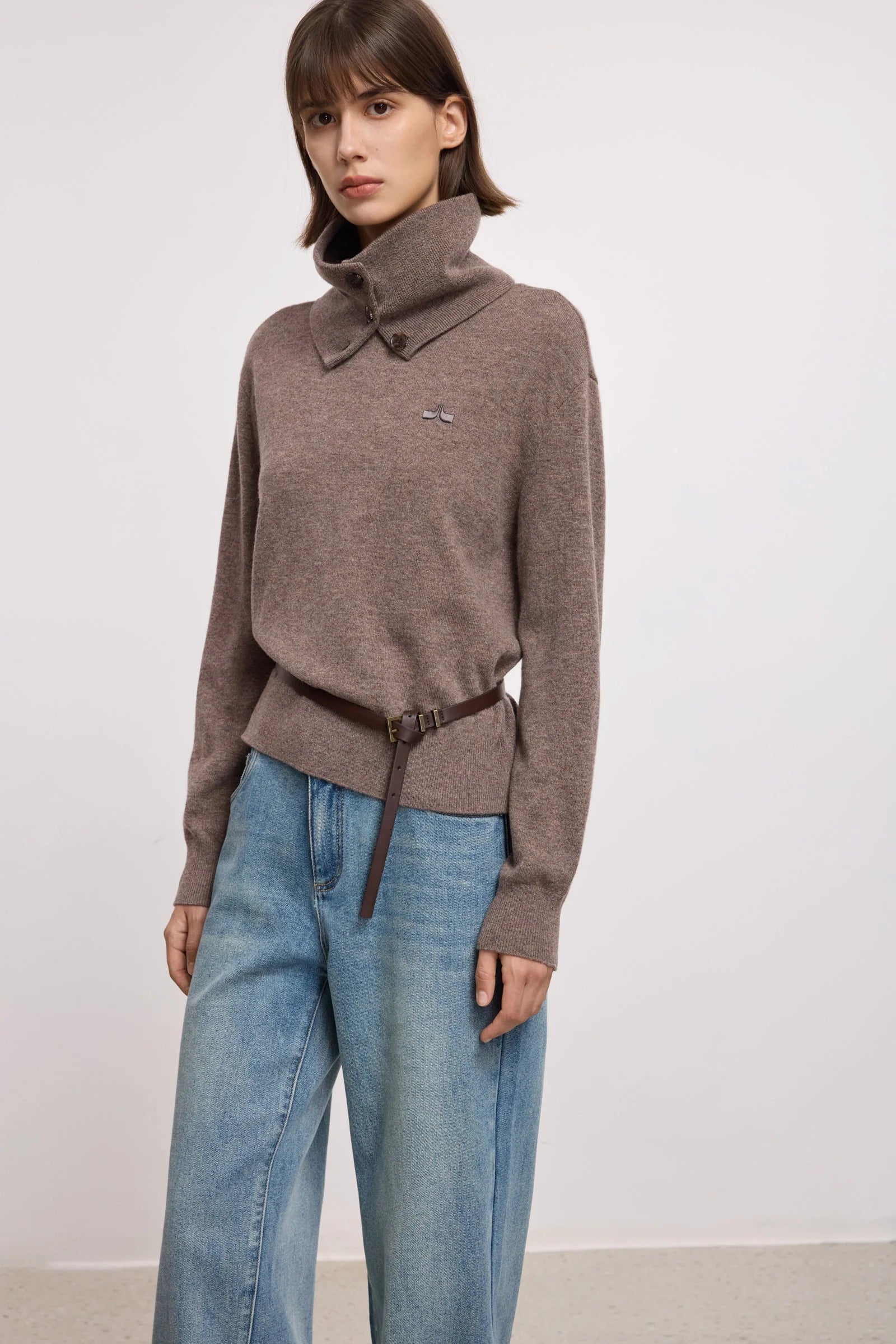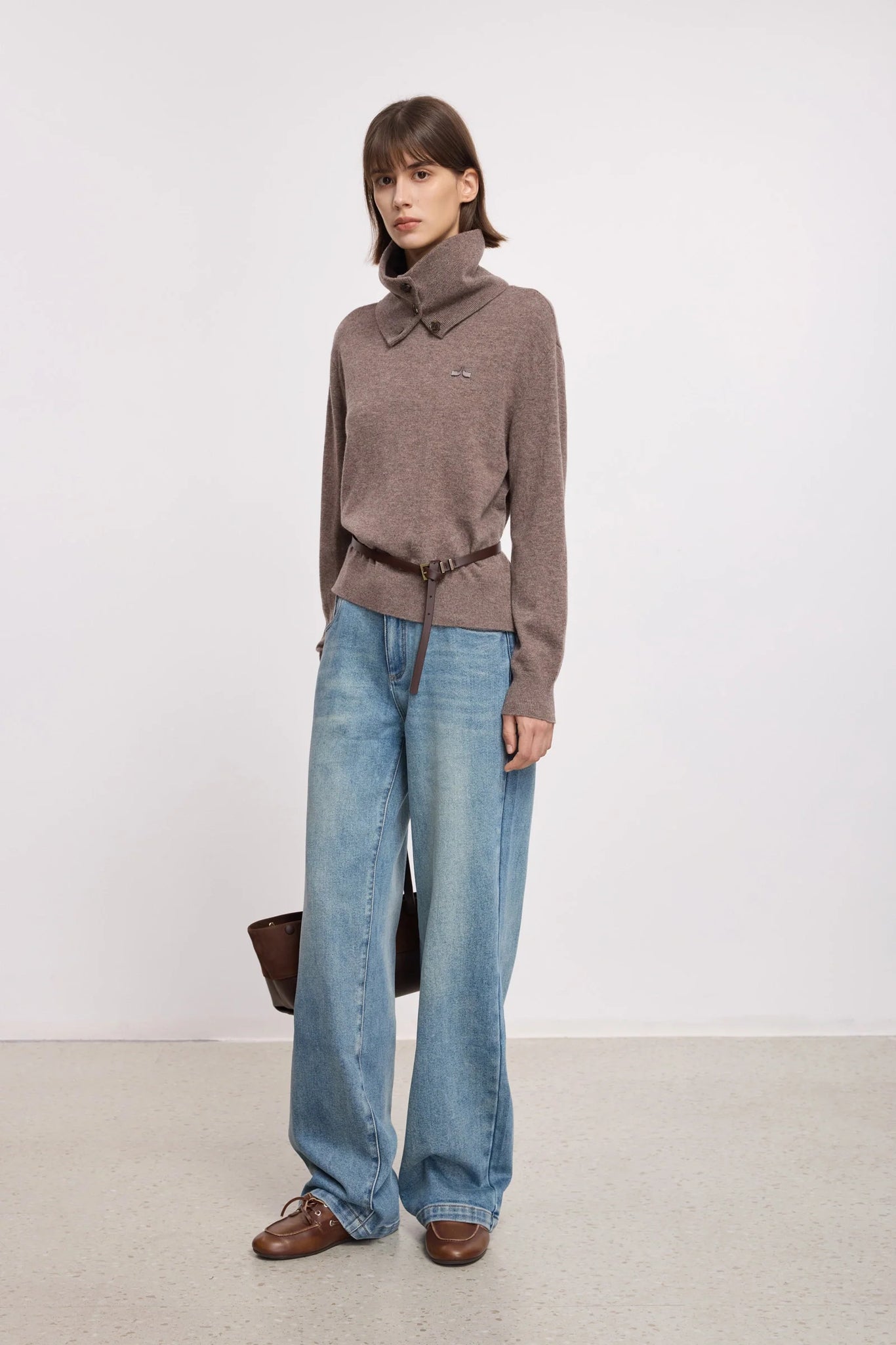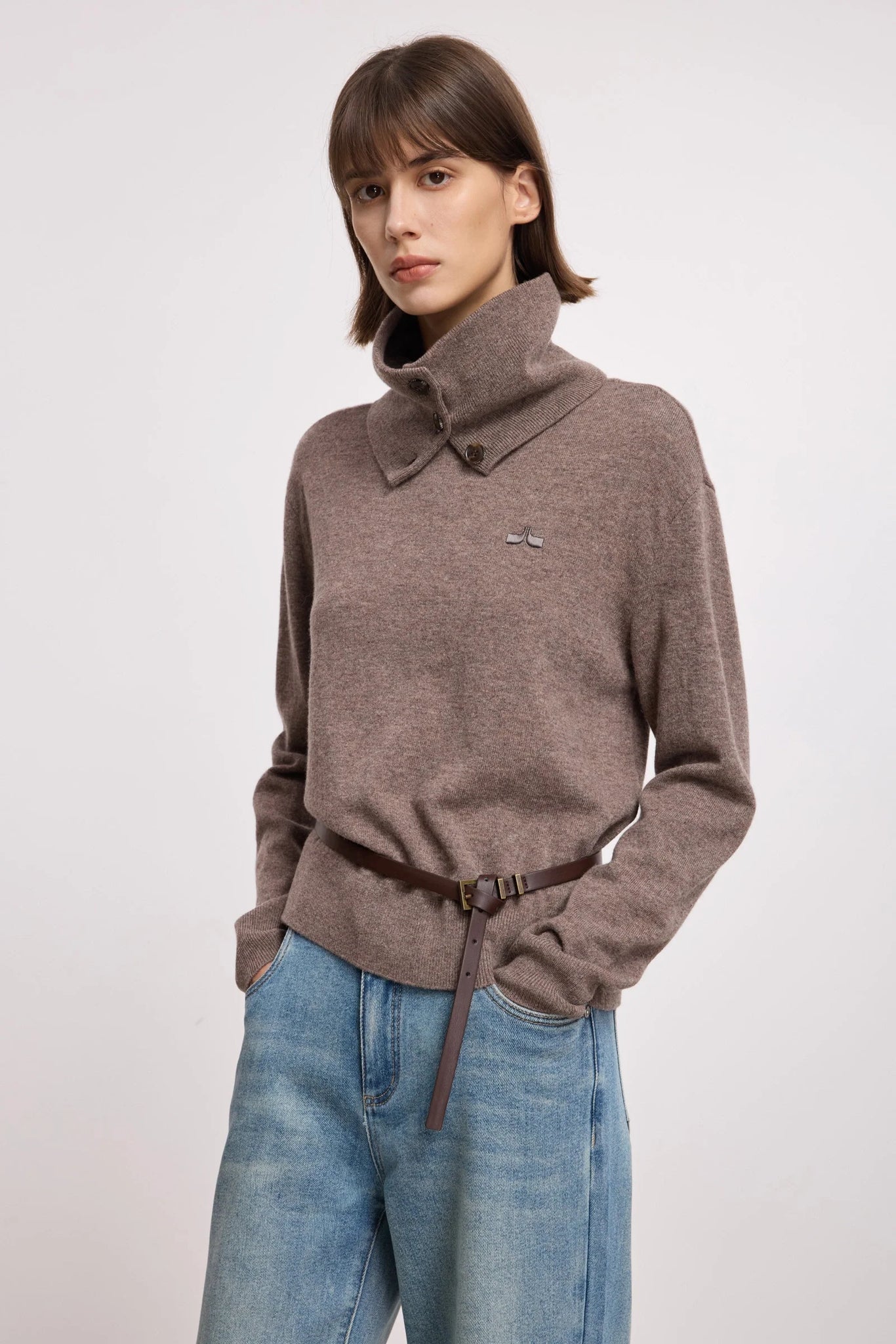 Removing the scarf reveals the versatile nature of the basic round-neck knit pullover. The slightly loose fit, combined with a tight plain weave, highlights clean lines and a premium feel, evoking a confident and powerful woman.