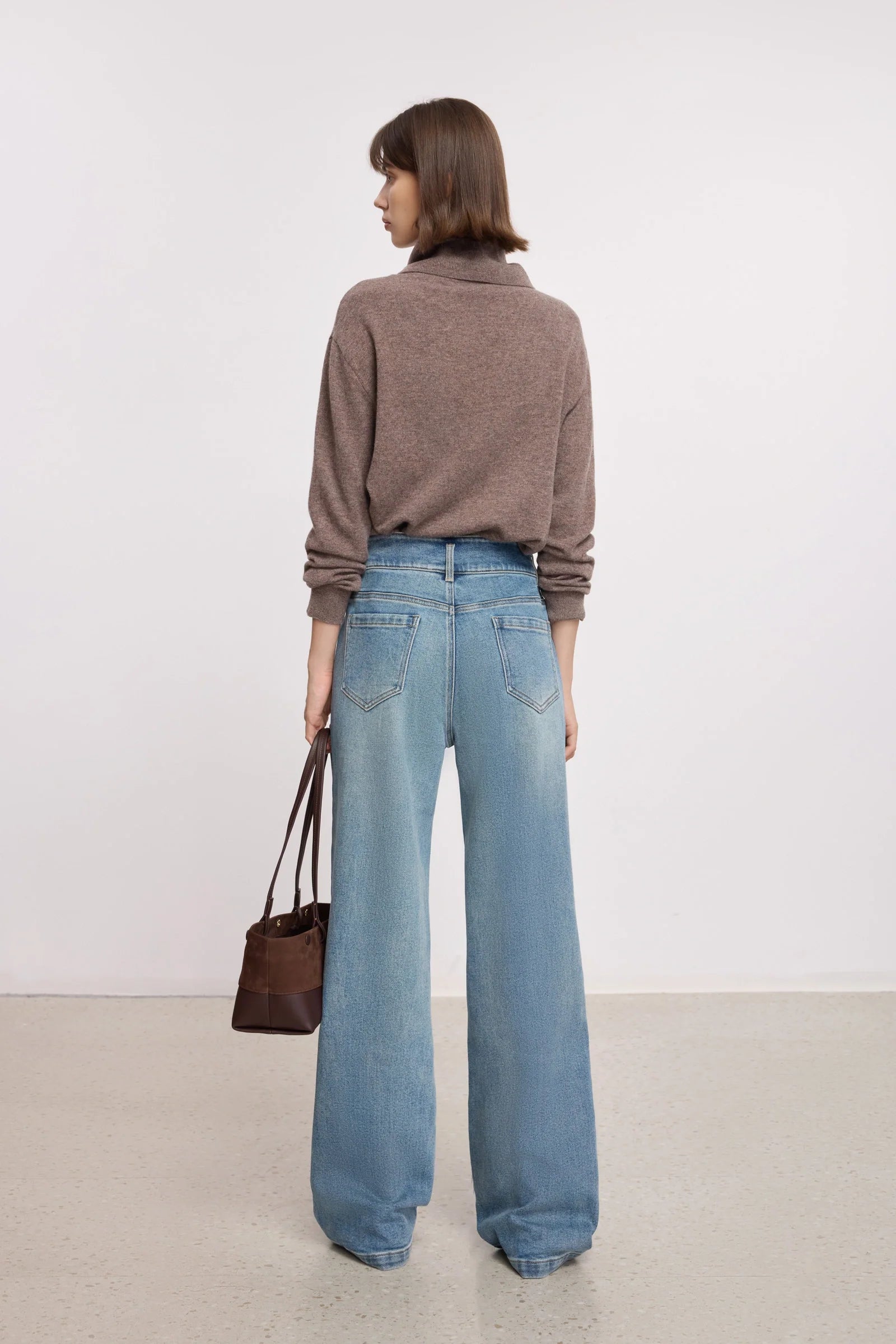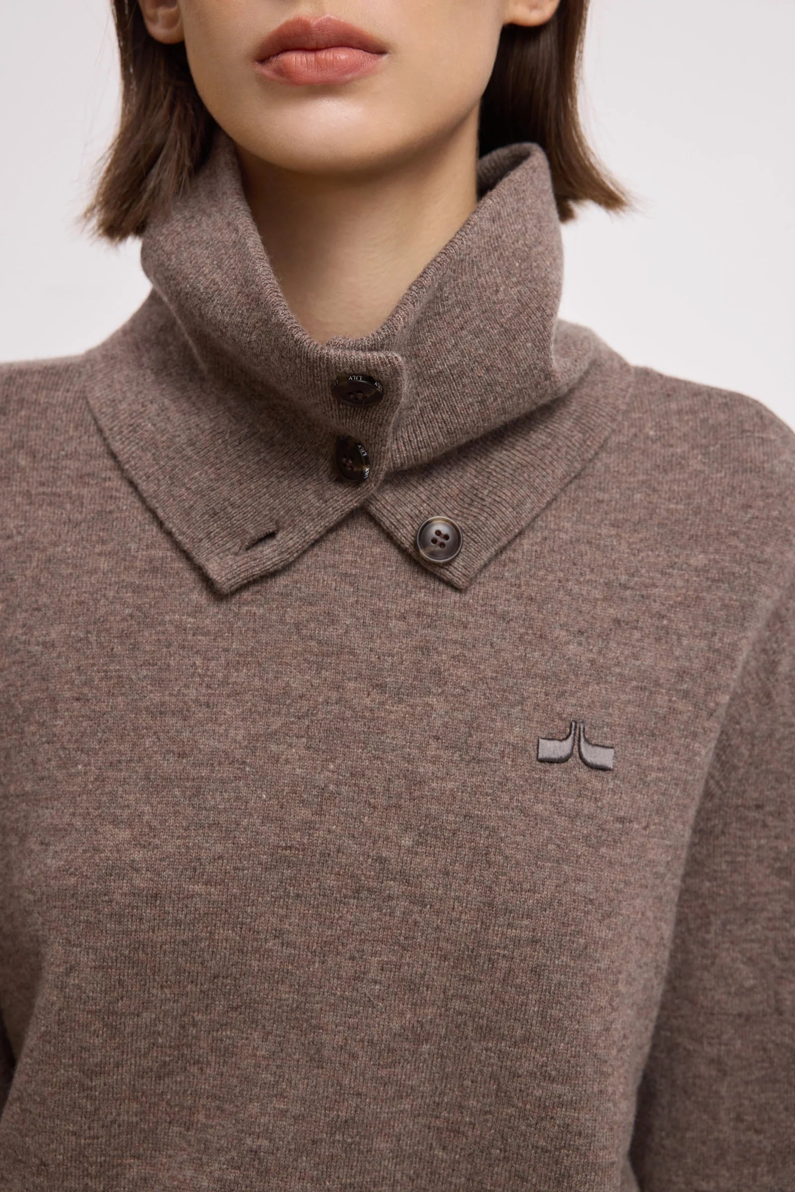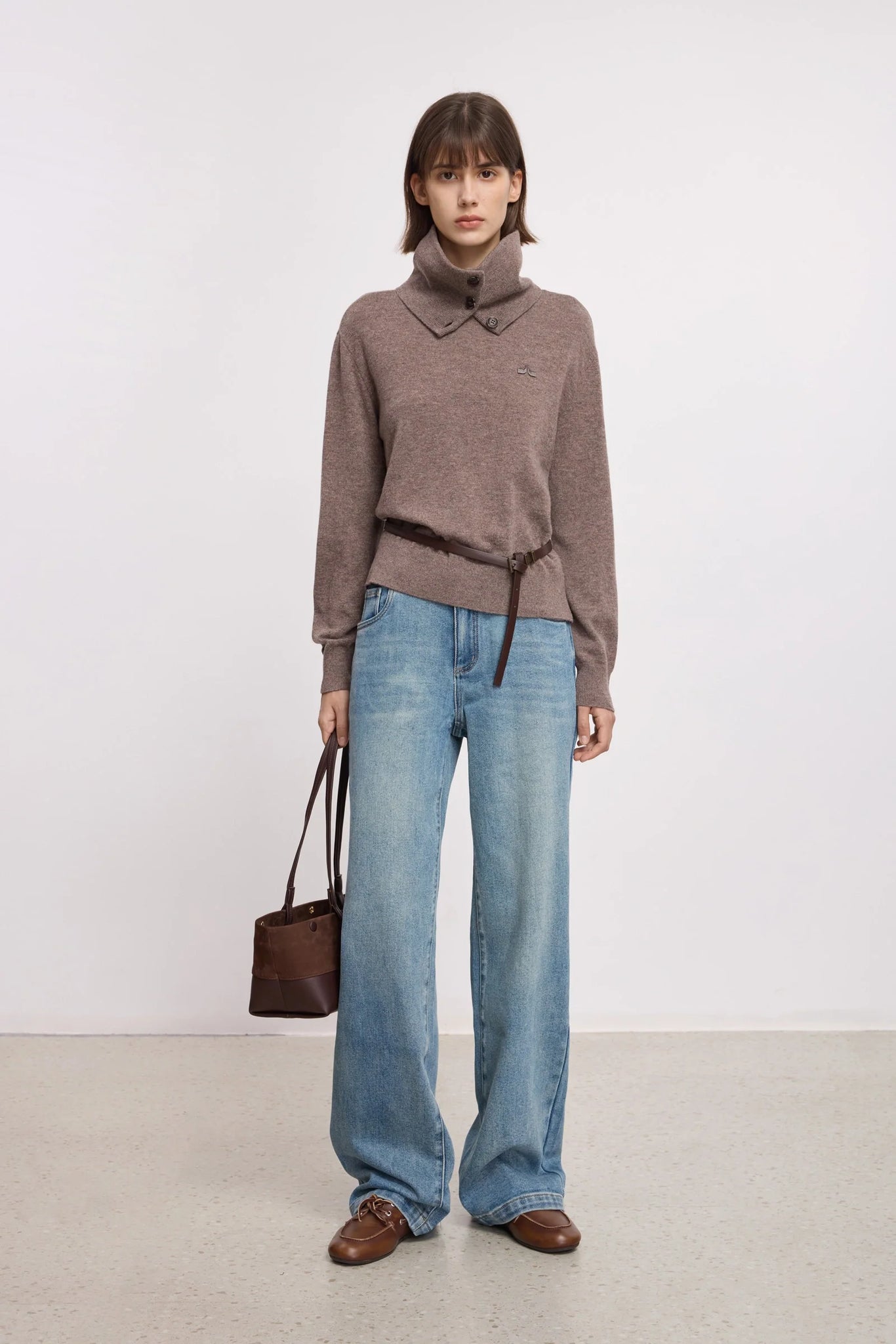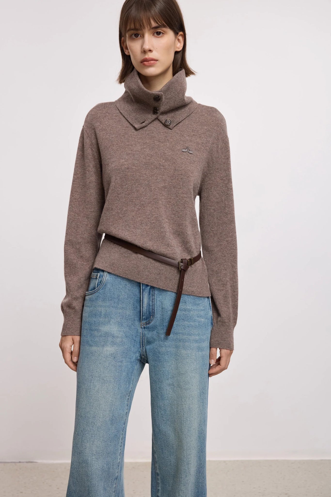 Removing the scarf reveals the versatile nature of the basic round-neck knit pullover. The slightly loose fit, combined with a tight plain weave, highlights clean lines and a premium feel, evoking a confident and powerful woman.