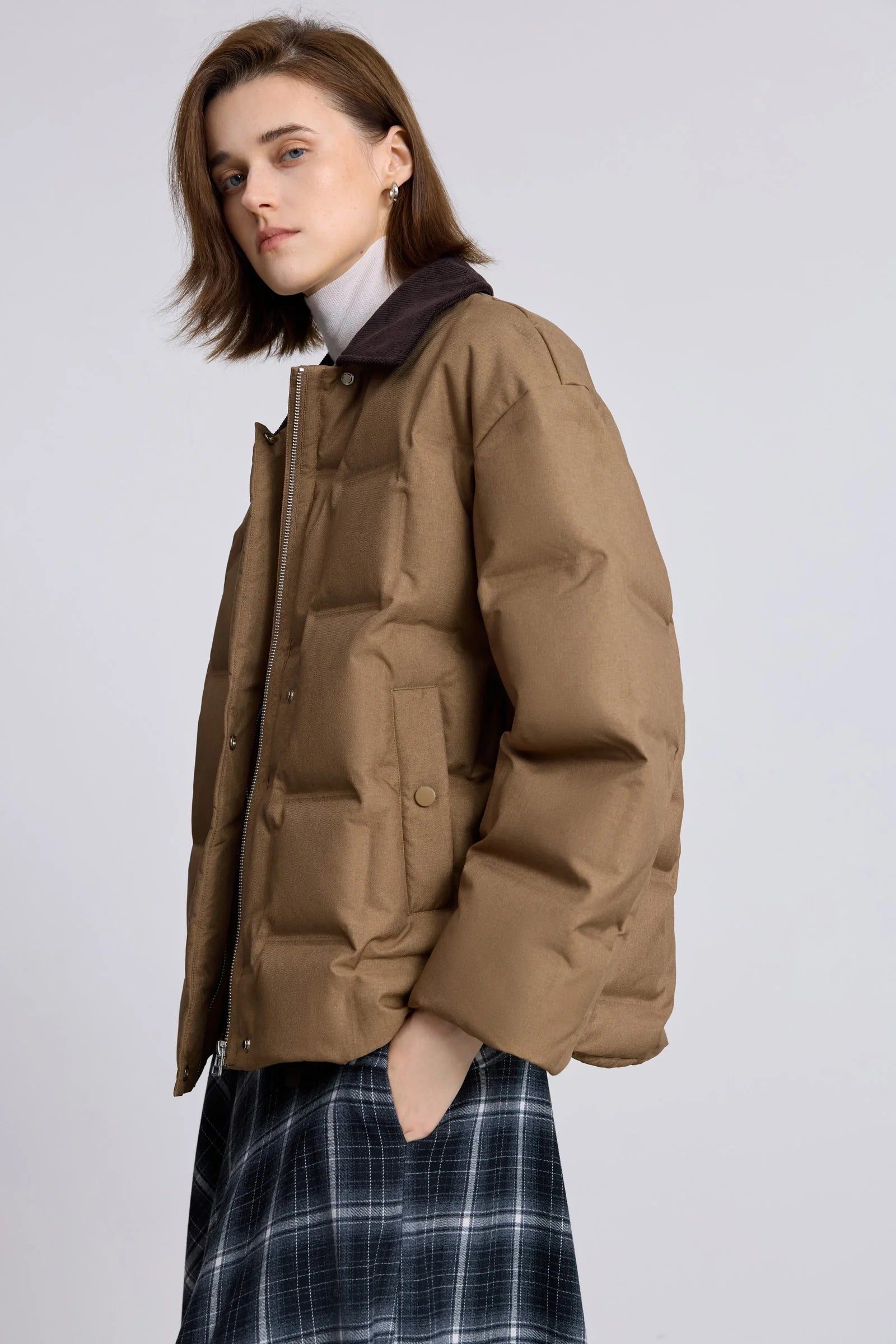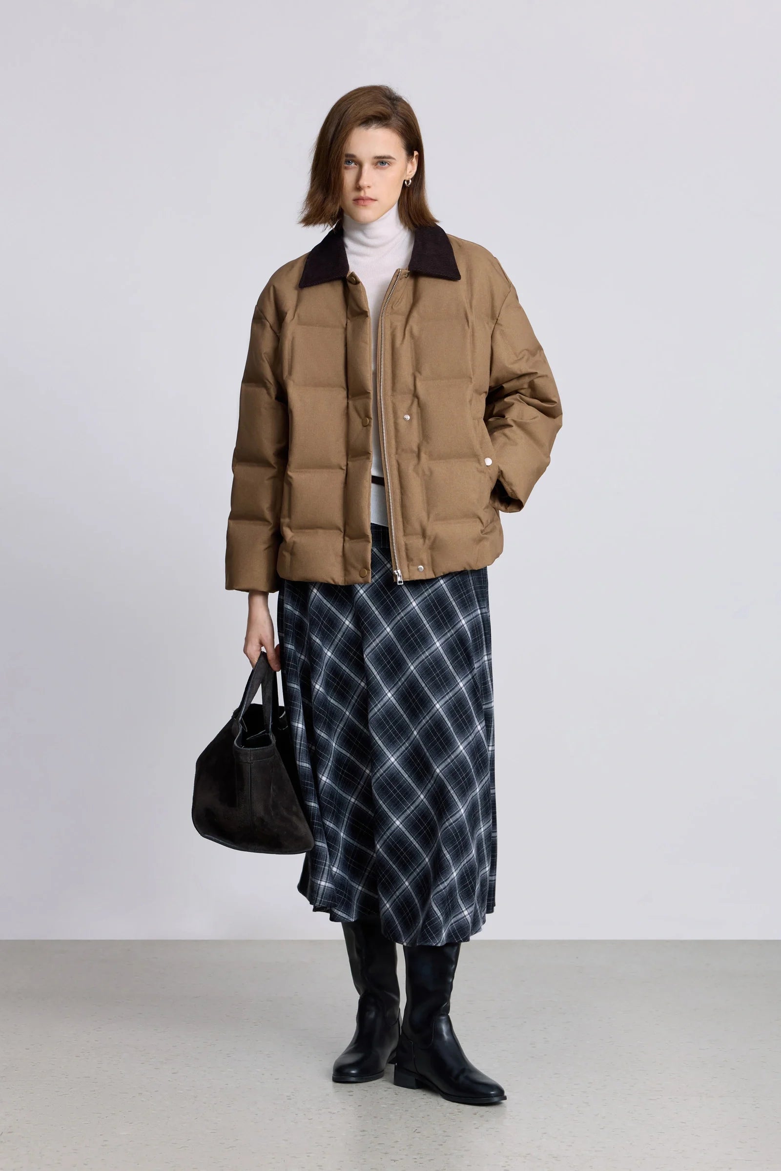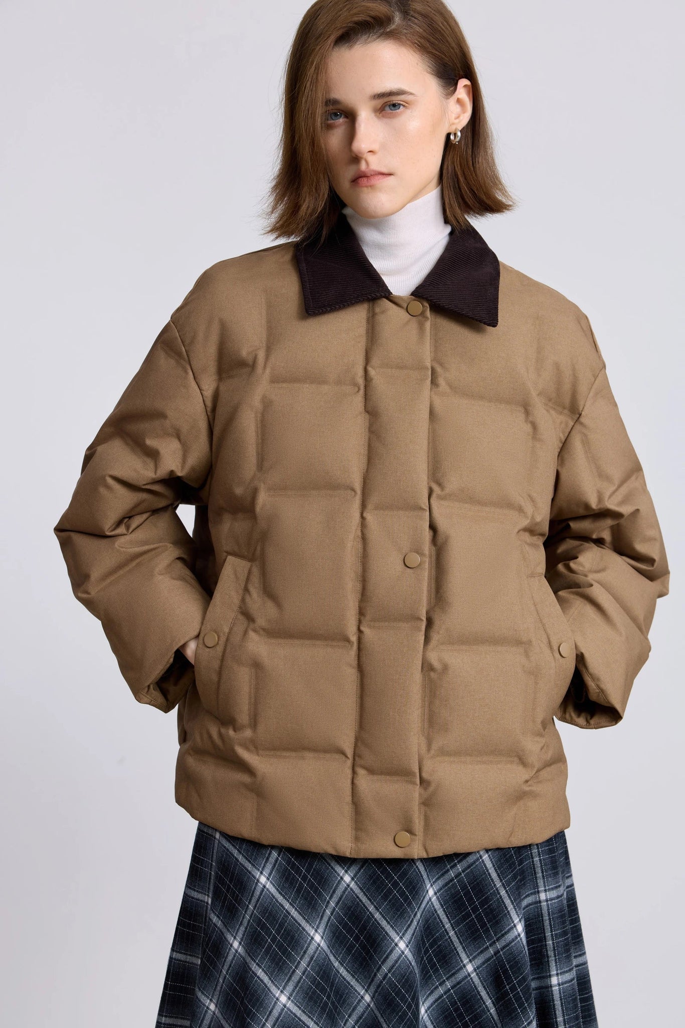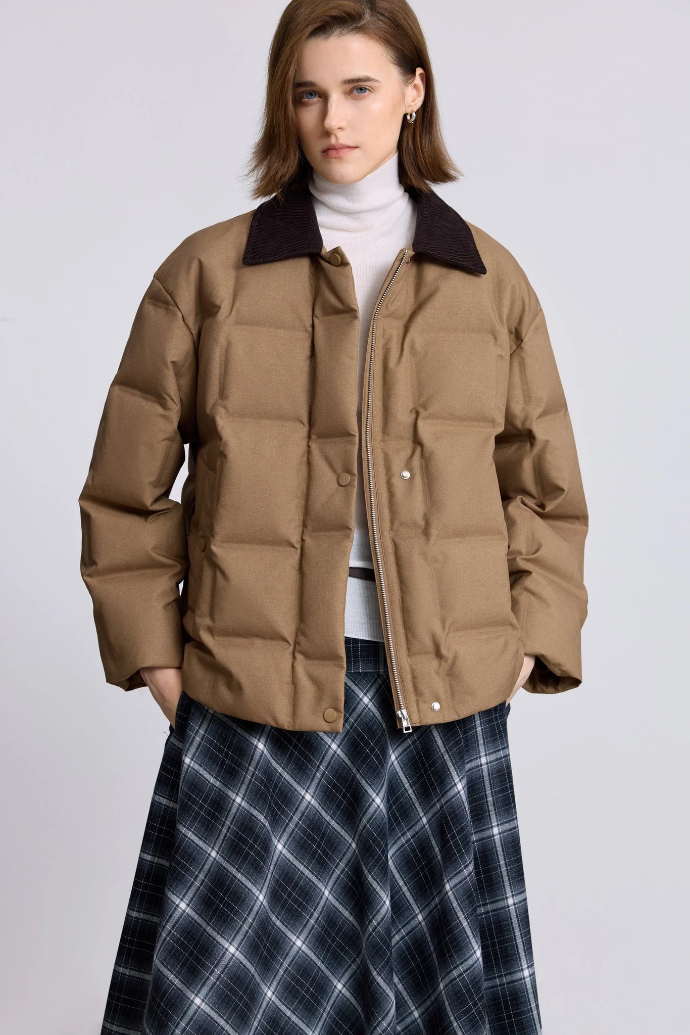 • Contrast lapel down jacket—a confident choice for a retro-modern look