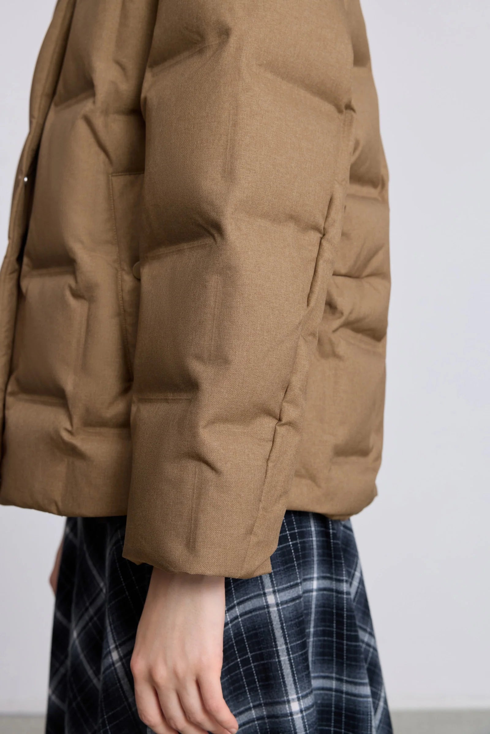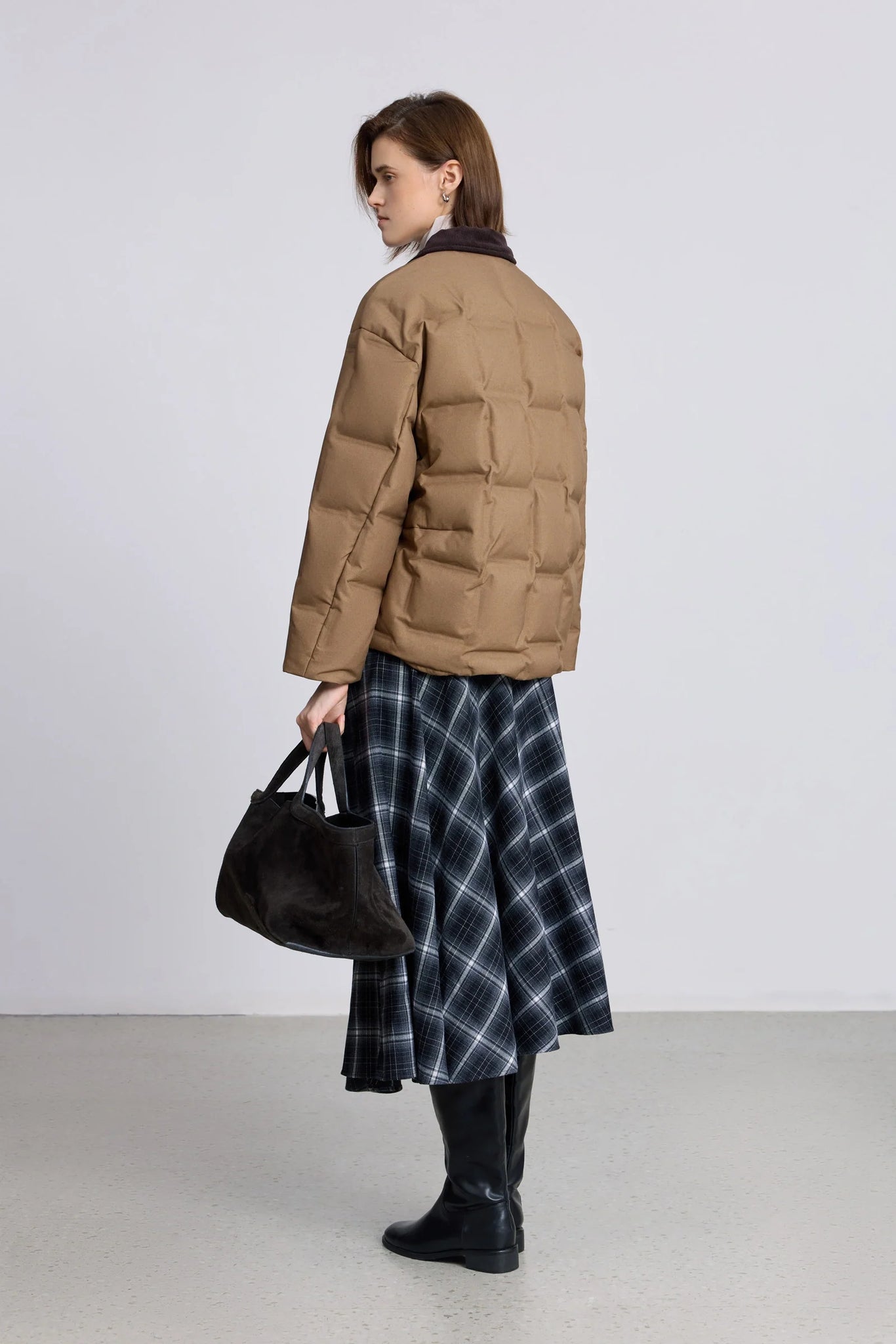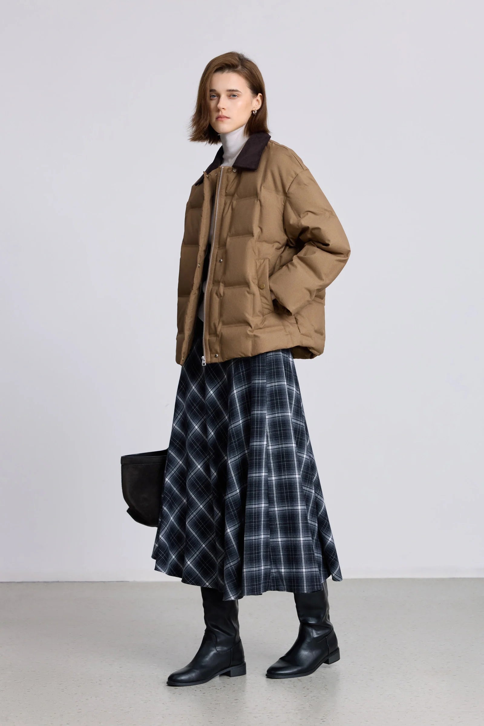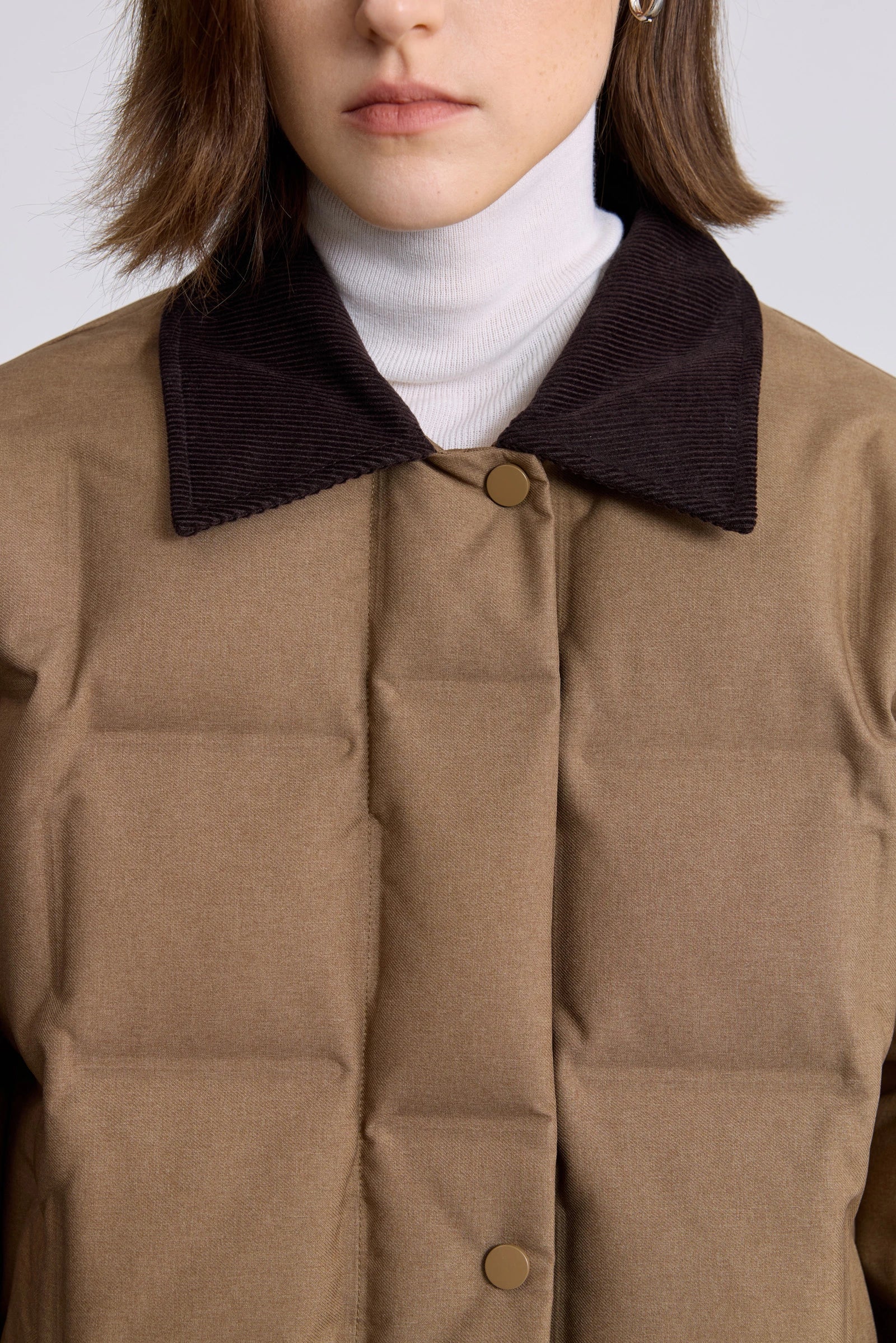 • Contrast lapel down jacket—a confident choice for a retro-modern look