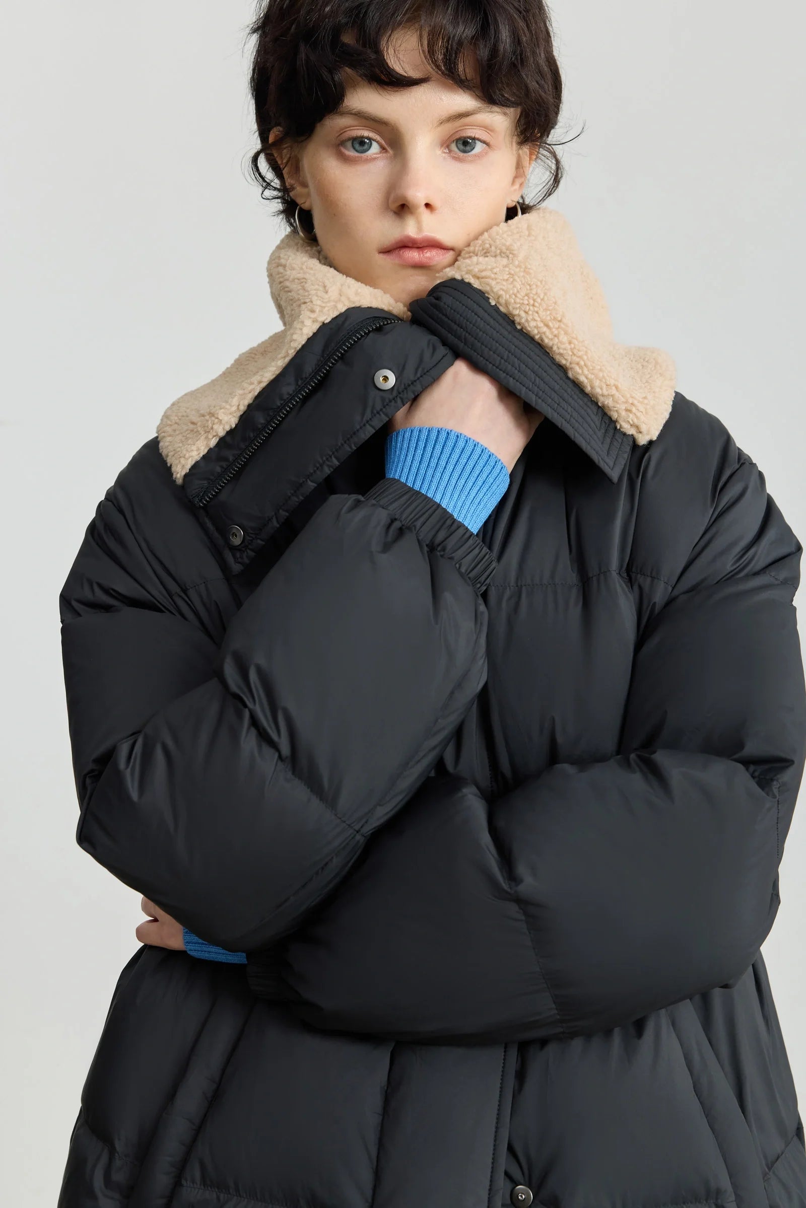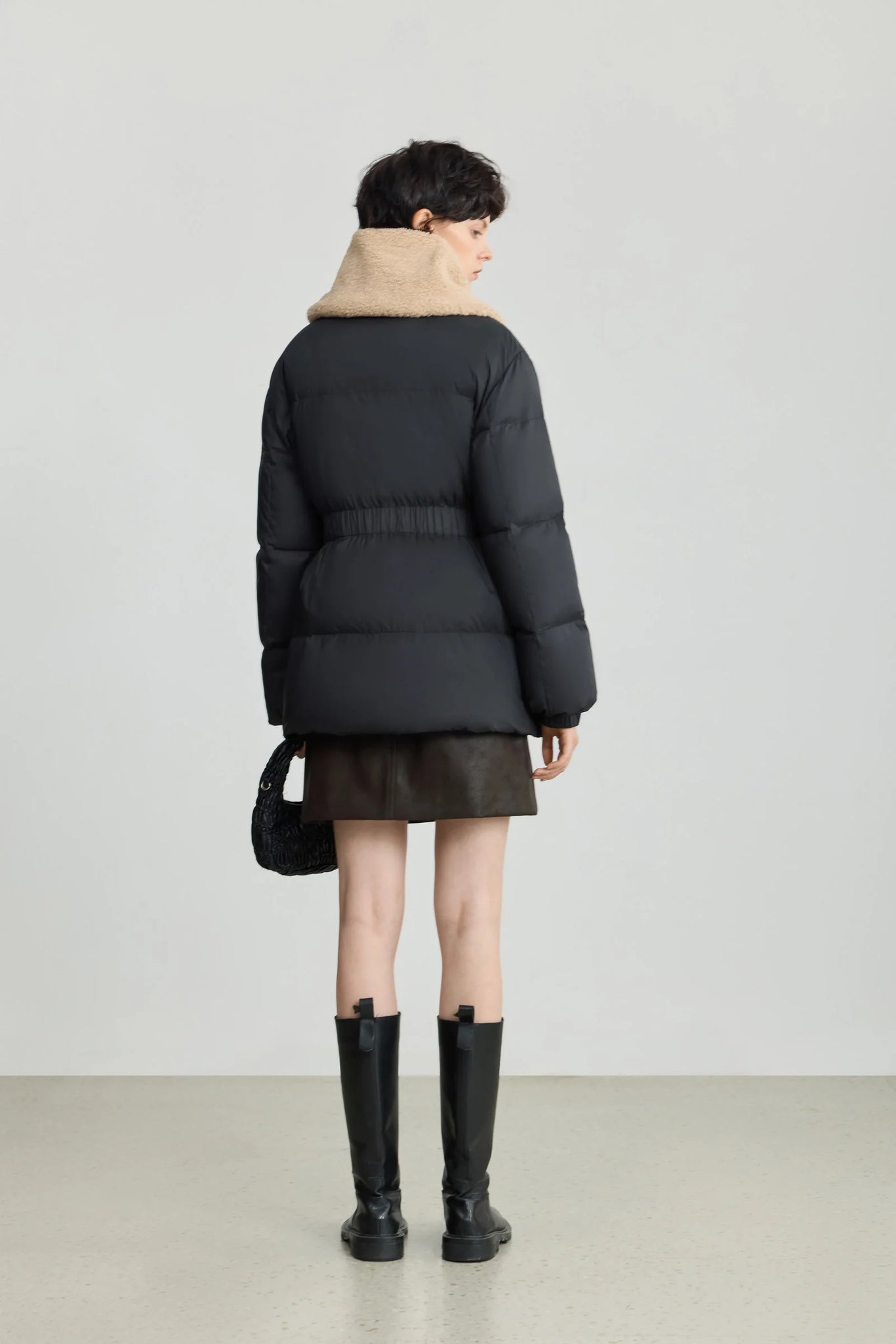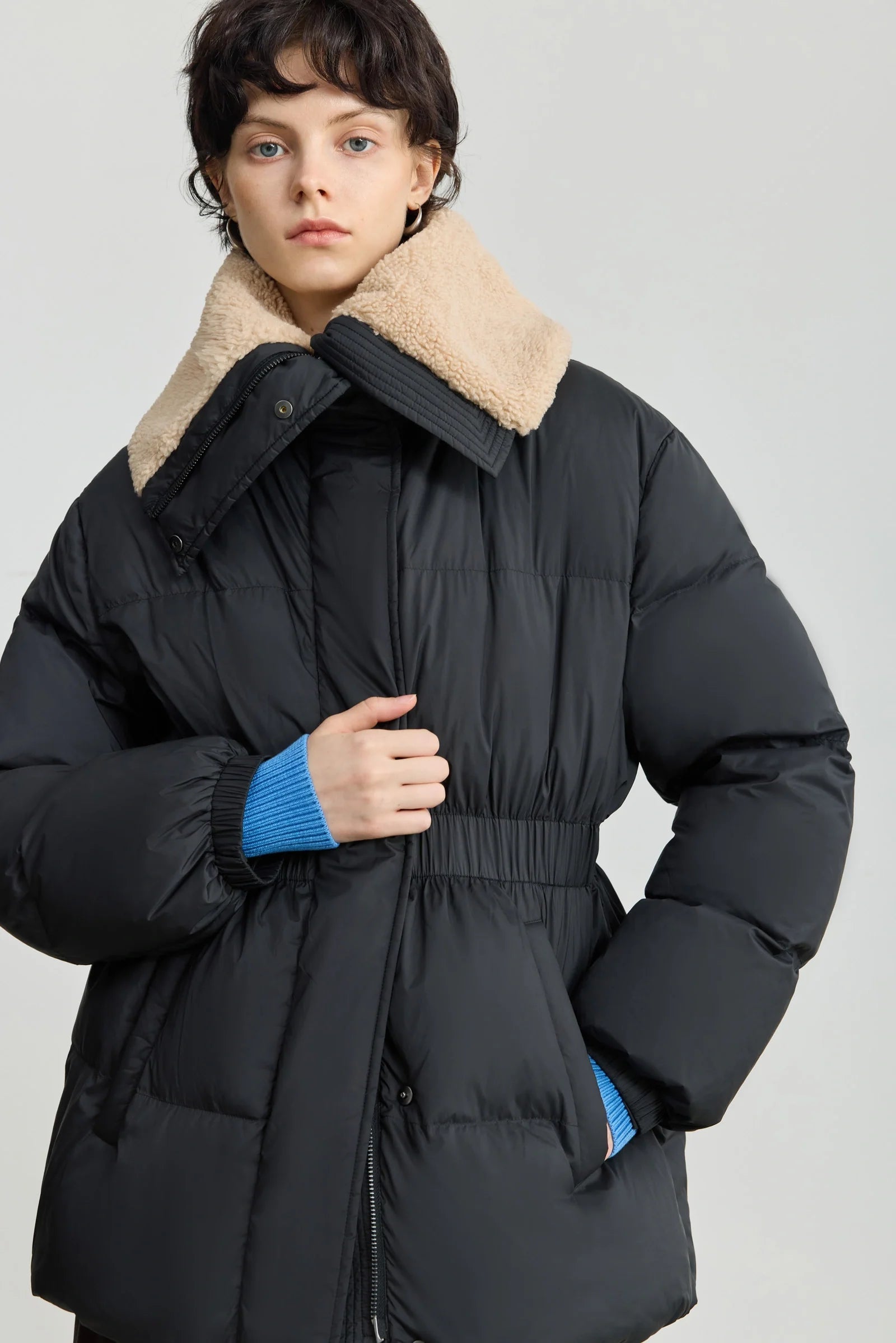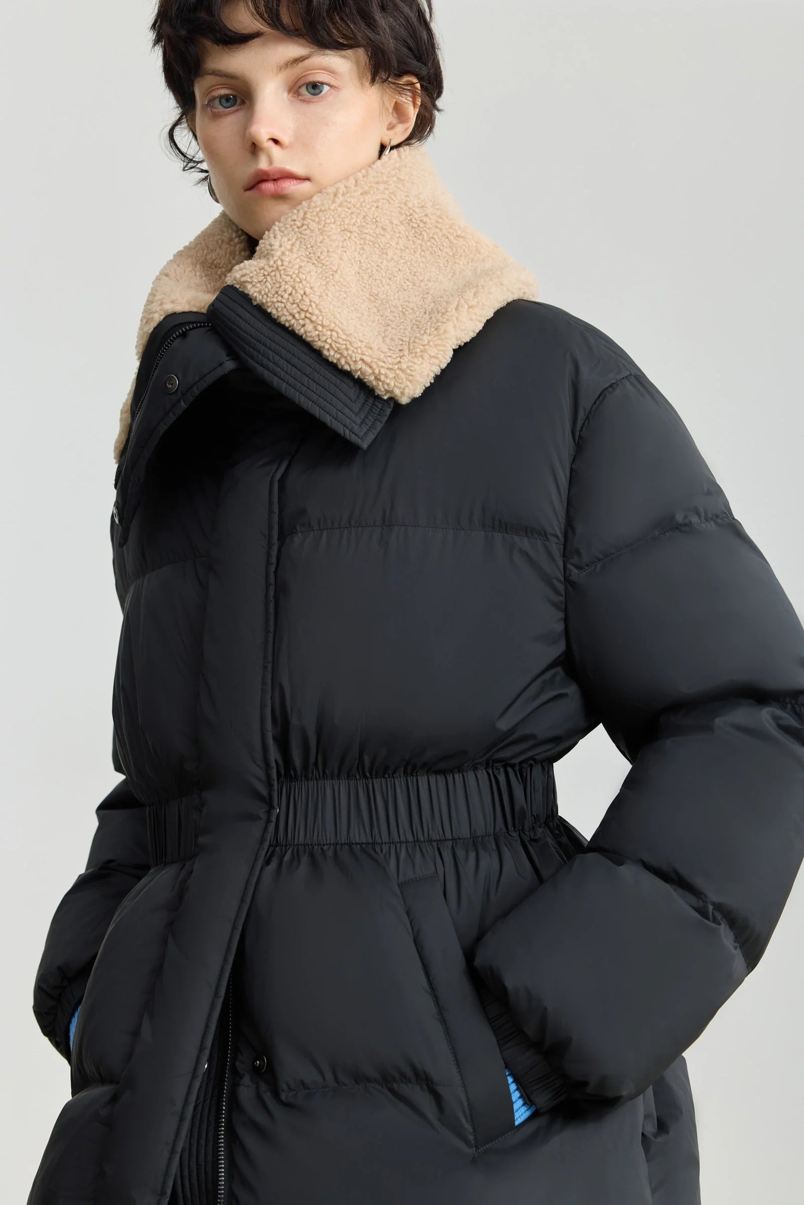 The large lapel features contrasting colors for a distinct layering, while fine plush adds a soft touch to the crisp silhouette, balancing rationality with warmth. The fitted waist enhances the proportions, while the practical pockets create a warm, practical design, creating a winter-ready experience that combines both beauty and strength.