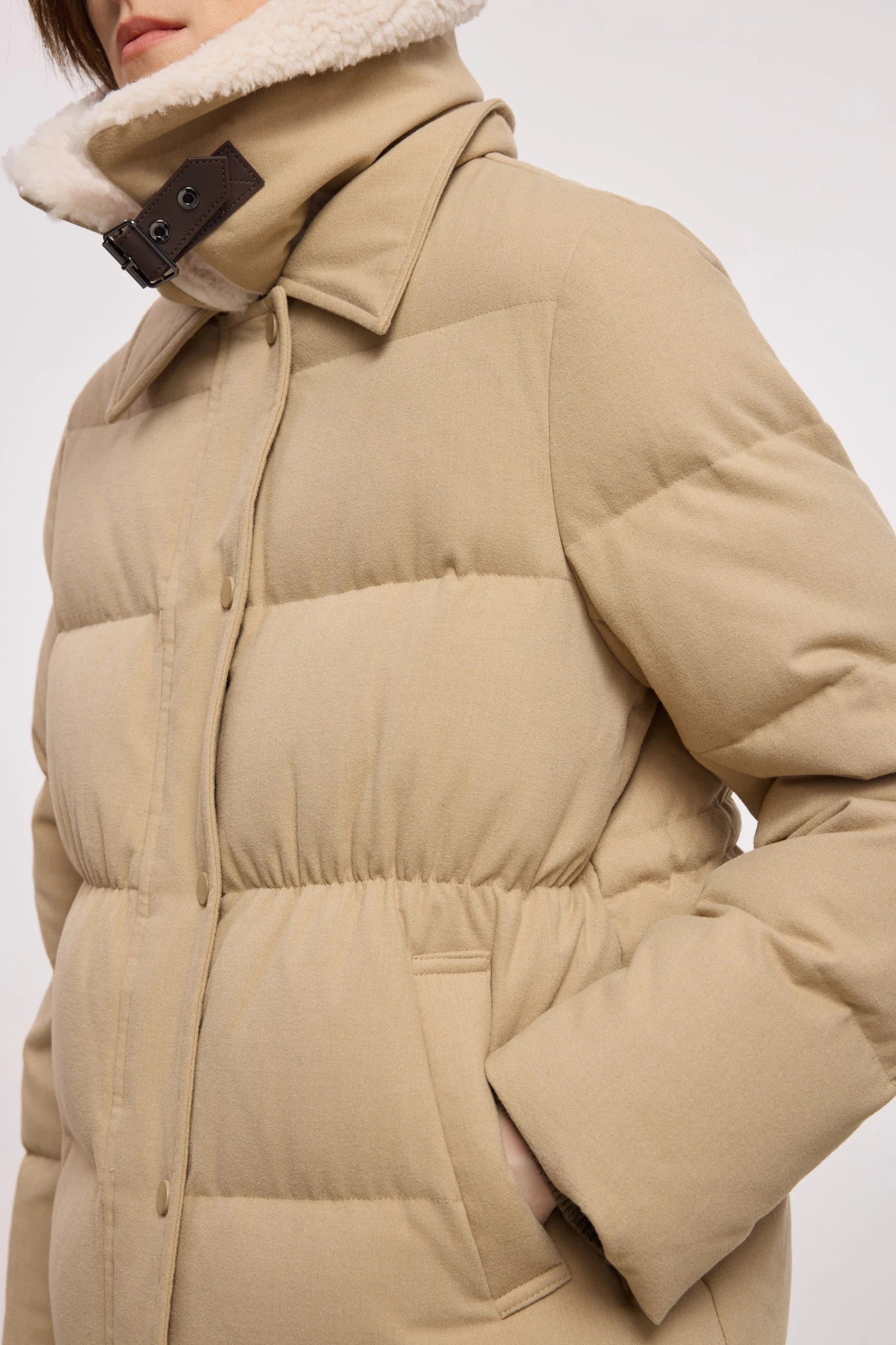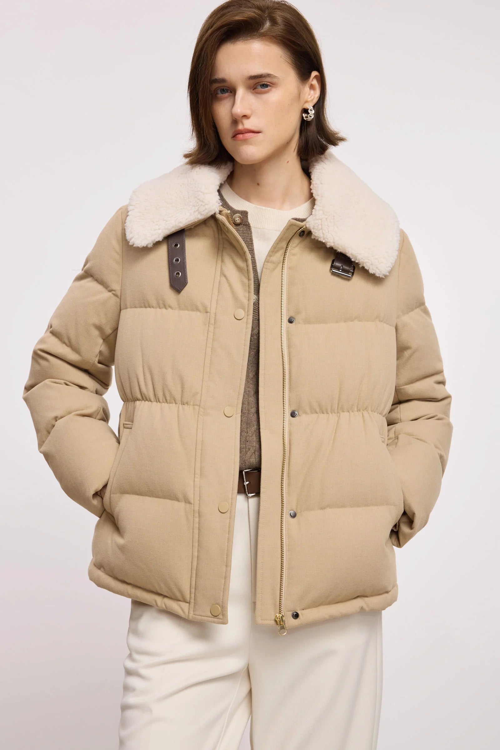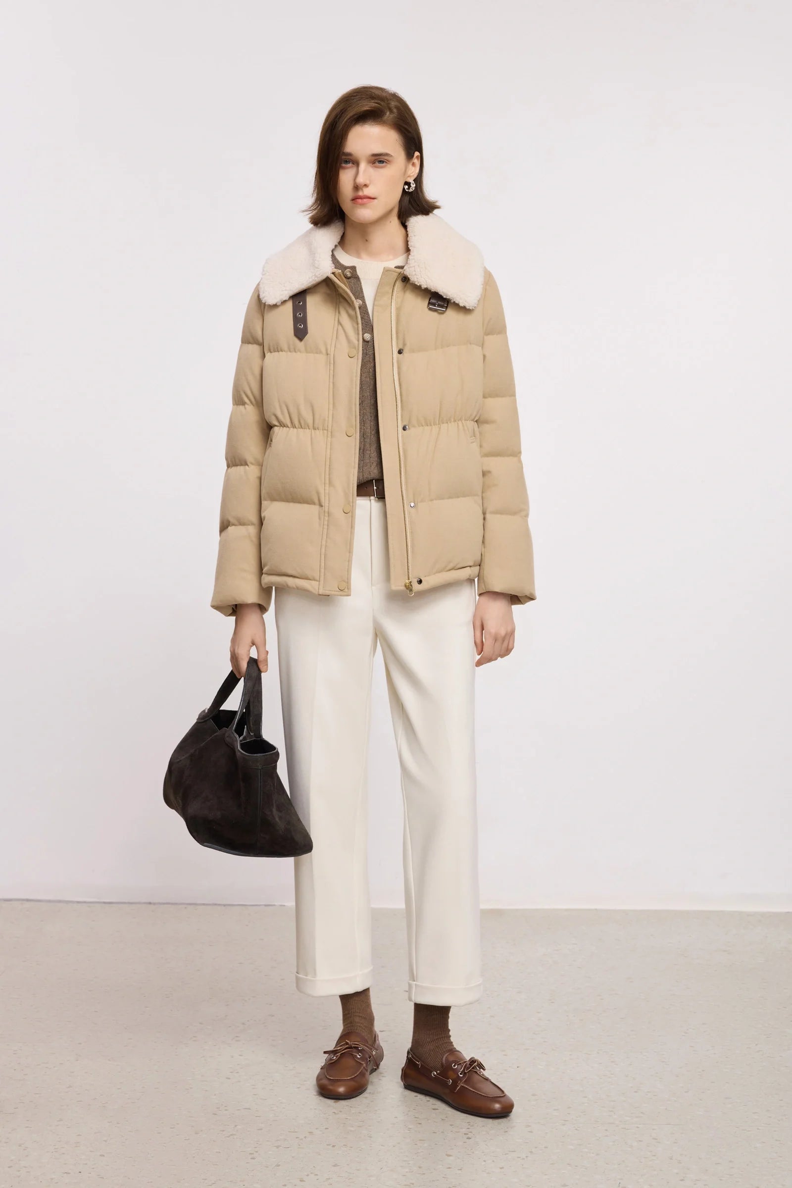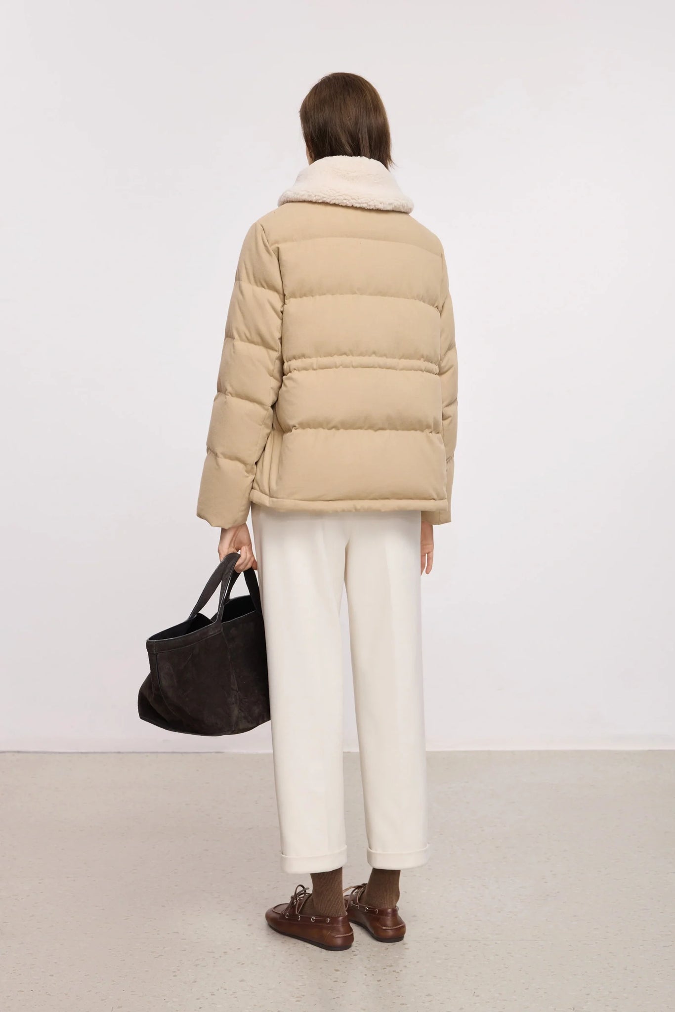 The slightly loose fit of the down jacket creates a crisp silhouette, allowing for comfortable wear while maintaining a sharp, refined look. The fur-red lapel adds a touch of warmth to the winter, while its soft touch enhances overall comfort. The collar and striped details enhance the layered feel, giving the down jacket a refined touch.