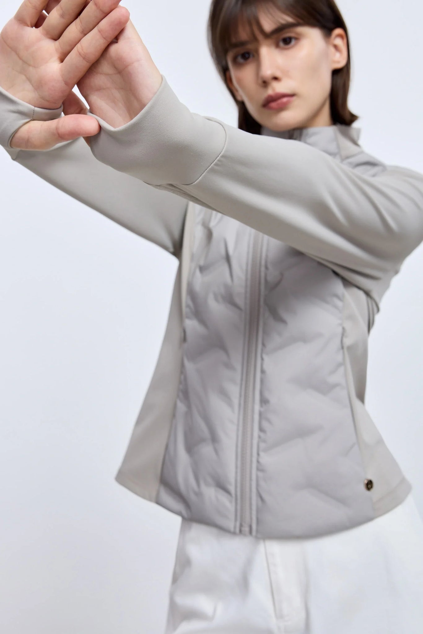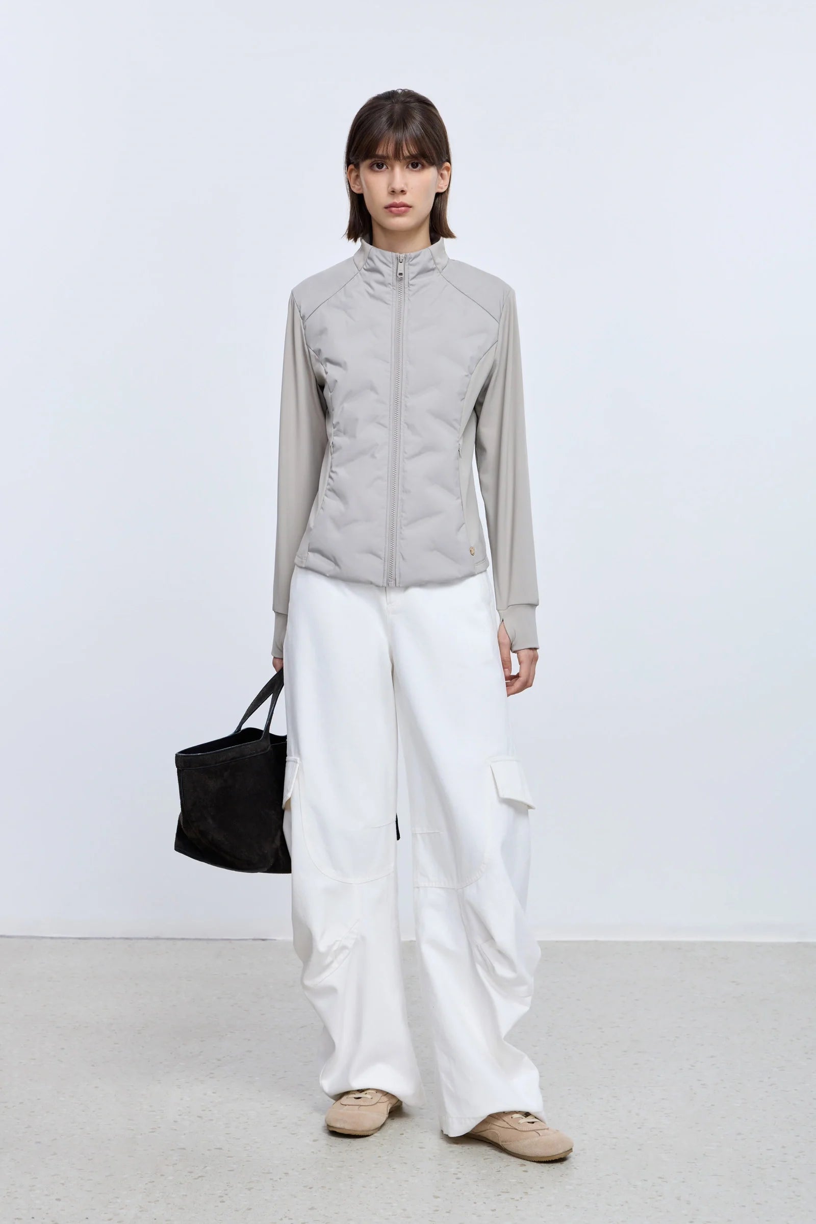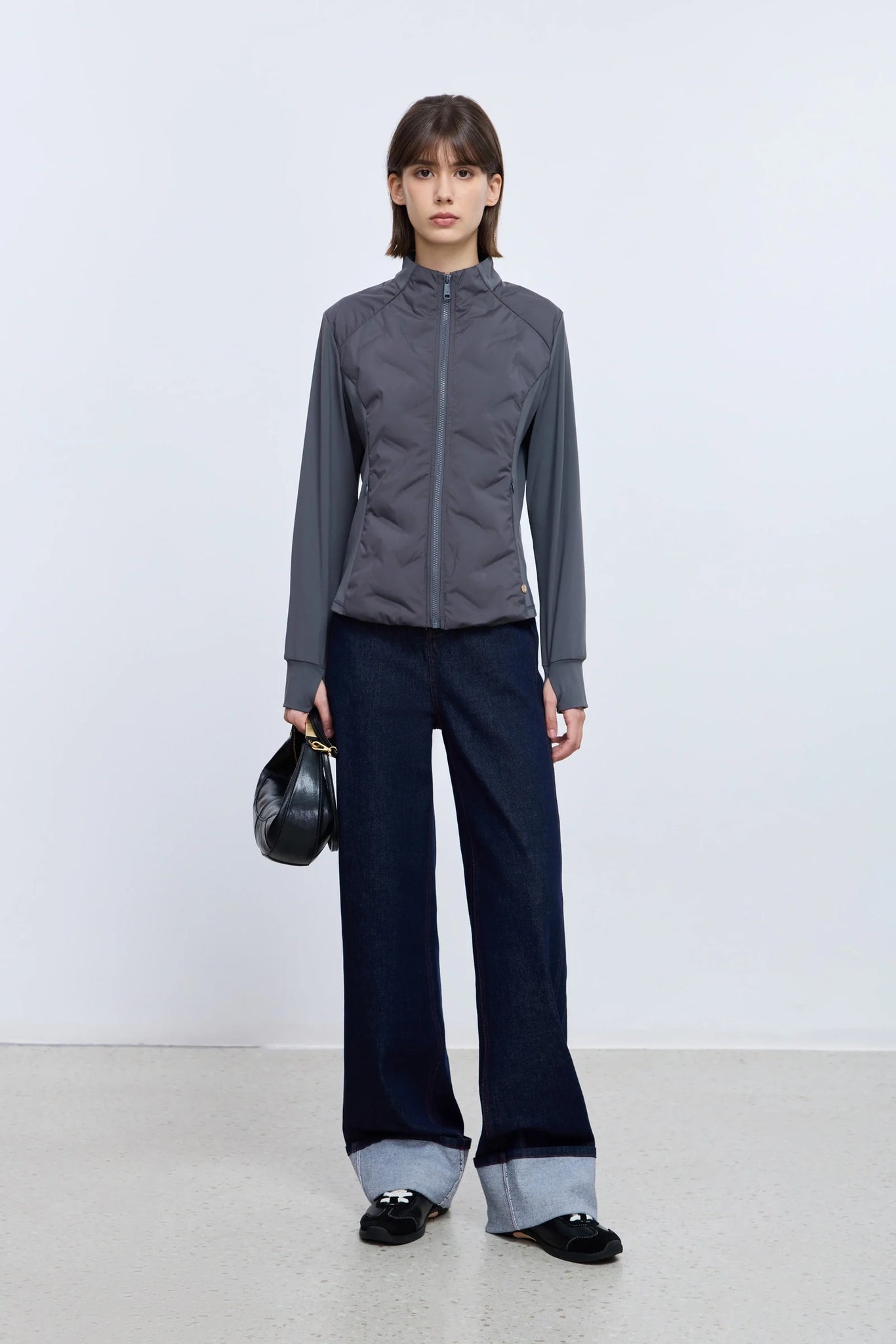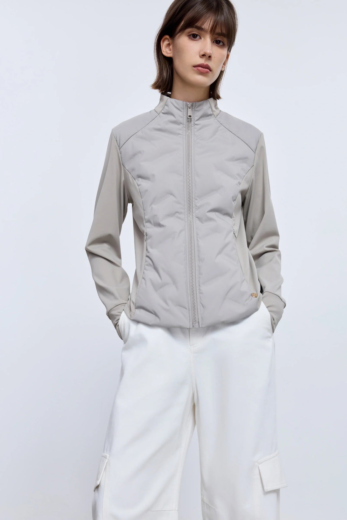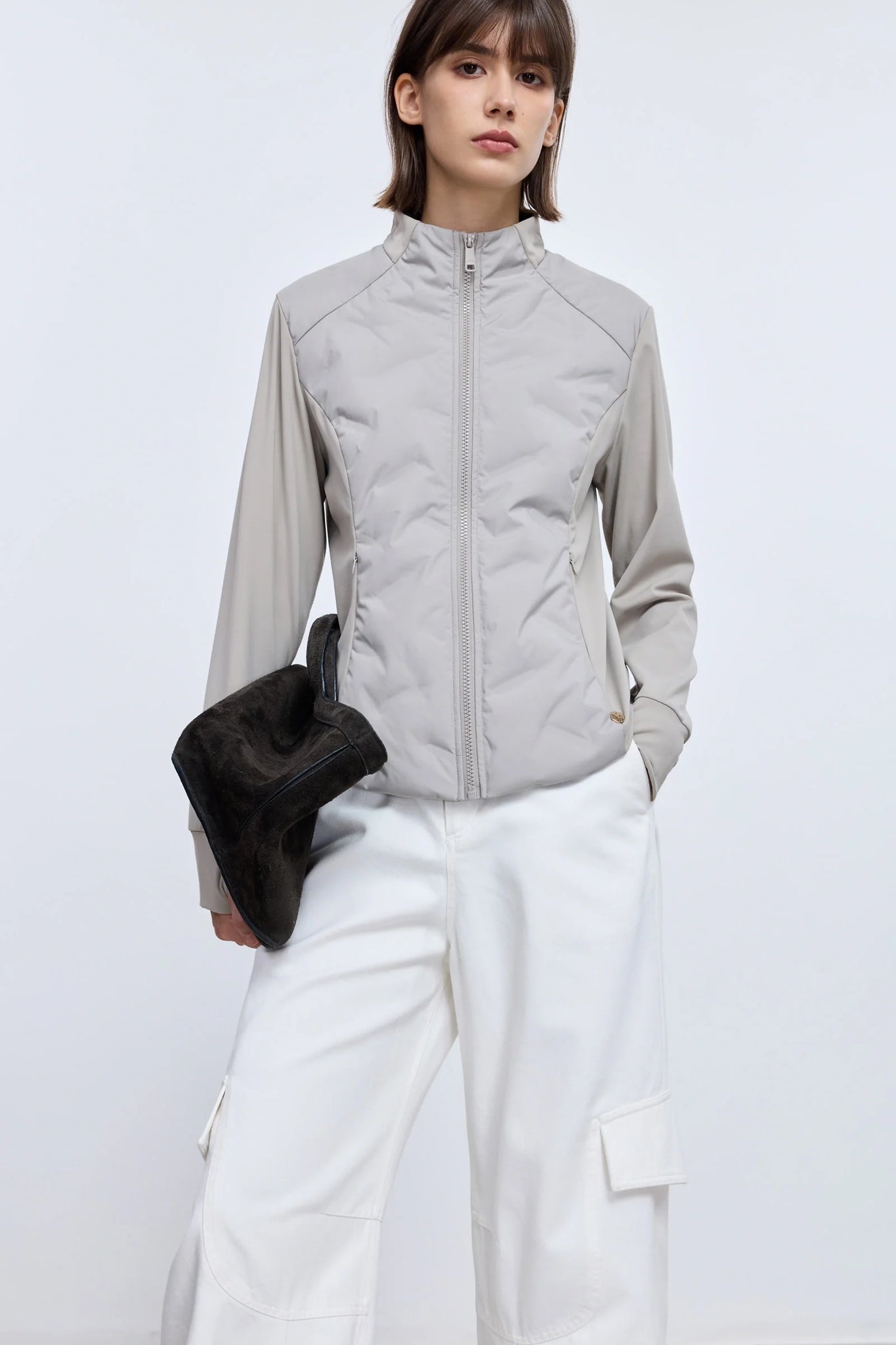The goose down filling imbues the down jacket with lightness and warmth. It's easy to pack and carry around without any burden, creating a comfortable, "nothing" experience. The slim silhouette, combined with a small stand-up collar, creates a clean, streamlined look that exudes a sophisticated aura for the commuting woman. The patchwork design and three-dimensional cutting details optimize body proportions, allowing for a natural expression of style and practicality.