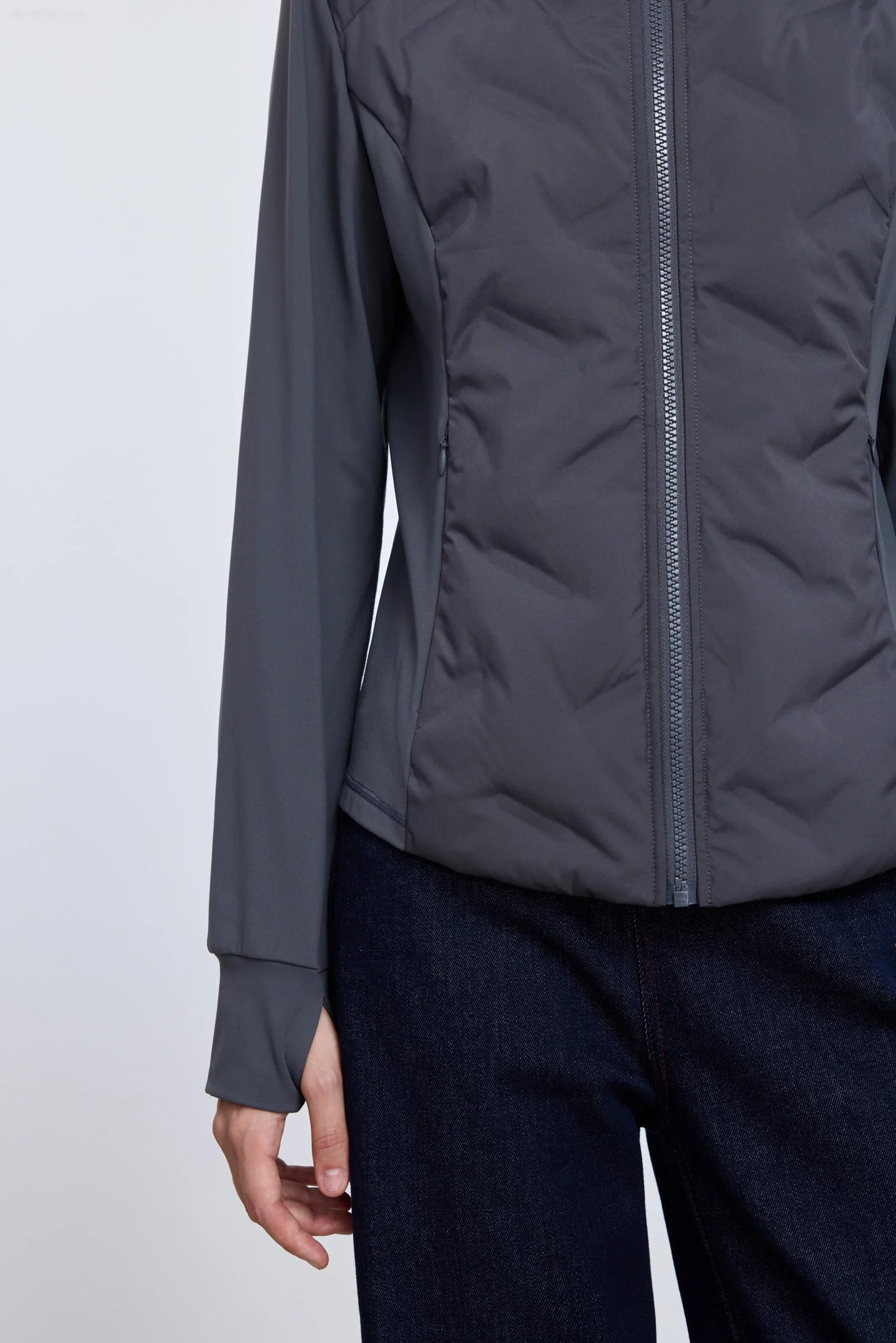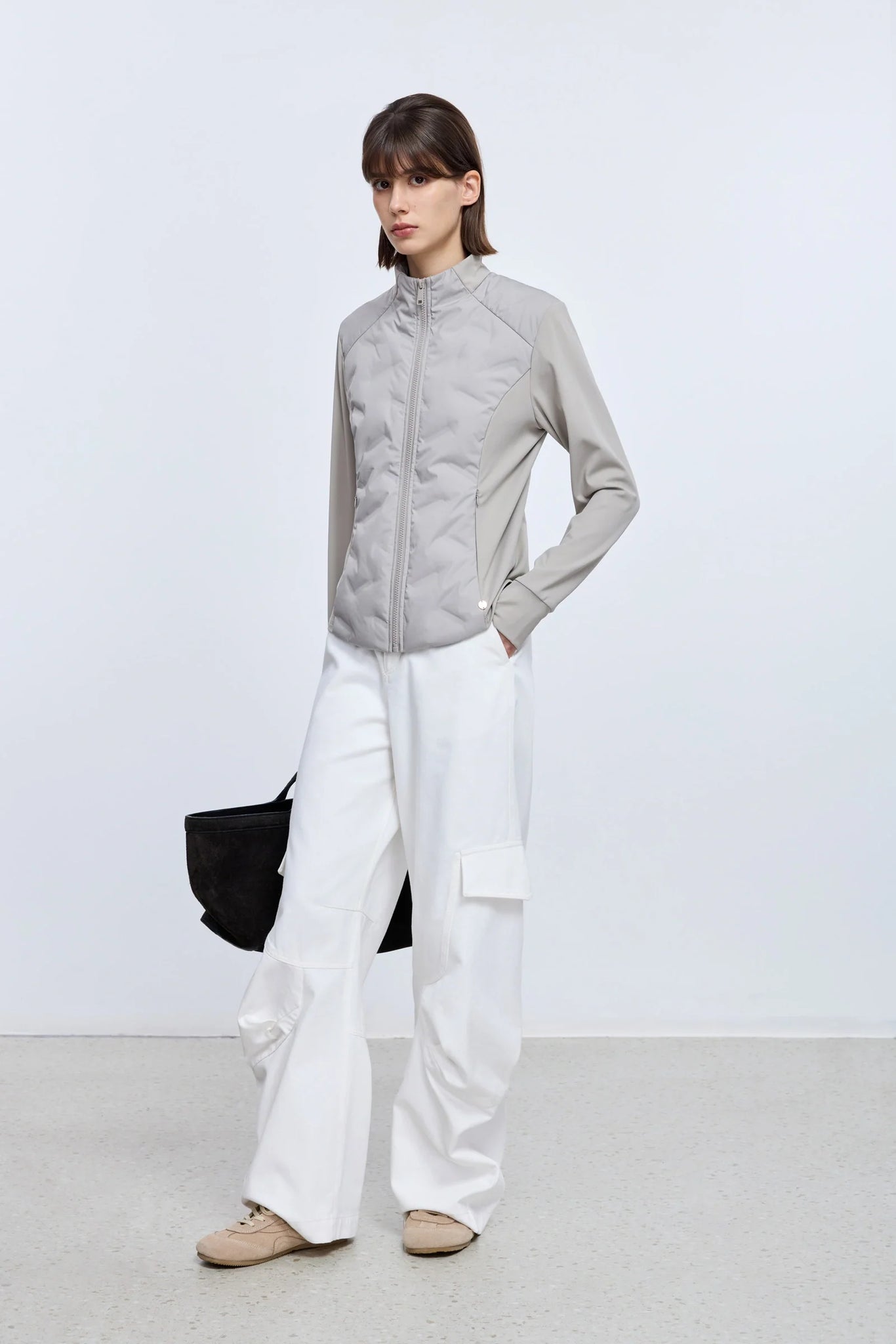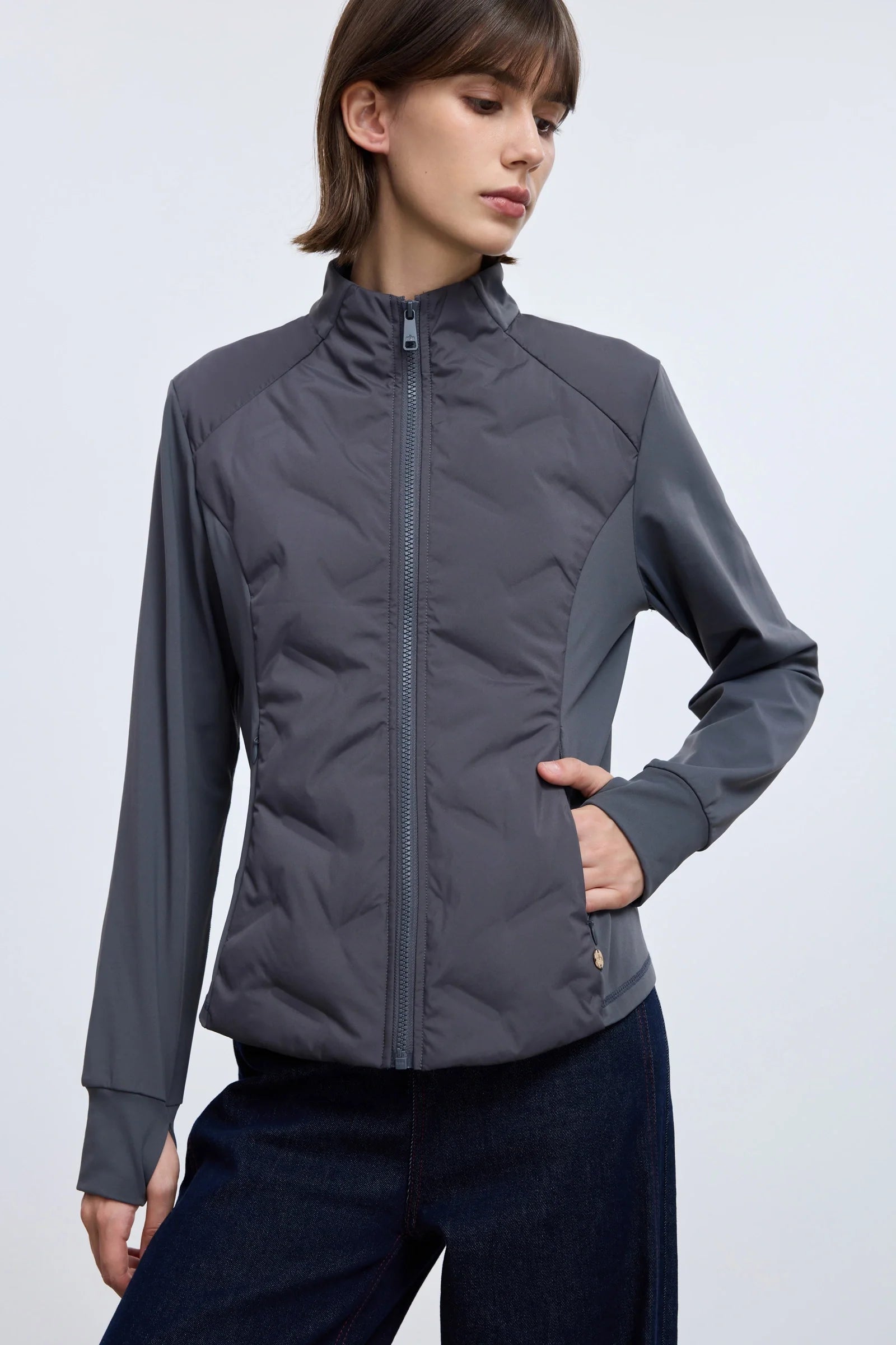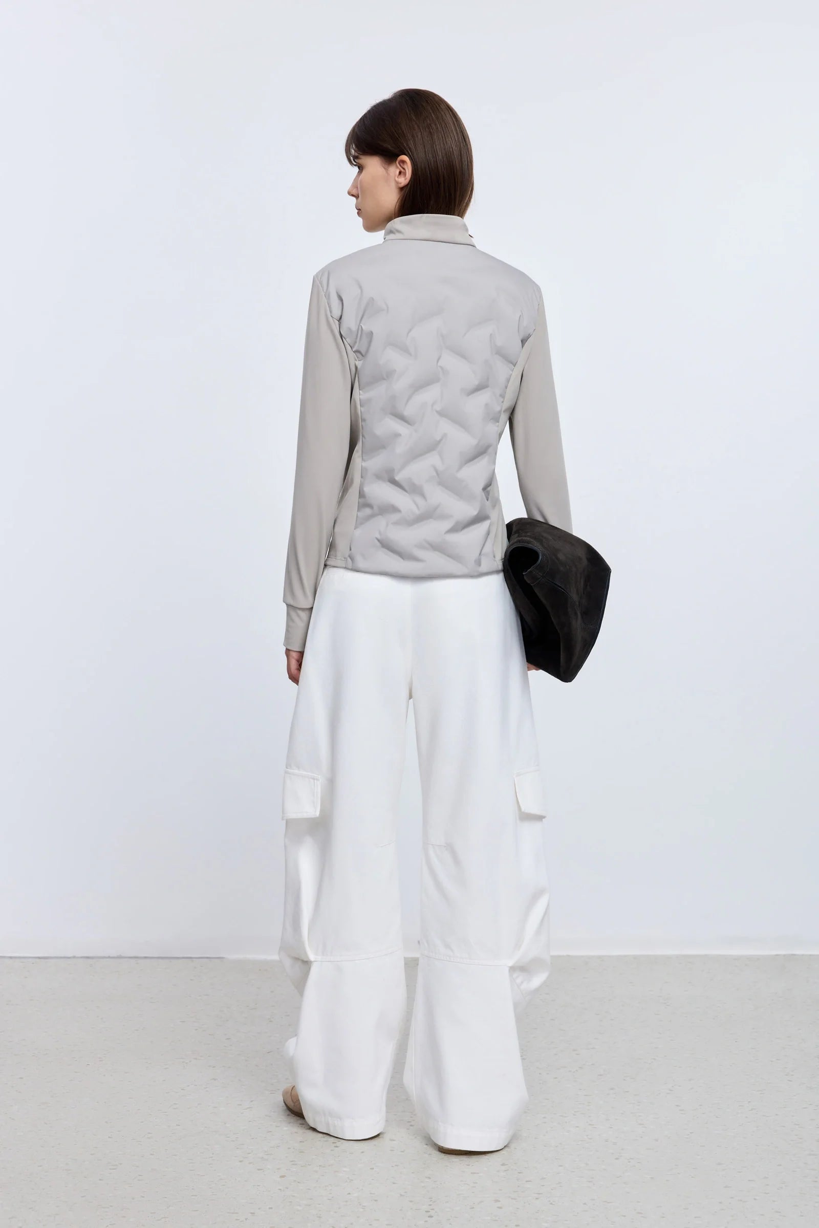 The goose down filling imbues the down jacket with lightness and warmth. It's easy to pack and carry around without any burden, creating a comfortable, "nothing" experience. The slim silhouette, combined with a small stand-up collar, creates a clean, streamlined look that exudes a sophisticated aura for the commuting woman. The patchwork design and three-dimensional cutting details optimize body proportions, allowing for a natural expression of style and practicality.
