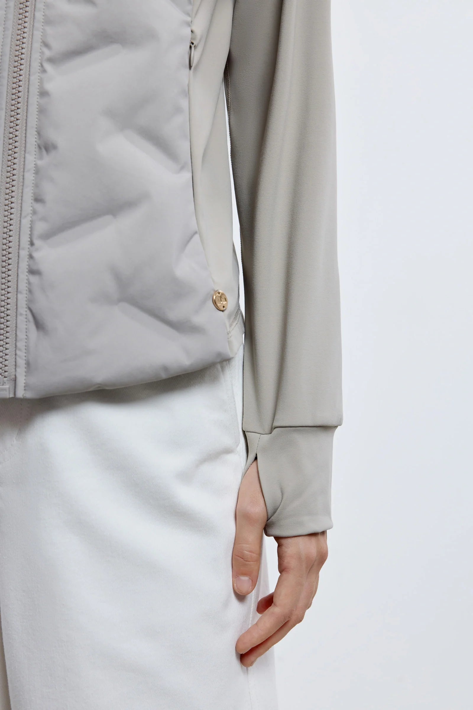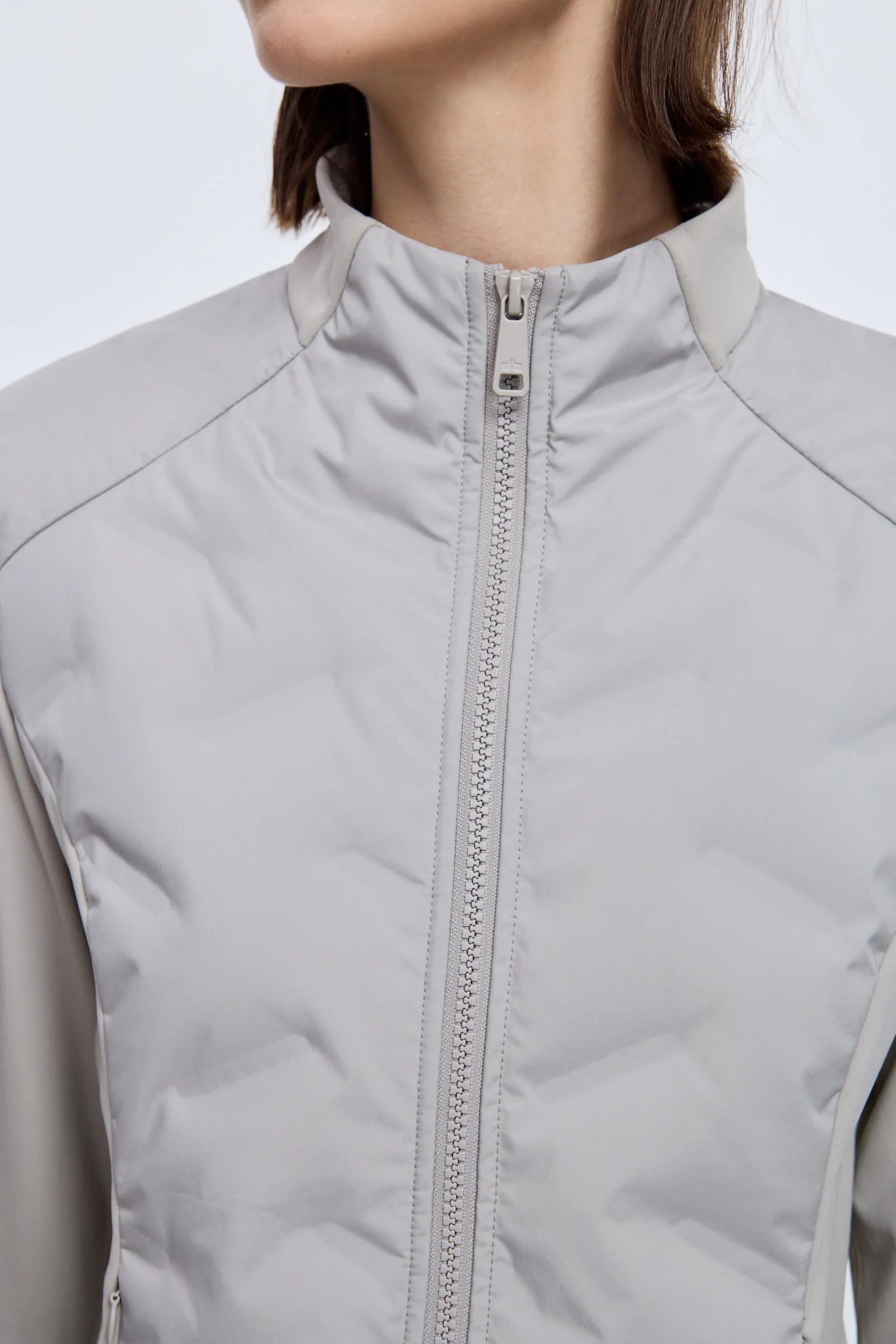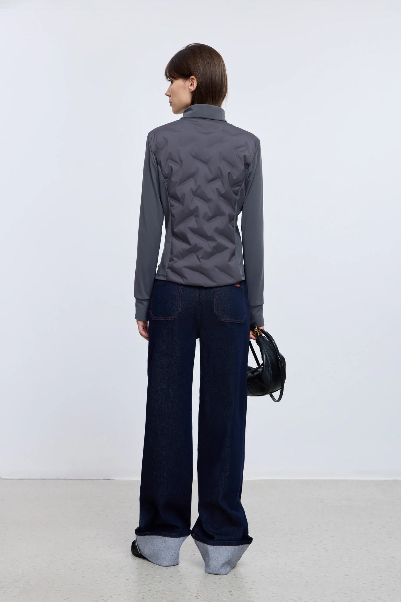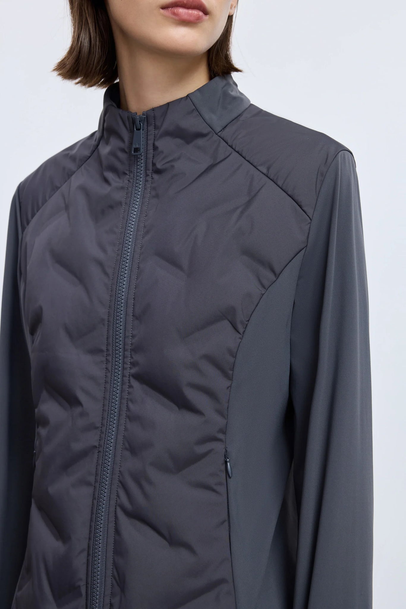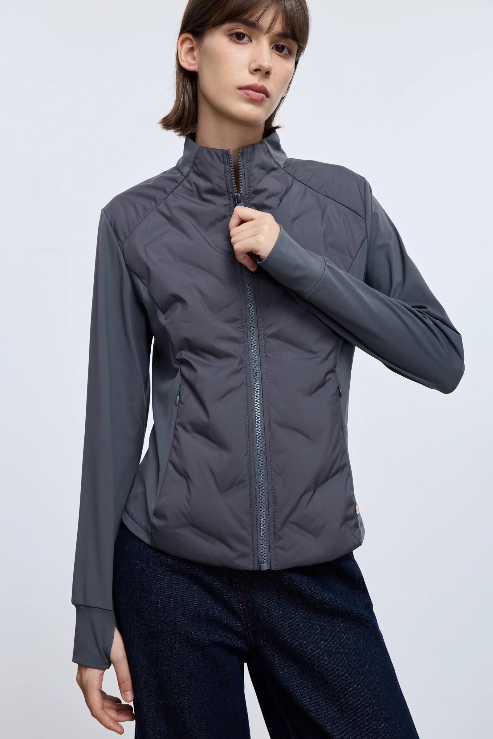 The goose down filling imbues the down jacket with lightness and warmth. It's easy to pack and carry around without any burden, creating a comfortable, "nothing" experience. The slim silhouette, combined with a small stand-up collar, creates a clean, streamlined look that exudes a sophisticated aura for the commuting woman. The patchwork design and three-dimensional cutting details optimize body proportions, allowing for a natural expression of style and practicality.