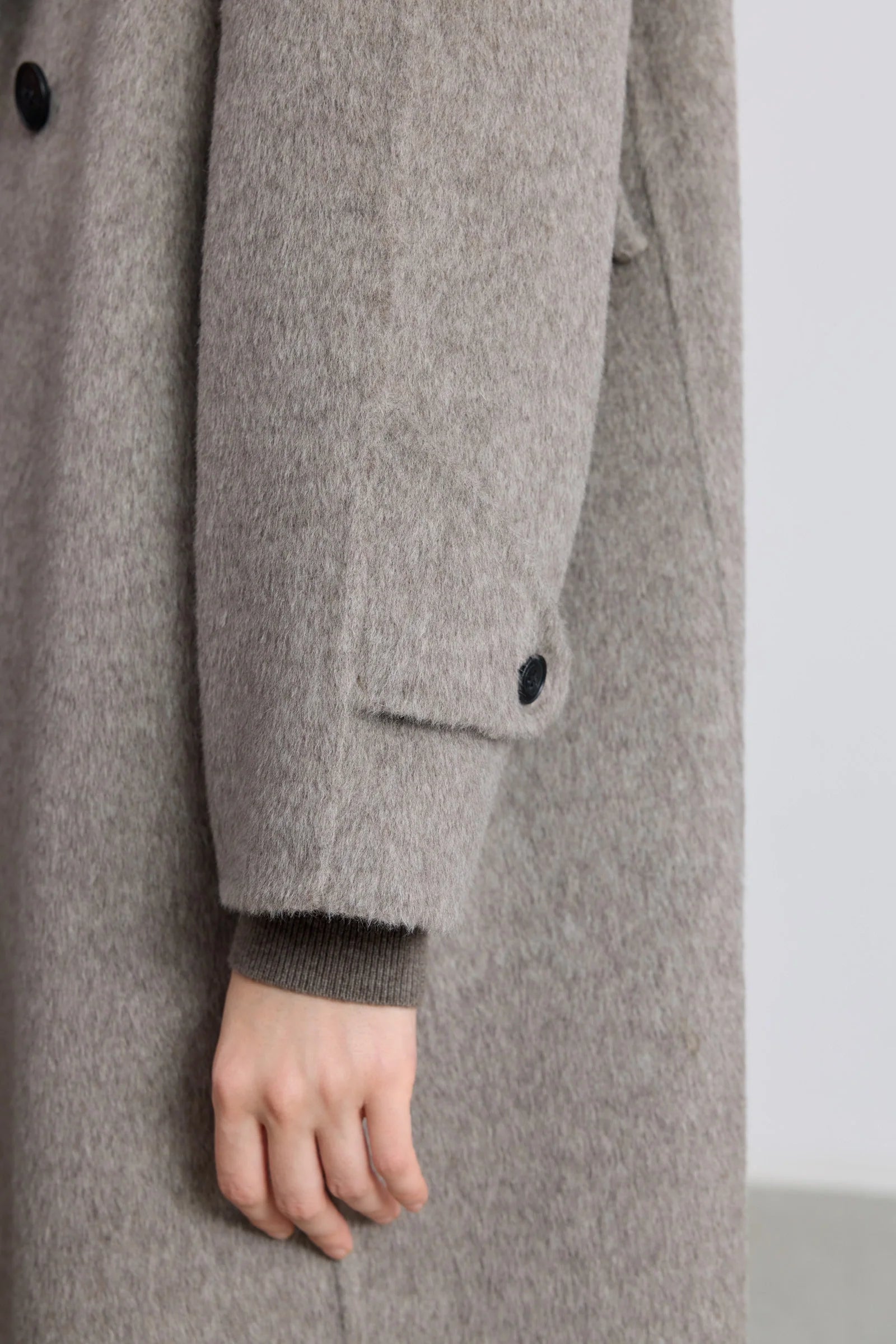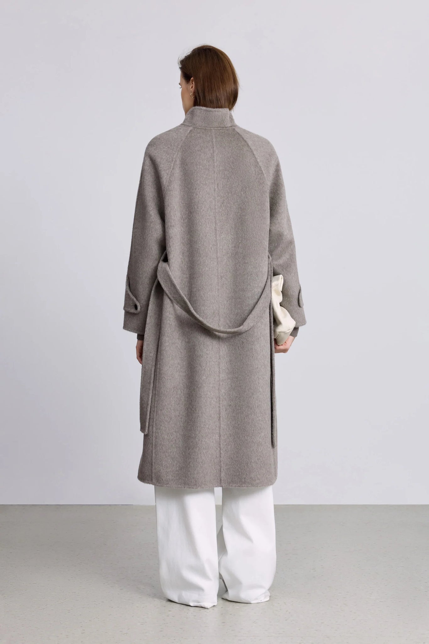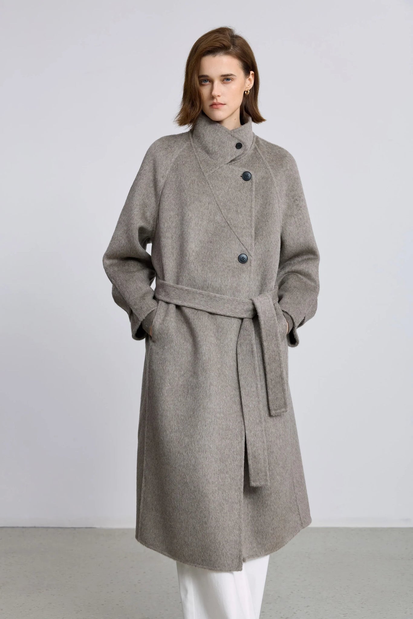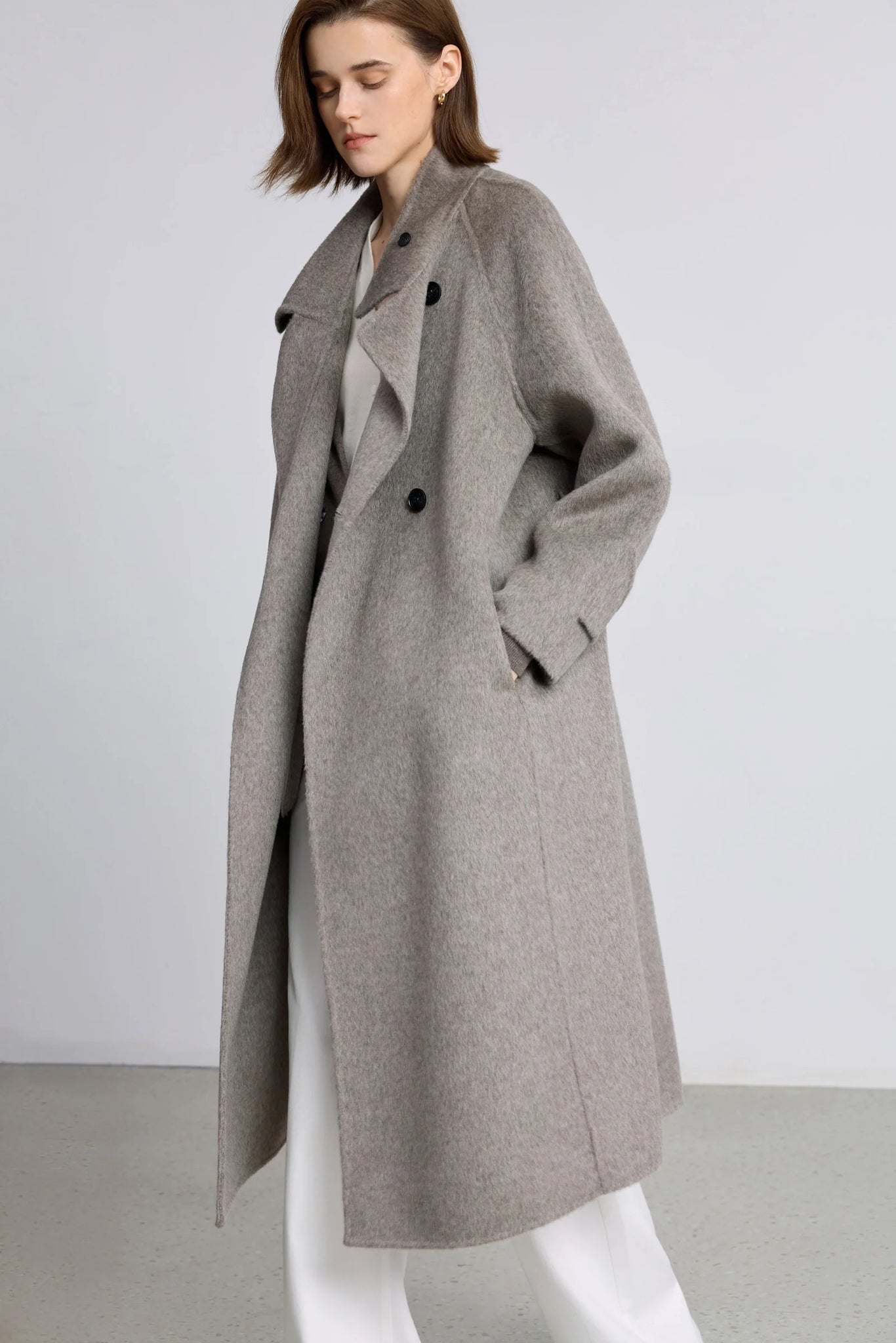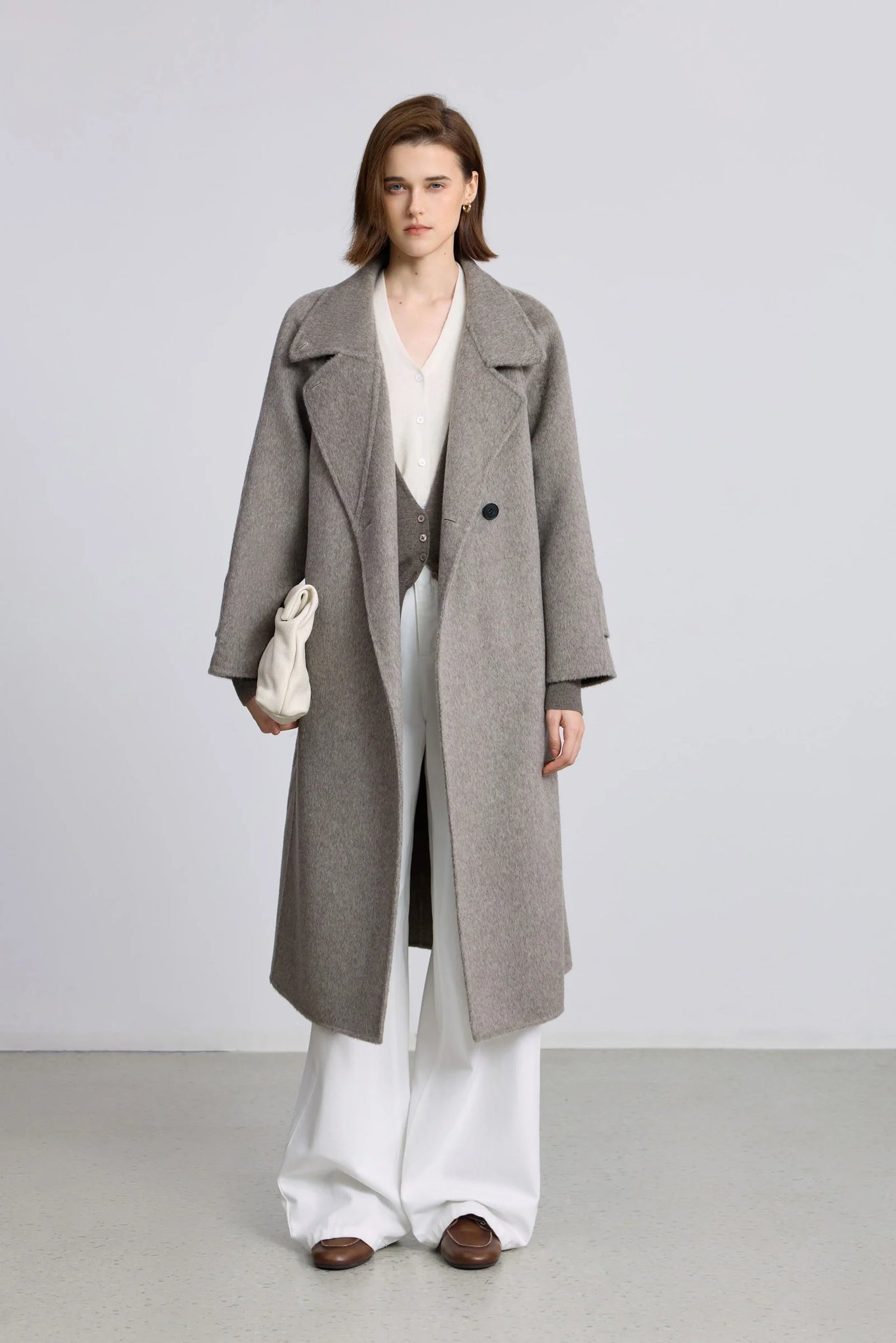 • Double-faced wool coat – Long, structured, and slim-fitting.