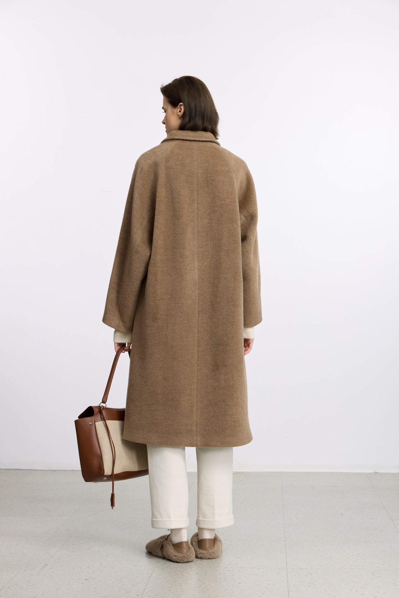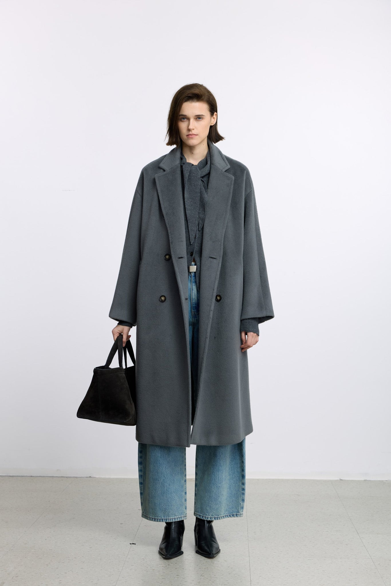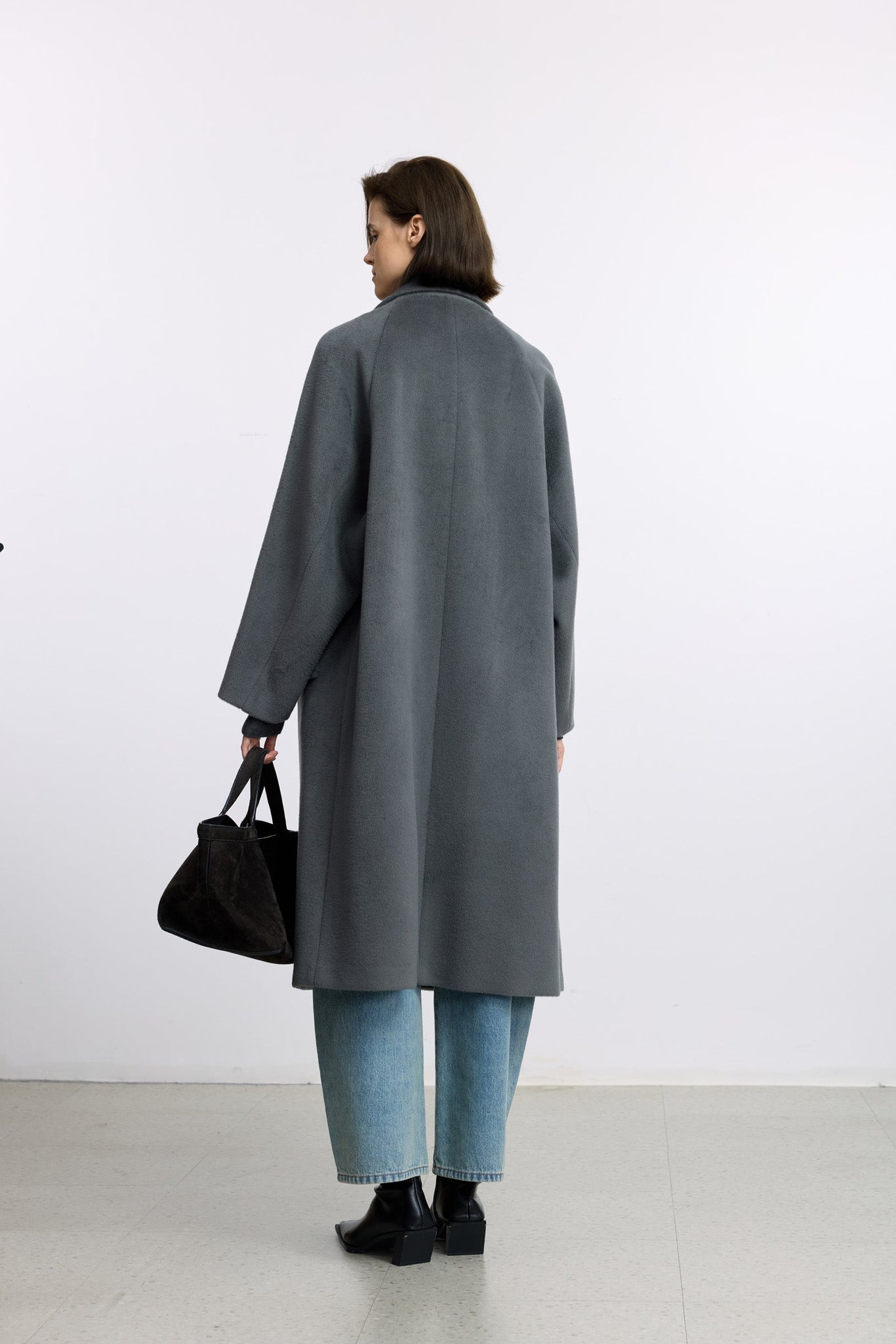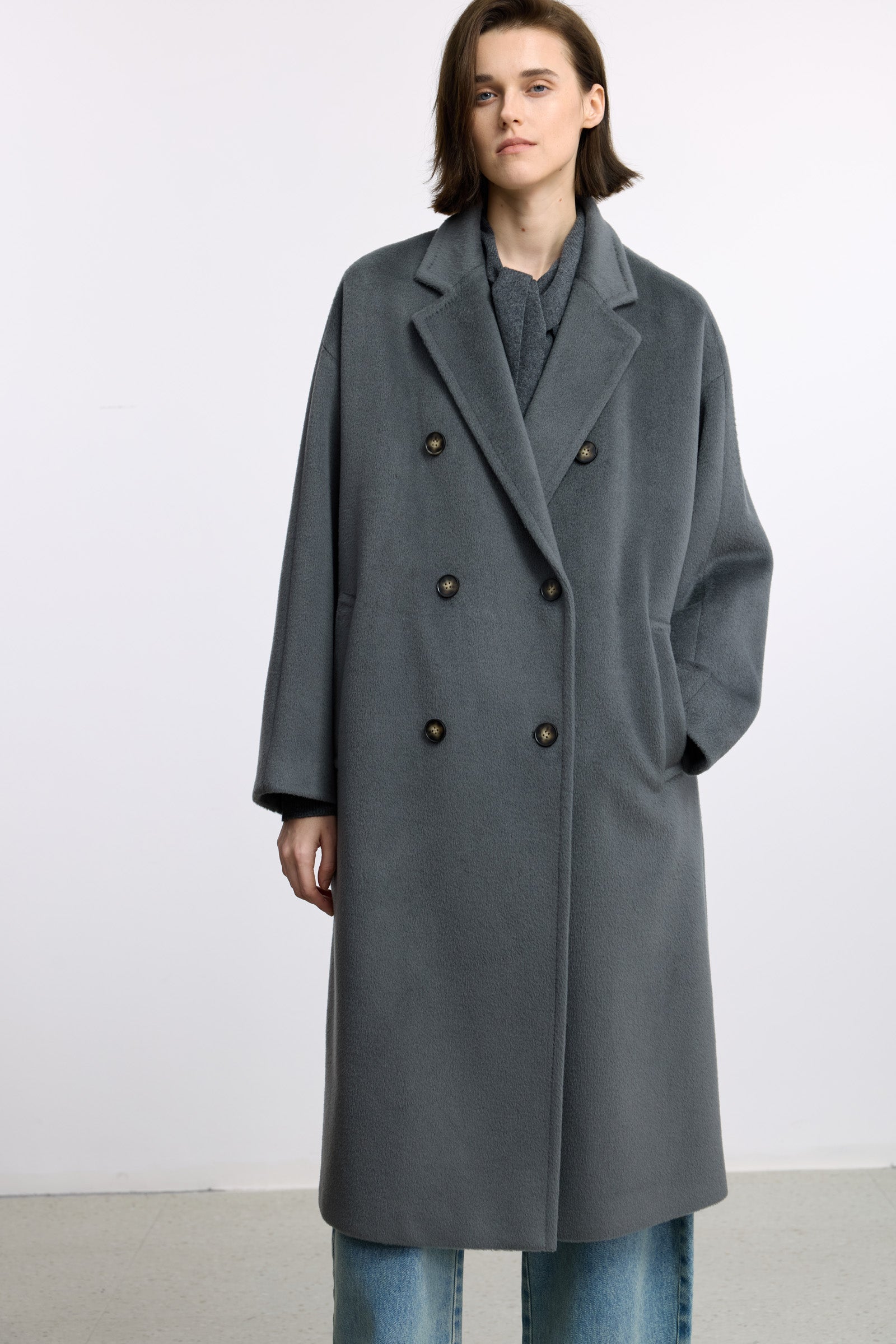 The flat collar and double-breasted construction create a classic coat silhouette, emphasizing a sense of calm and strength.