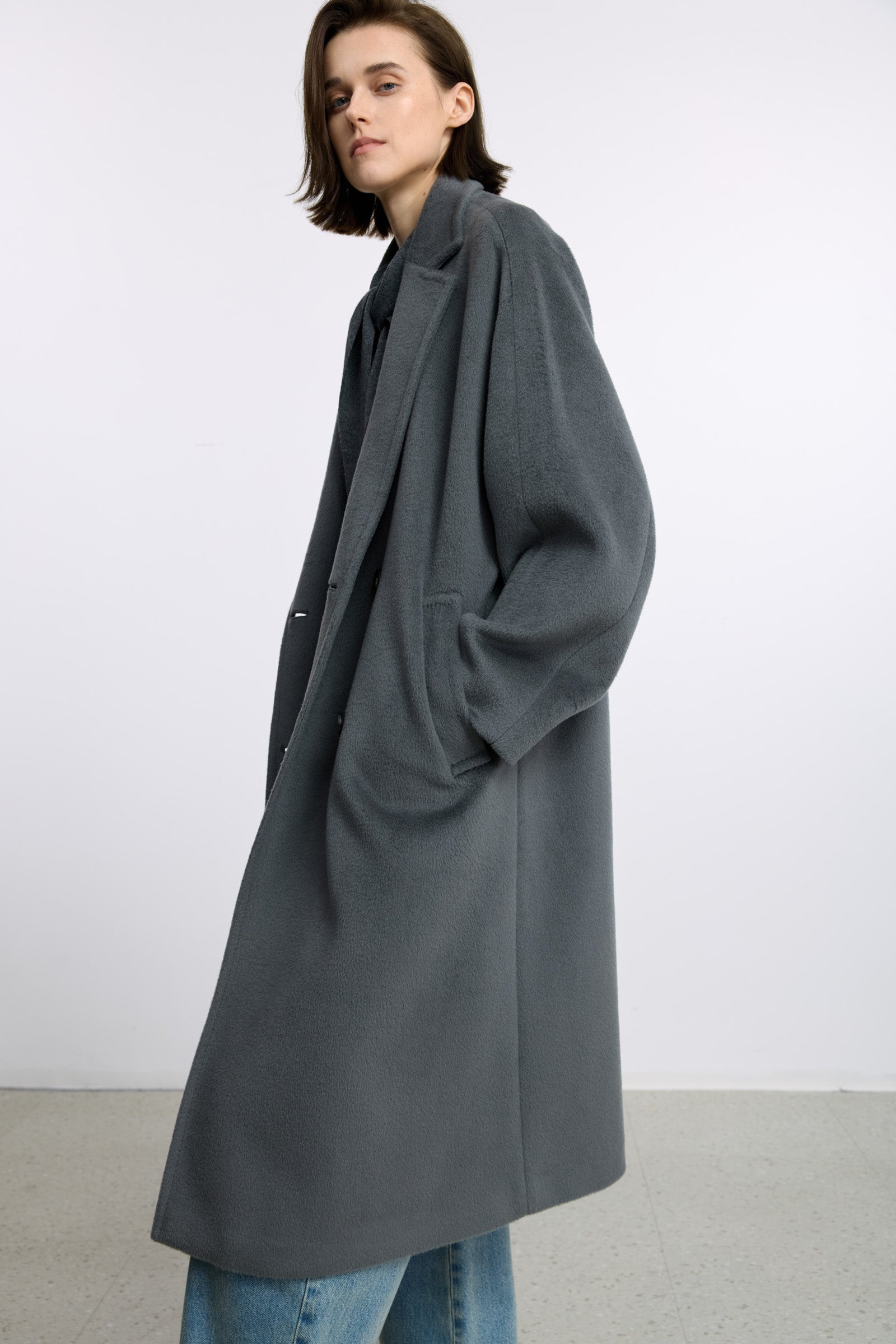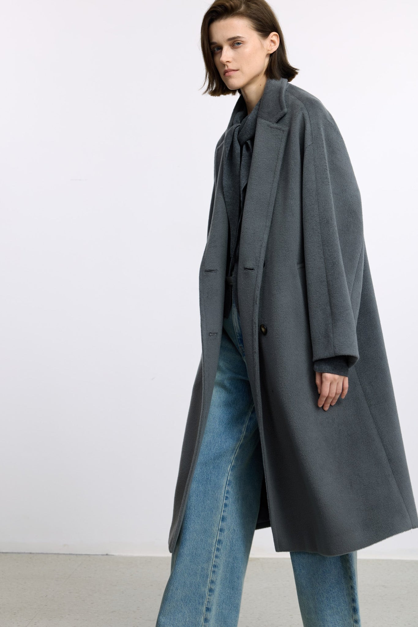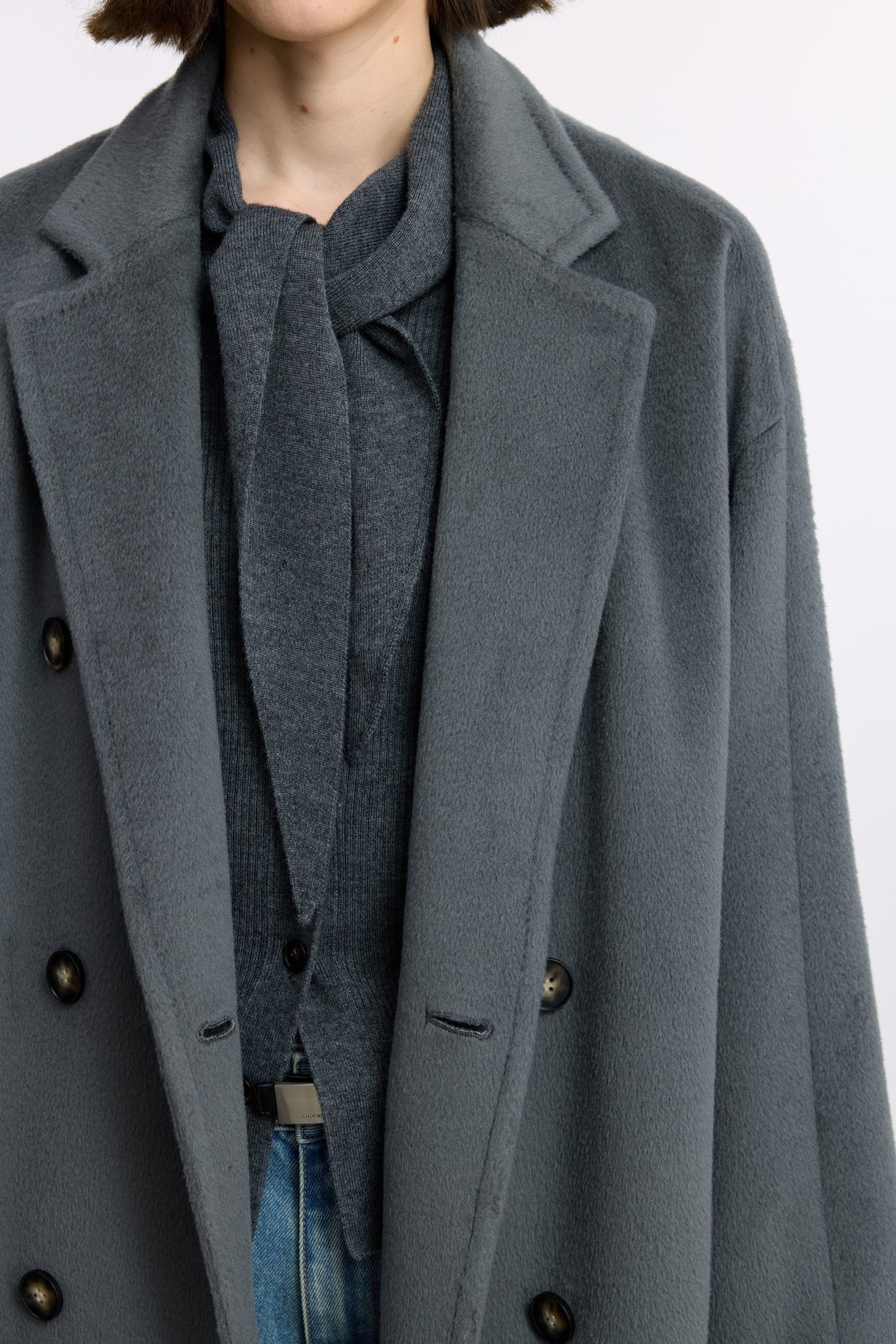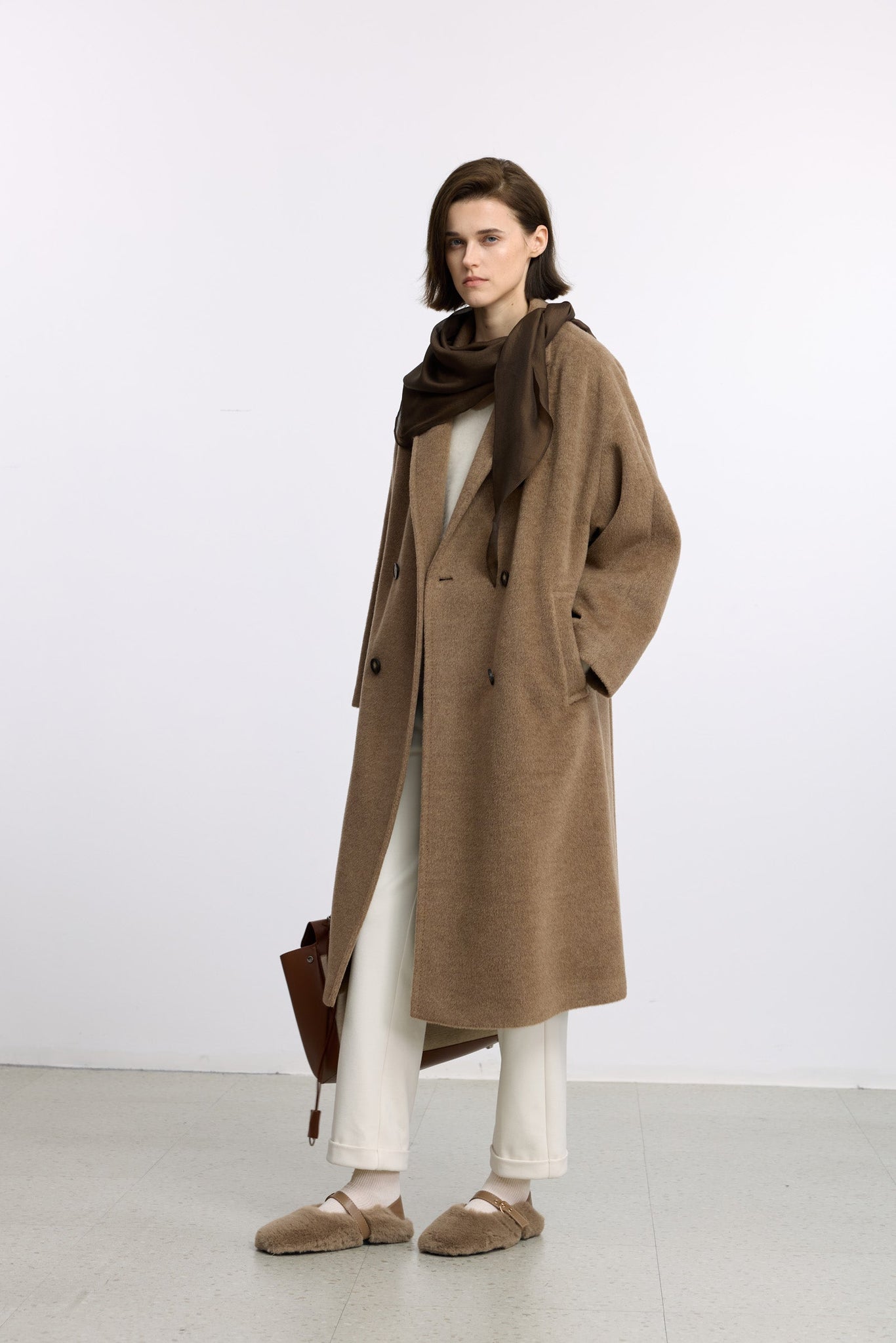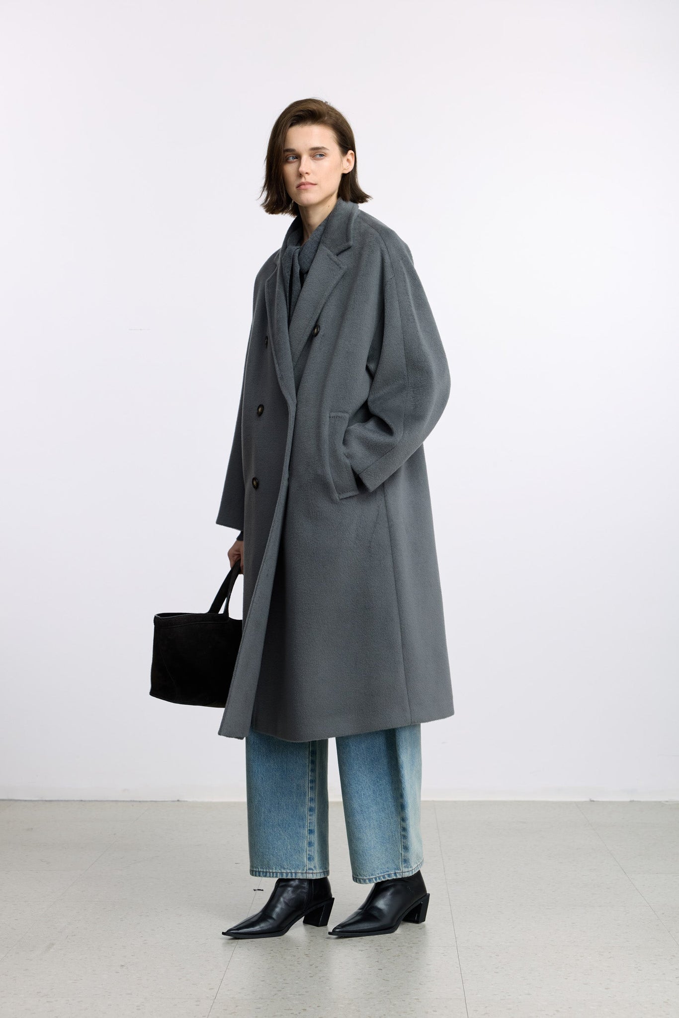 The flat collar and double-breasted construction create a classic coat silhouette, emphasizing a sense of calm and strength.