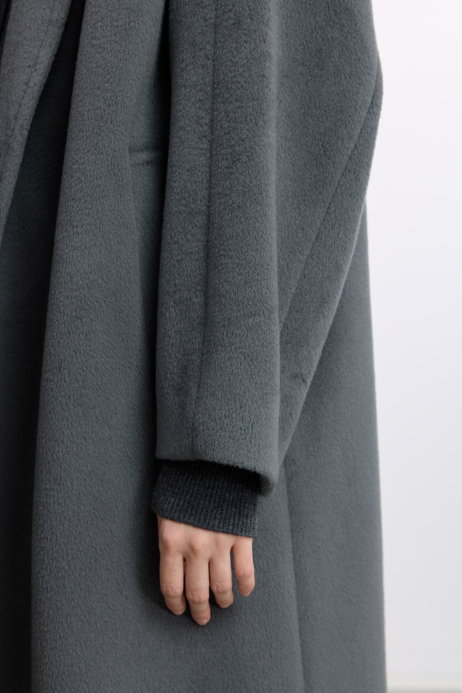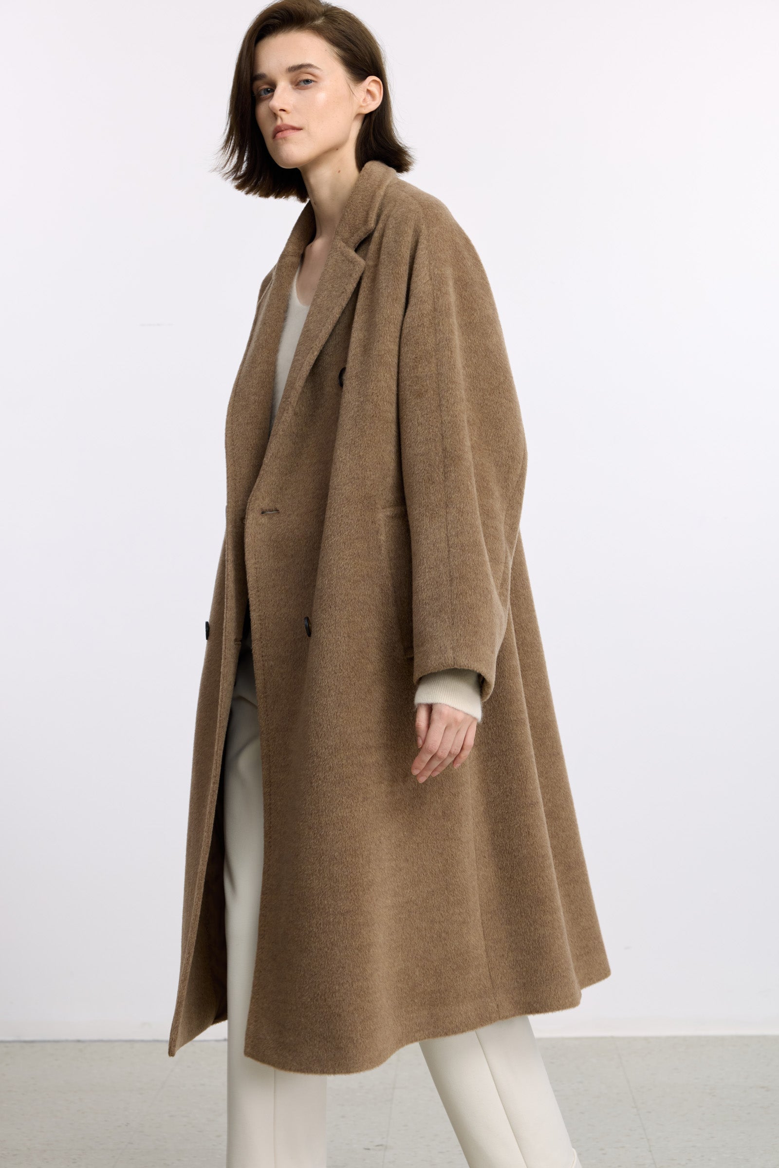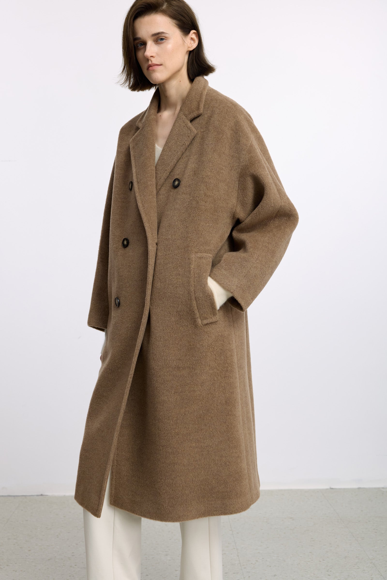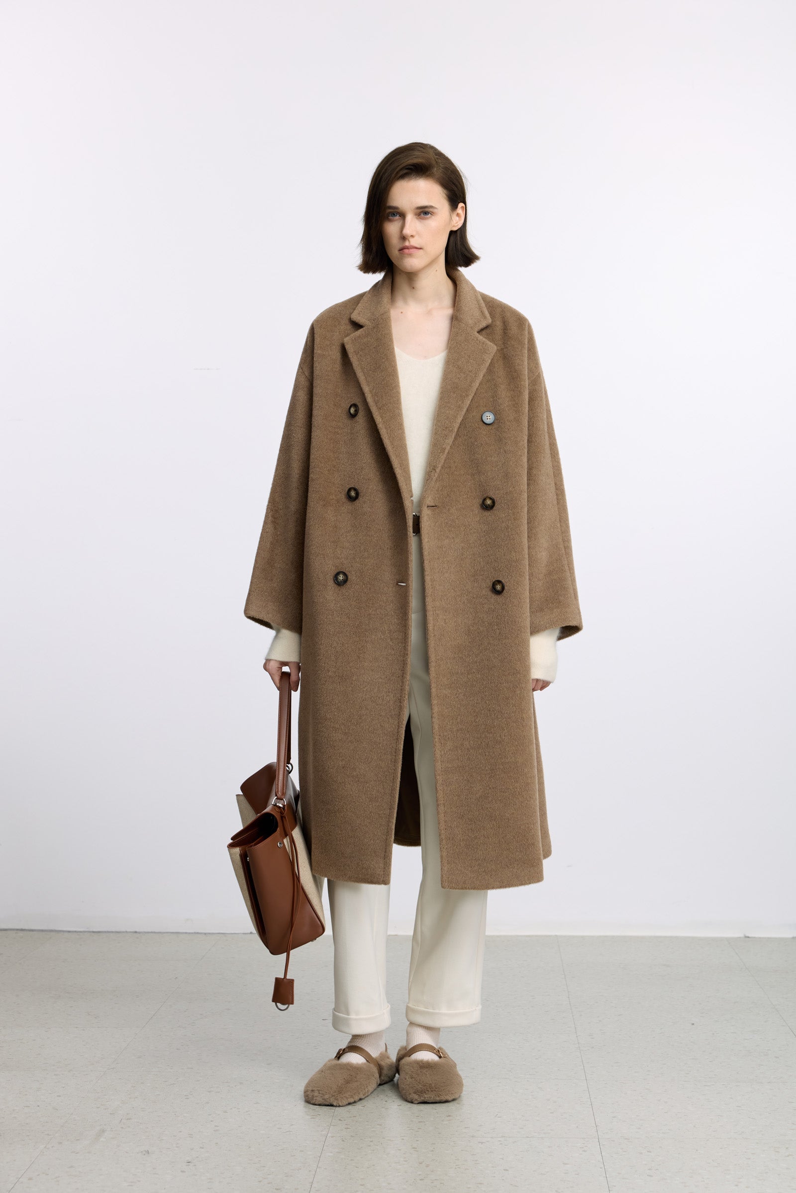 The flat collar and double-breasted construction create a classic coat silhouette, emphasizing a sense of calm and strength.