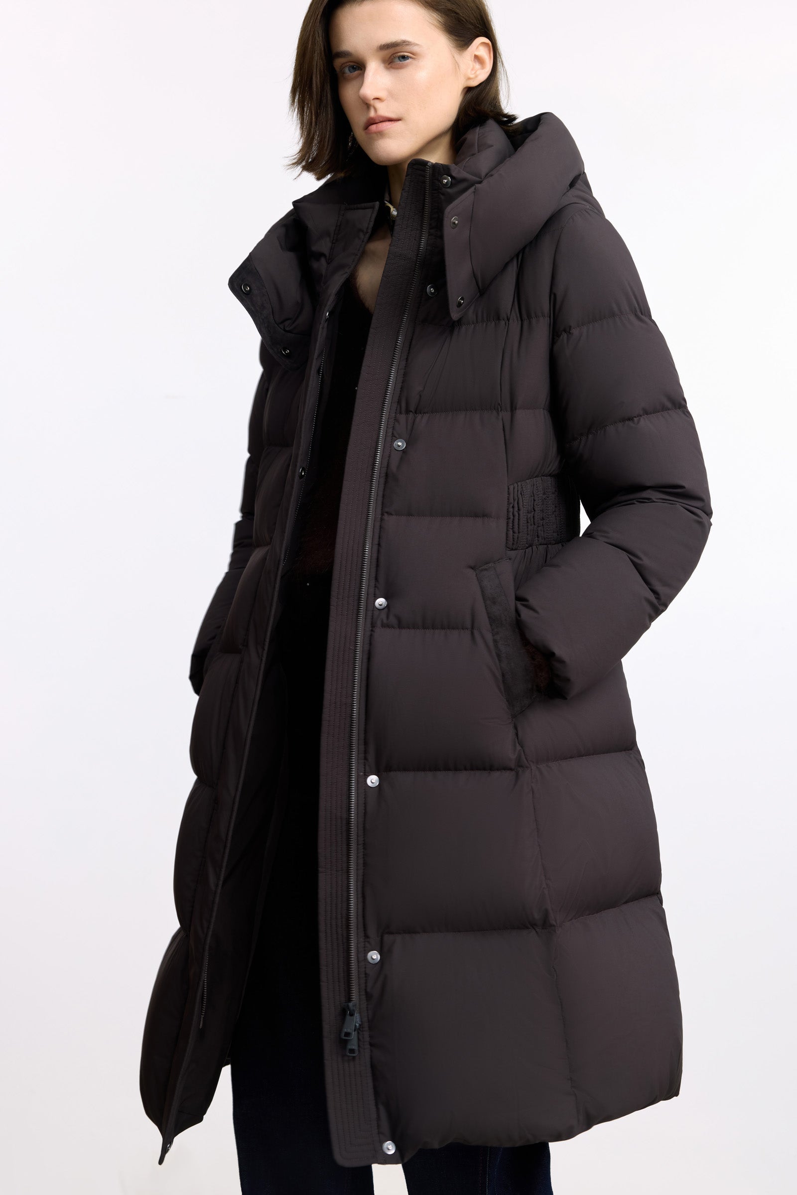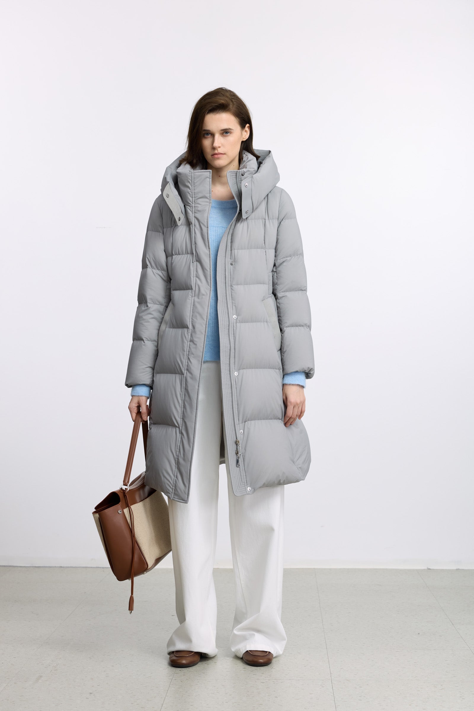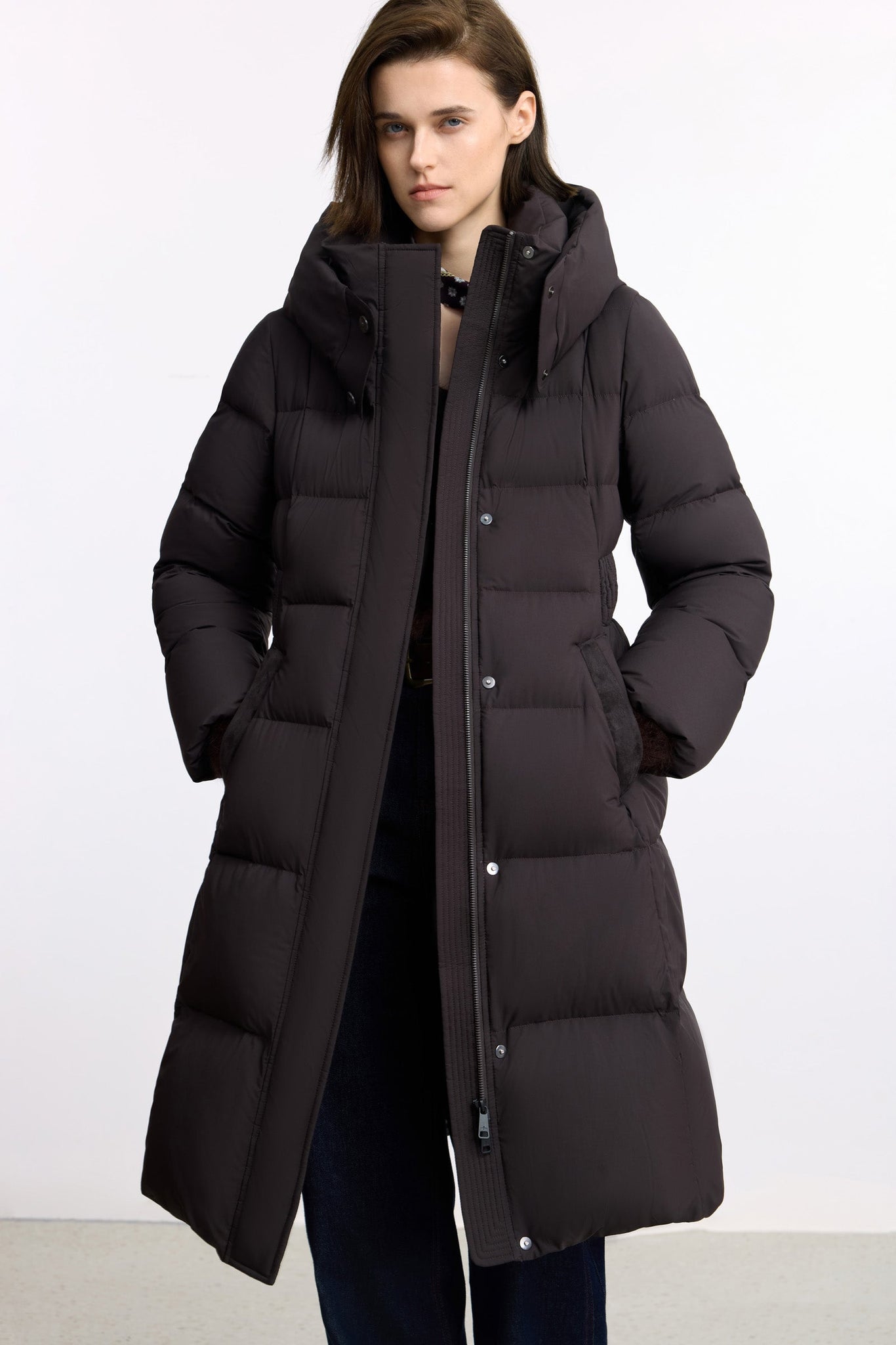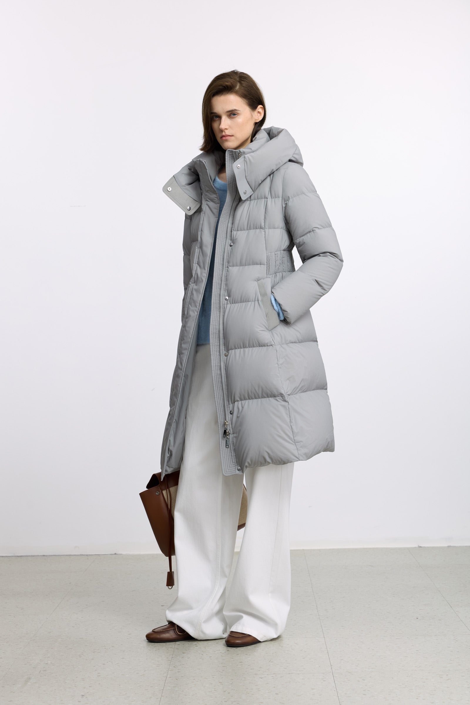 This high-quality rose velvet jacket, crafted with lightweight, velvety craftsmanship, embodies a relaxed and comfortable feel. The mulberry fabric imparts a light, airy feel, creating a cloud-like, soft warmth. The cinched waist design contours the figure, creating a flattering silhouette and effortlessly slimming without bulking. The long hooded style provides added warmth, while the clean silhouette provides coverage, creating a comfortable and elegant winter wardrobe.