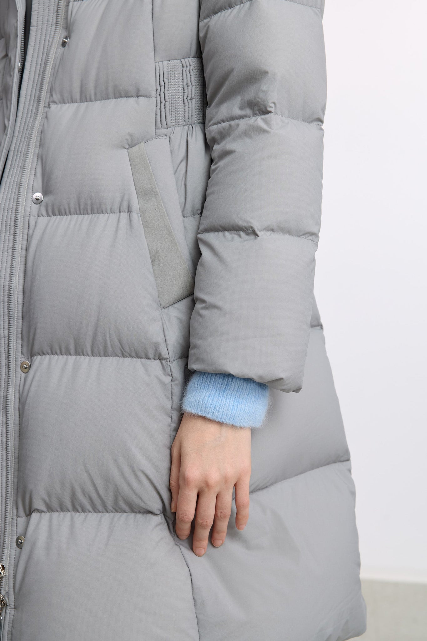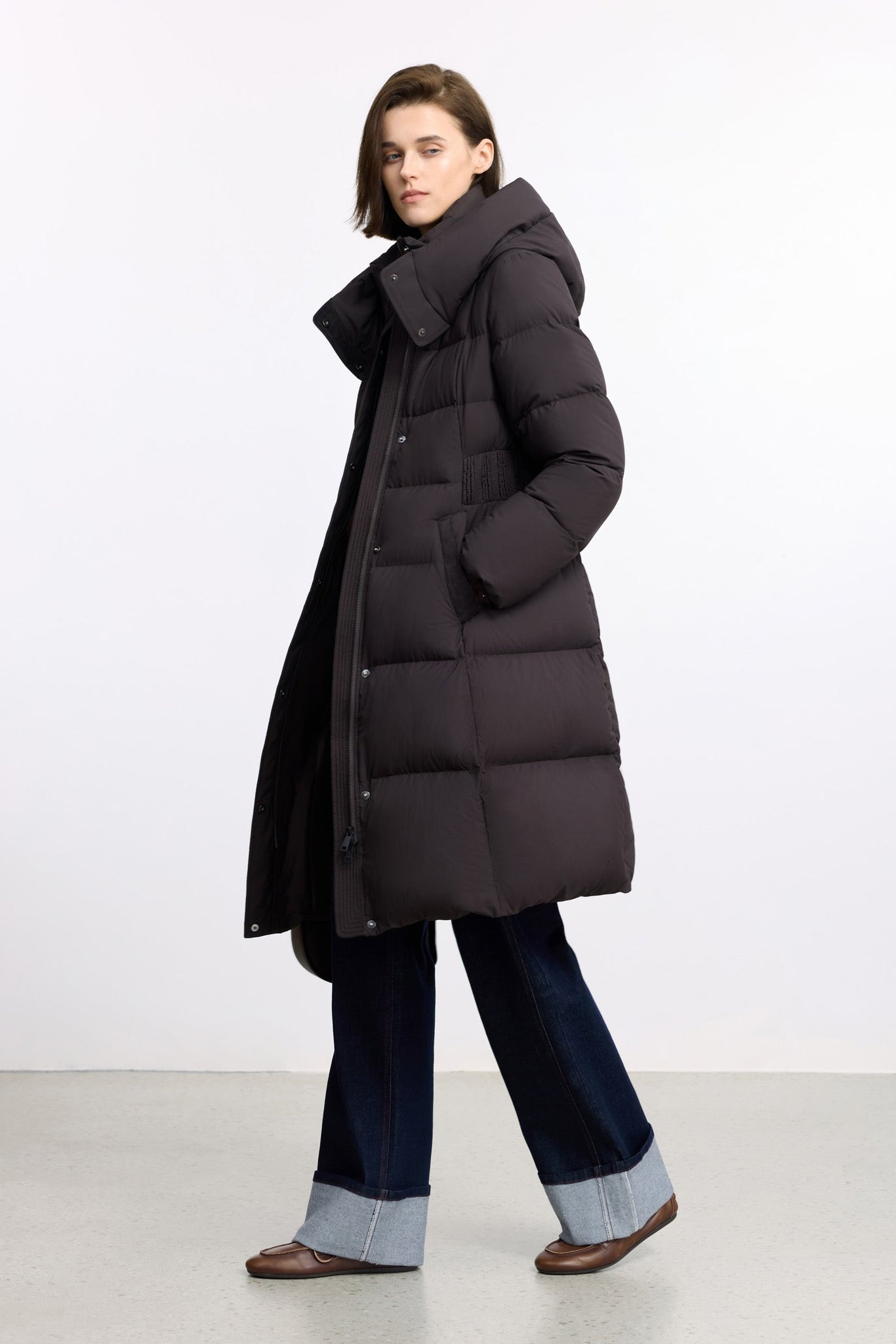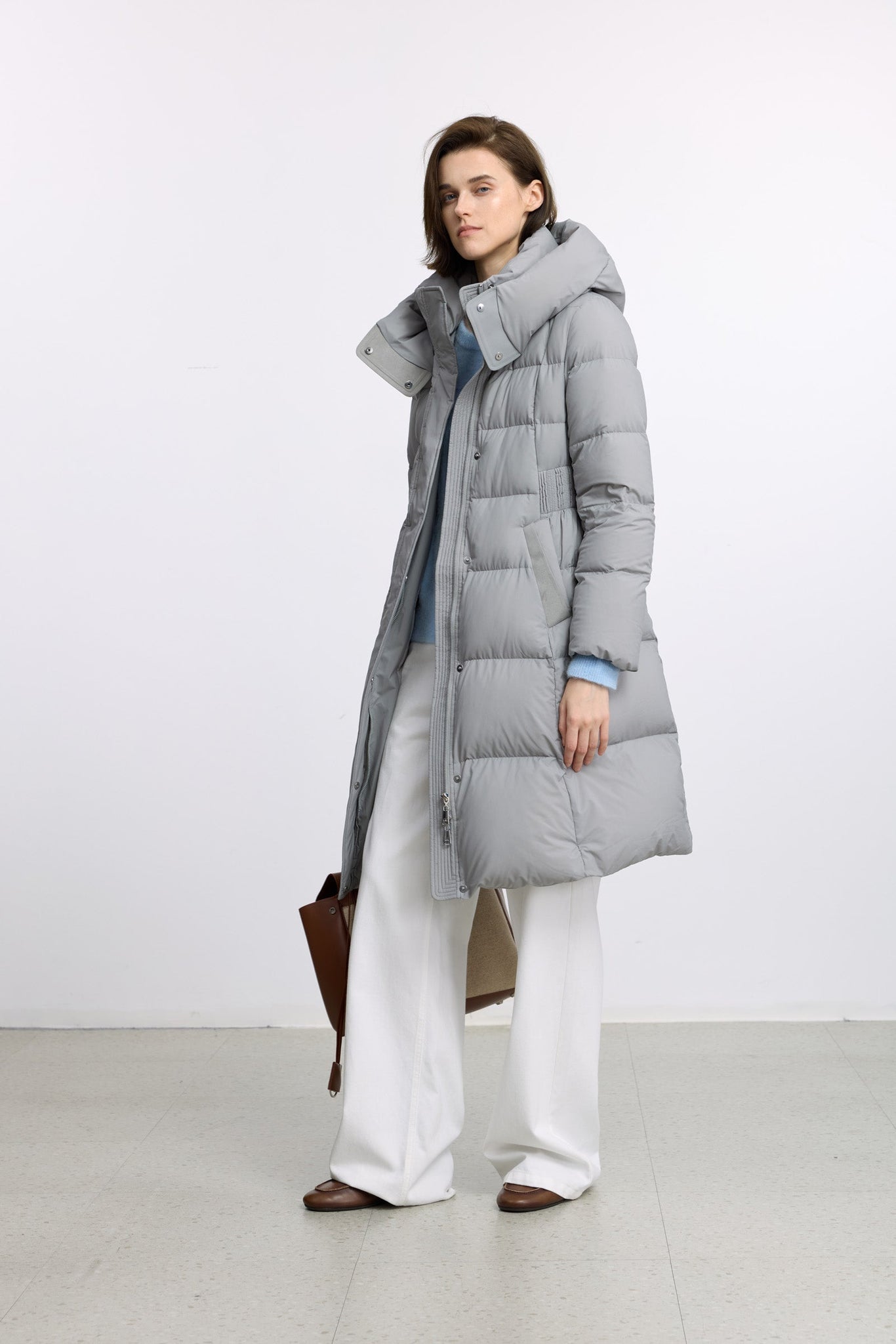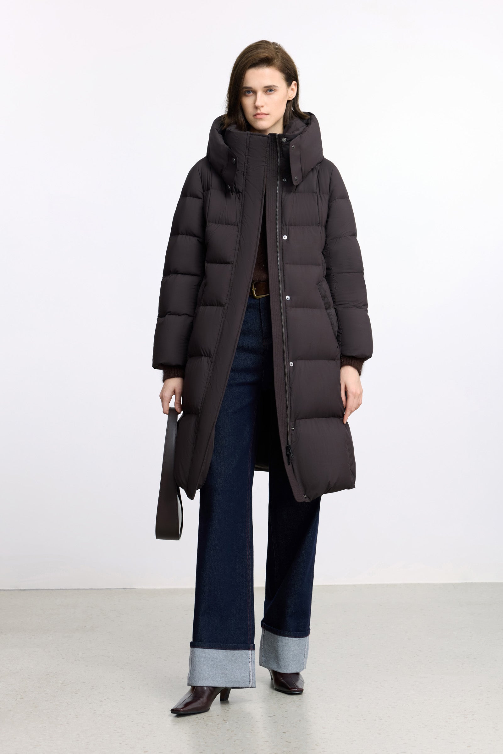 This high-quality rose velvet jacket, crafted with lightweight, velvety craftsmanship, embodies a relaxed and comfortable feel. The mulberry fabric imparts a light, airy feel, creating a cloud-like, soft warmth. The cinched waist design contours the figure, creating a flattering silhouette and effortlessly slimming without bulking. The long hooded style provides added warmth, while the clean silhouette provides coverage, creating a comfortable and elegant winter wardrobe.