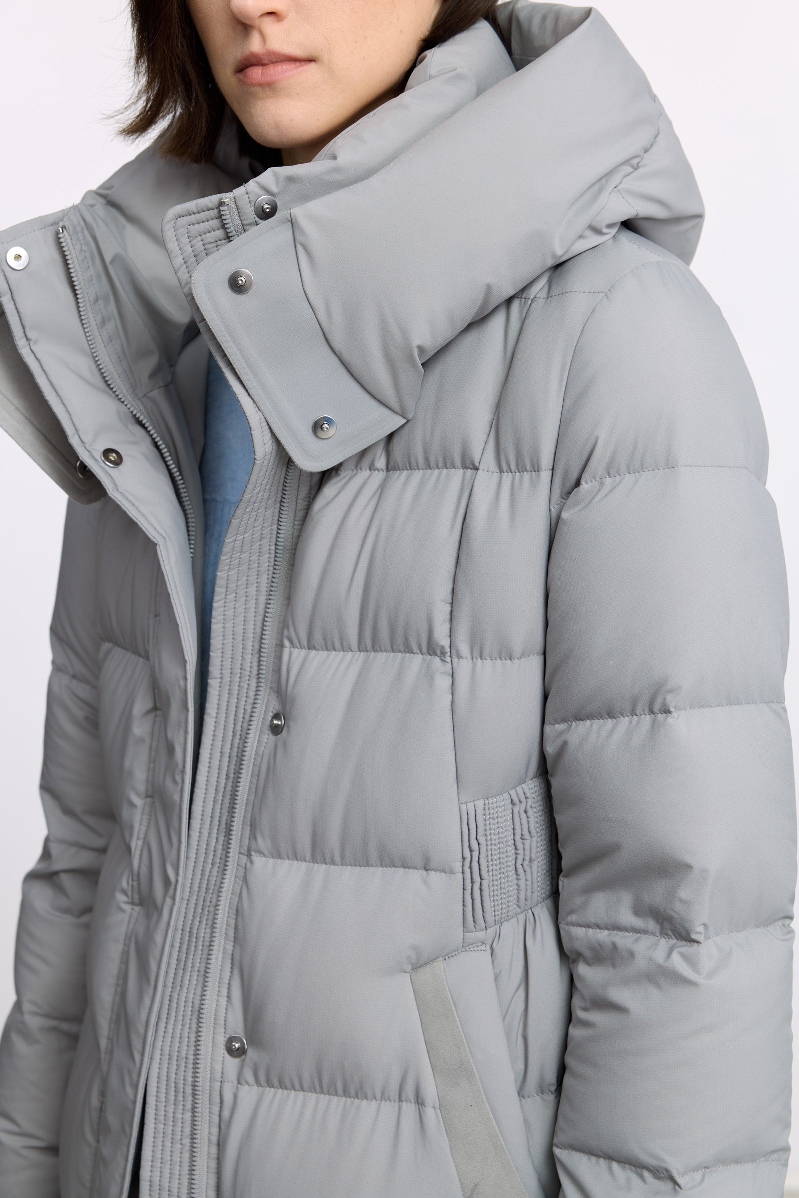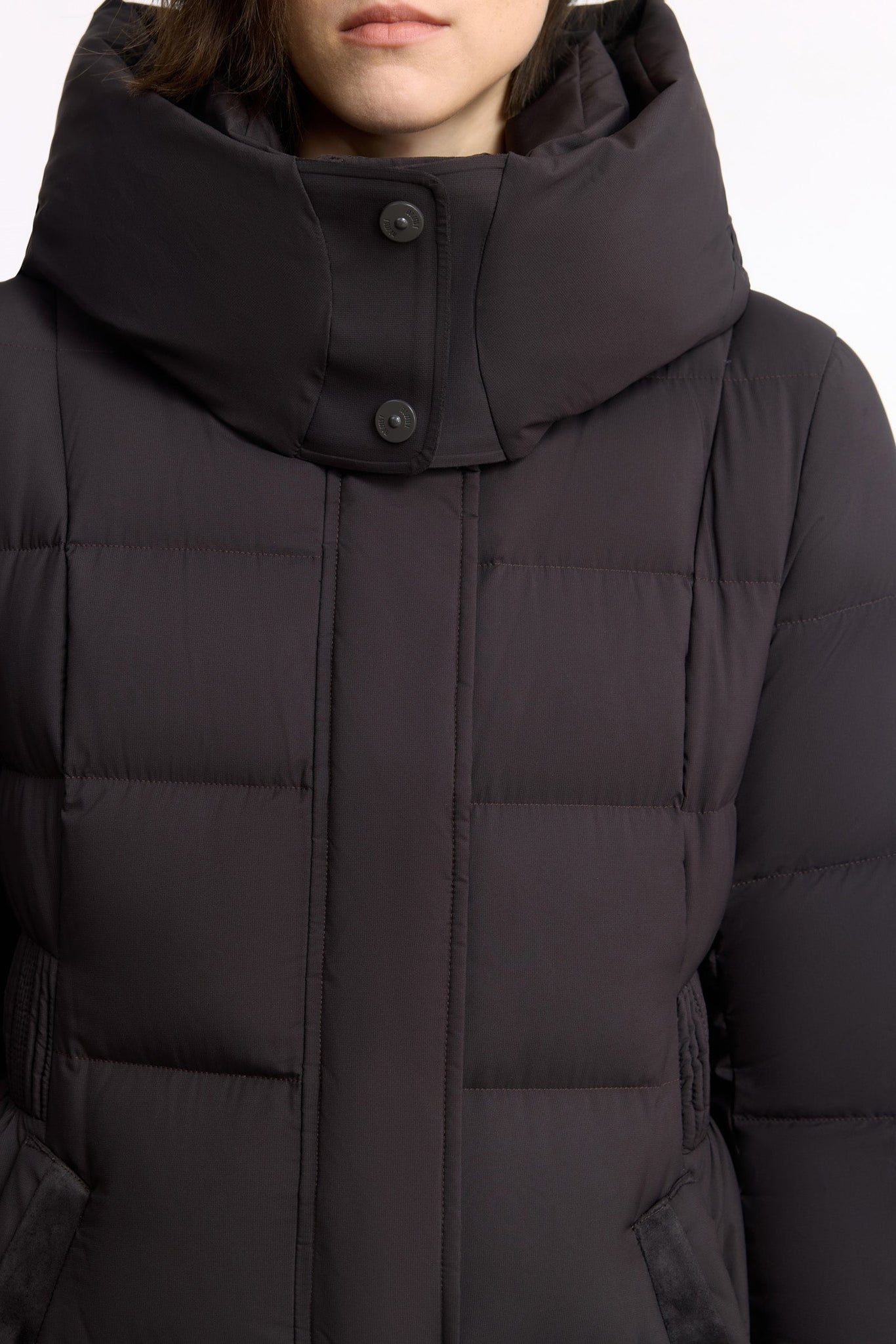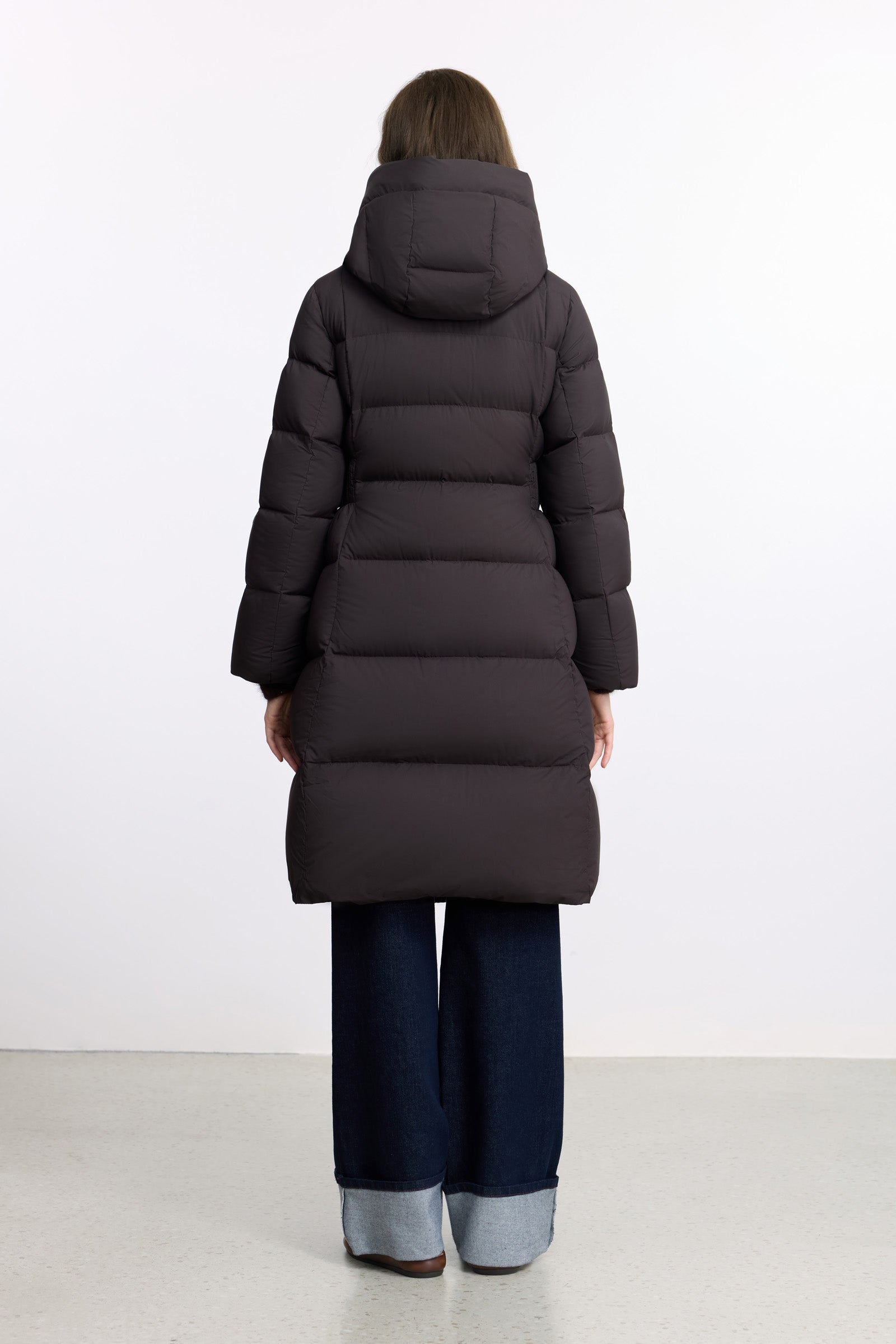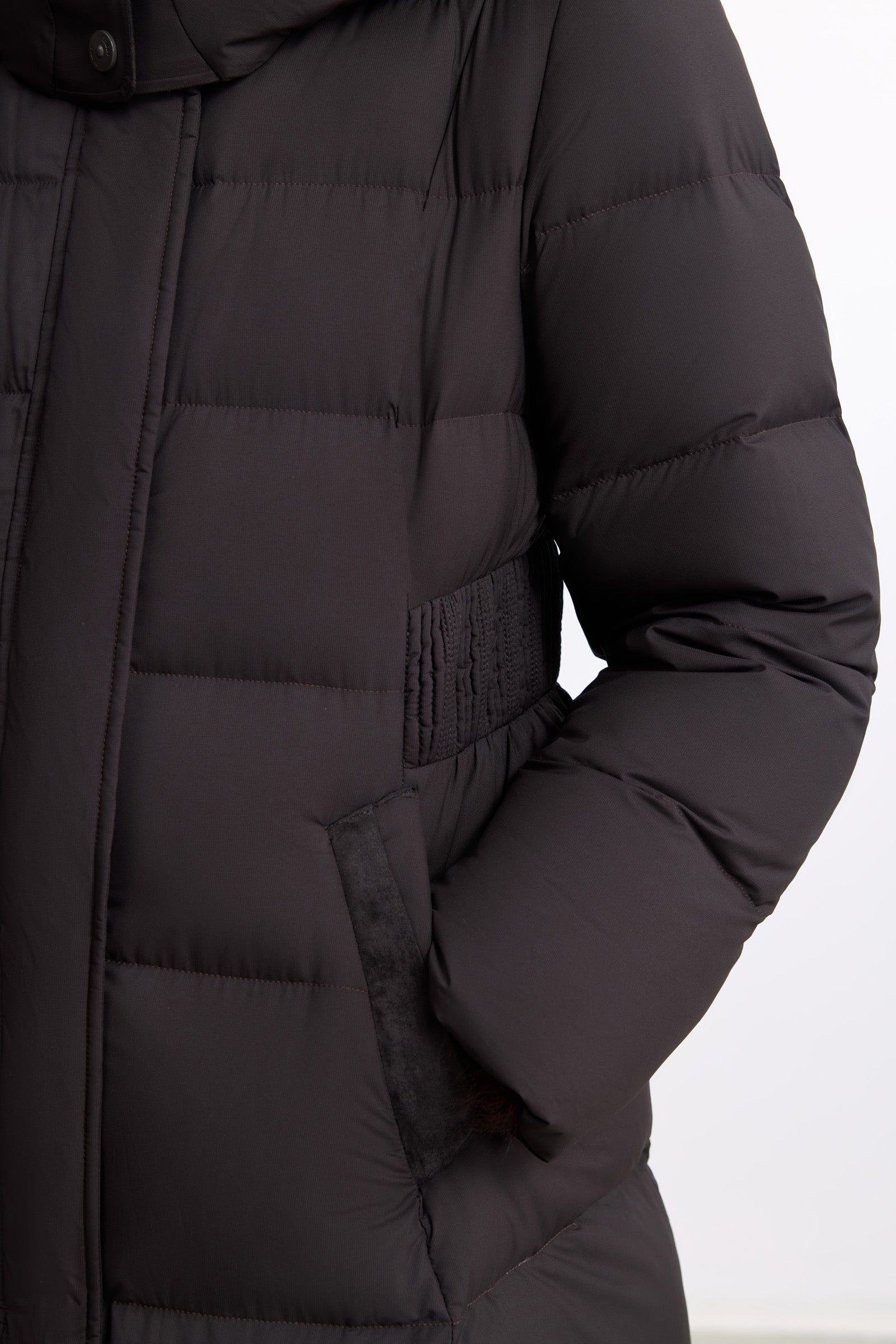 This high-quality rose velvet jacket, crafted with lightweight, velvety craftsmanship, embodies a relaxed and comfortable feel. The mulberry fabric imparts a light, airy feel, creating a cloud-like, soft warmth. The cinched waist design contours the figure, creating a flattering silhouette and effortlessly slimming without bulking. The long hooded style provides added warmth, while the clean silhouette provides coverage, creating a comfortable and elegant winter wardrobe.
