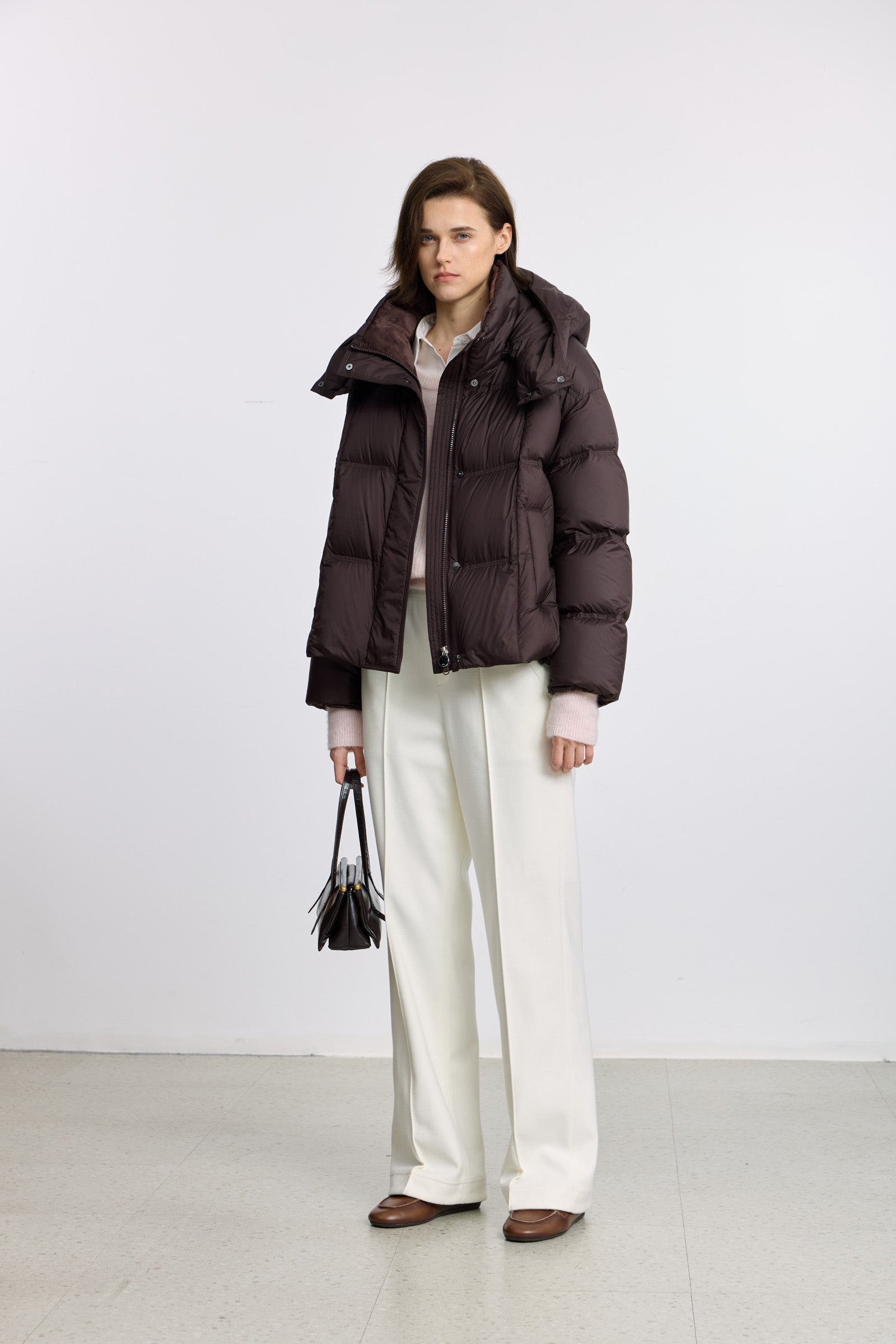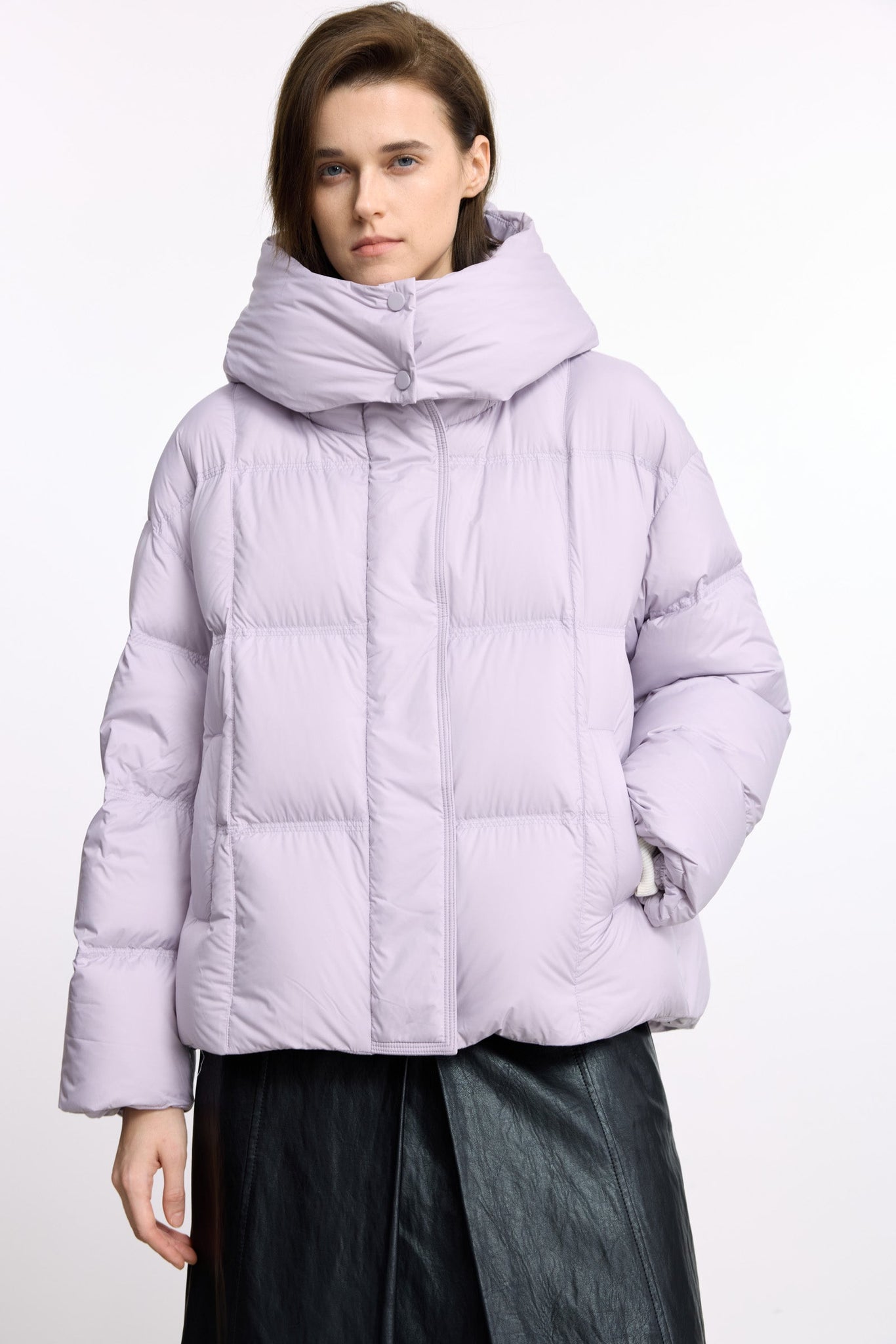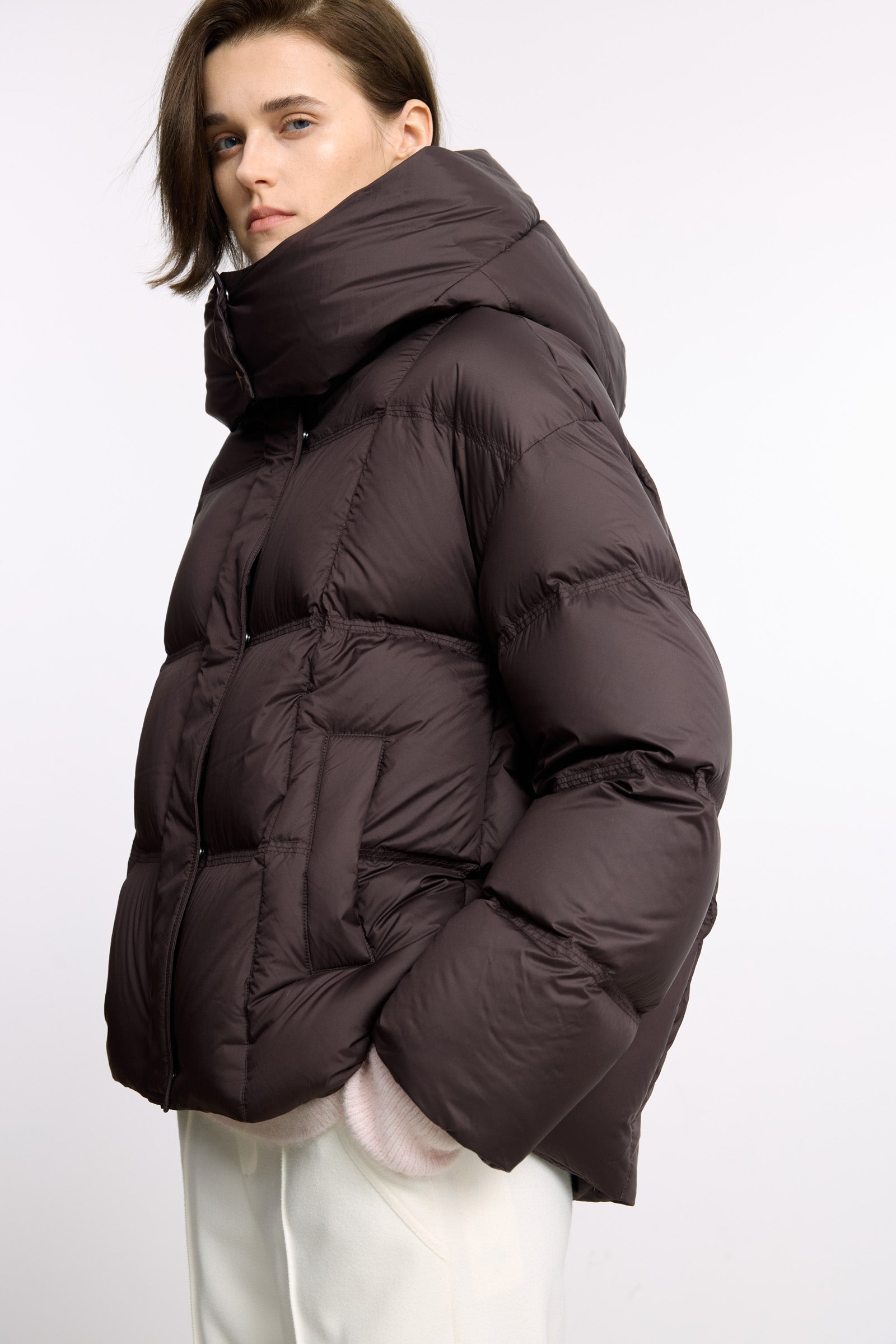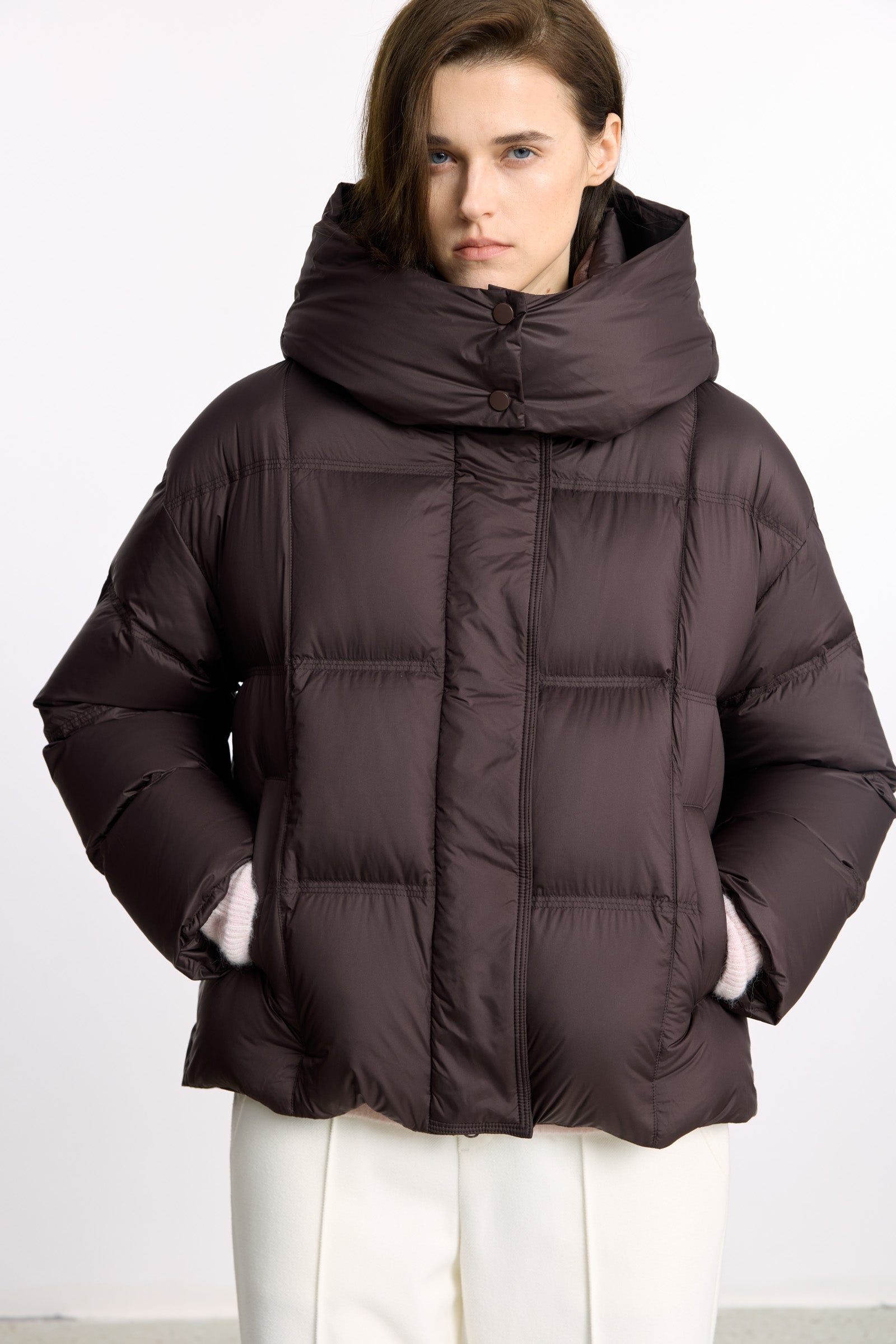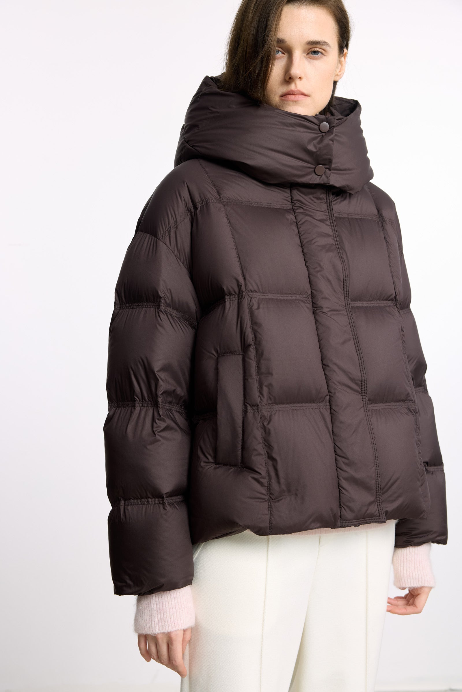 The latticework structure imbues the garment with three-dimensional depth, highlighting the crisp silhouette while creating a sense of simple order. The stand-up collar and hooded design combine warmth with a modern aura, projecting a refined and capable presence. The interweaving of a pine puff shape and a relaxed silhouette juxtaposes lightness and strength, showcasing a relaxed yet assertive, high-sense style.