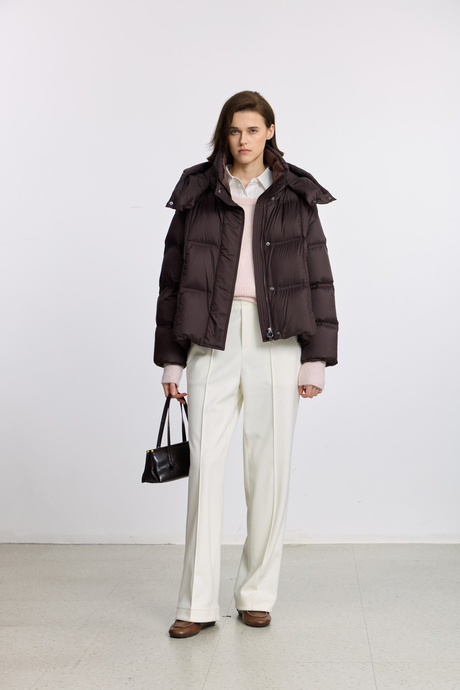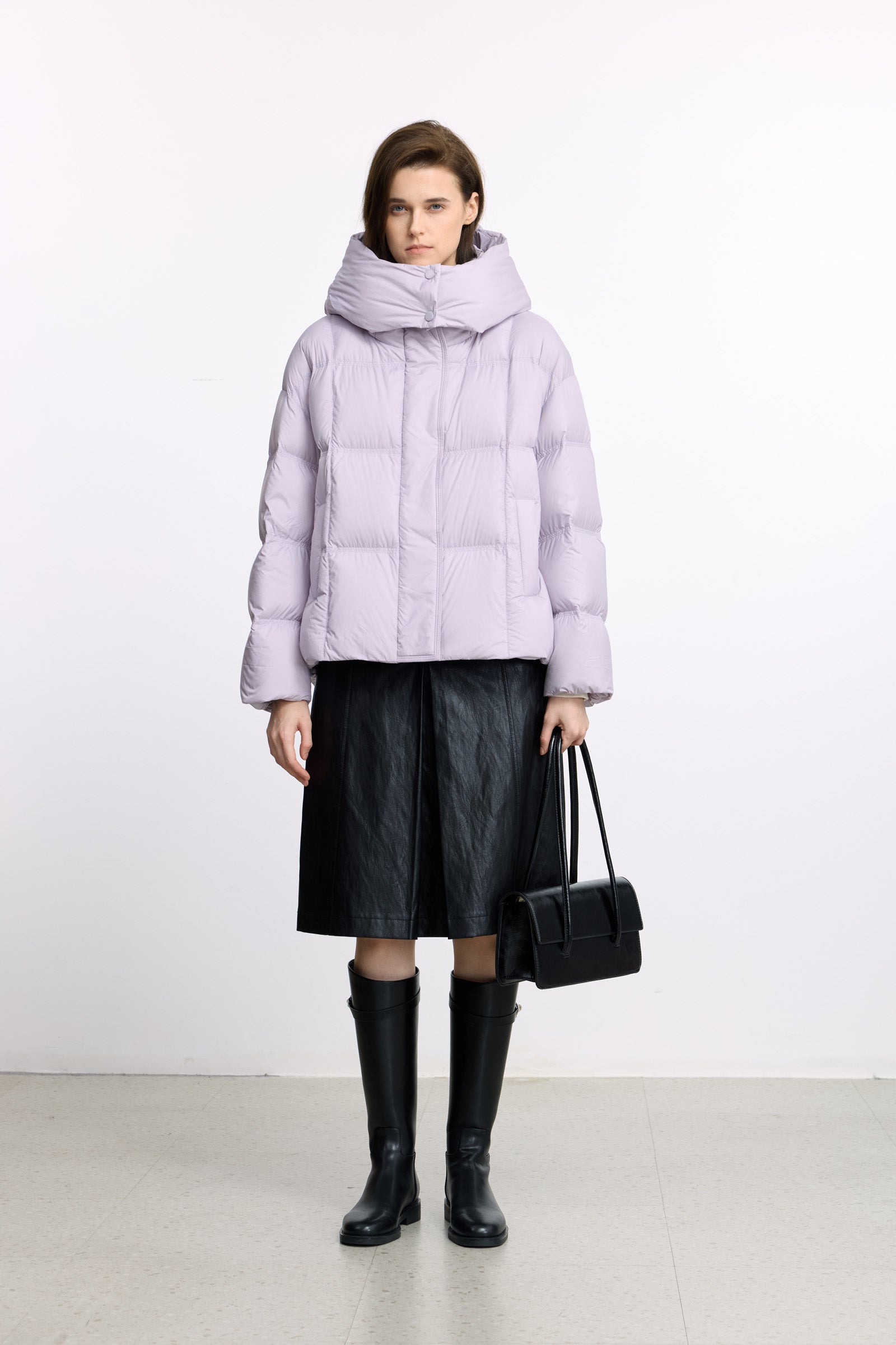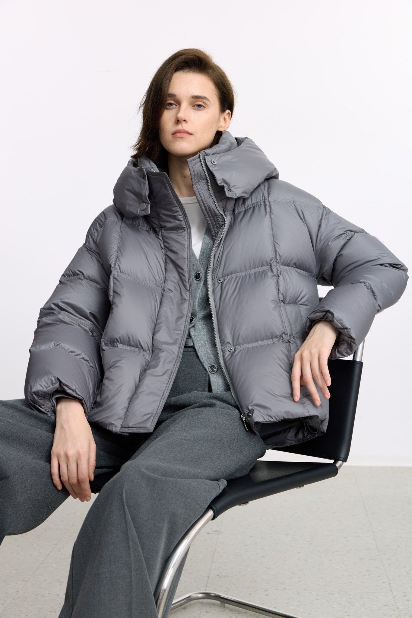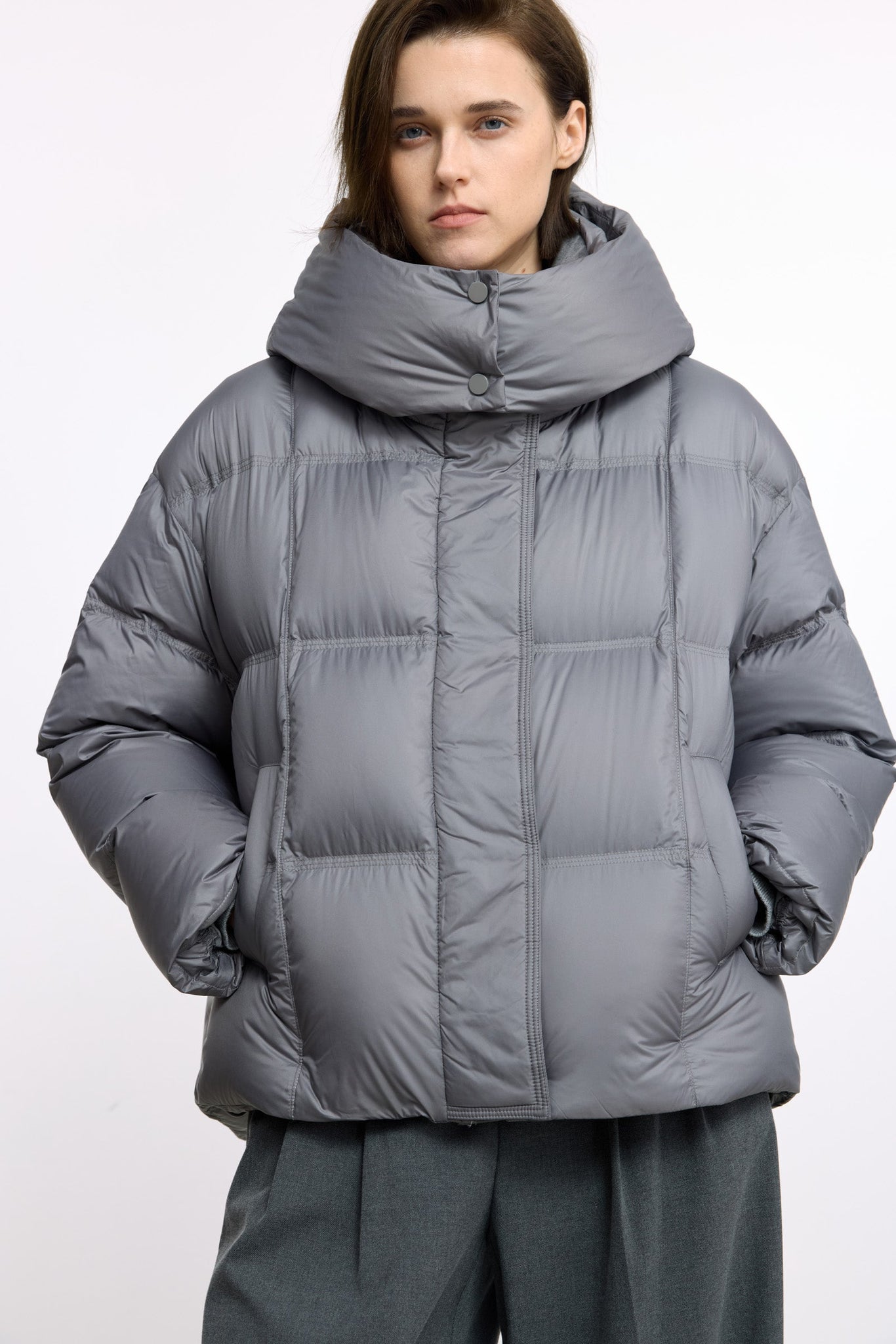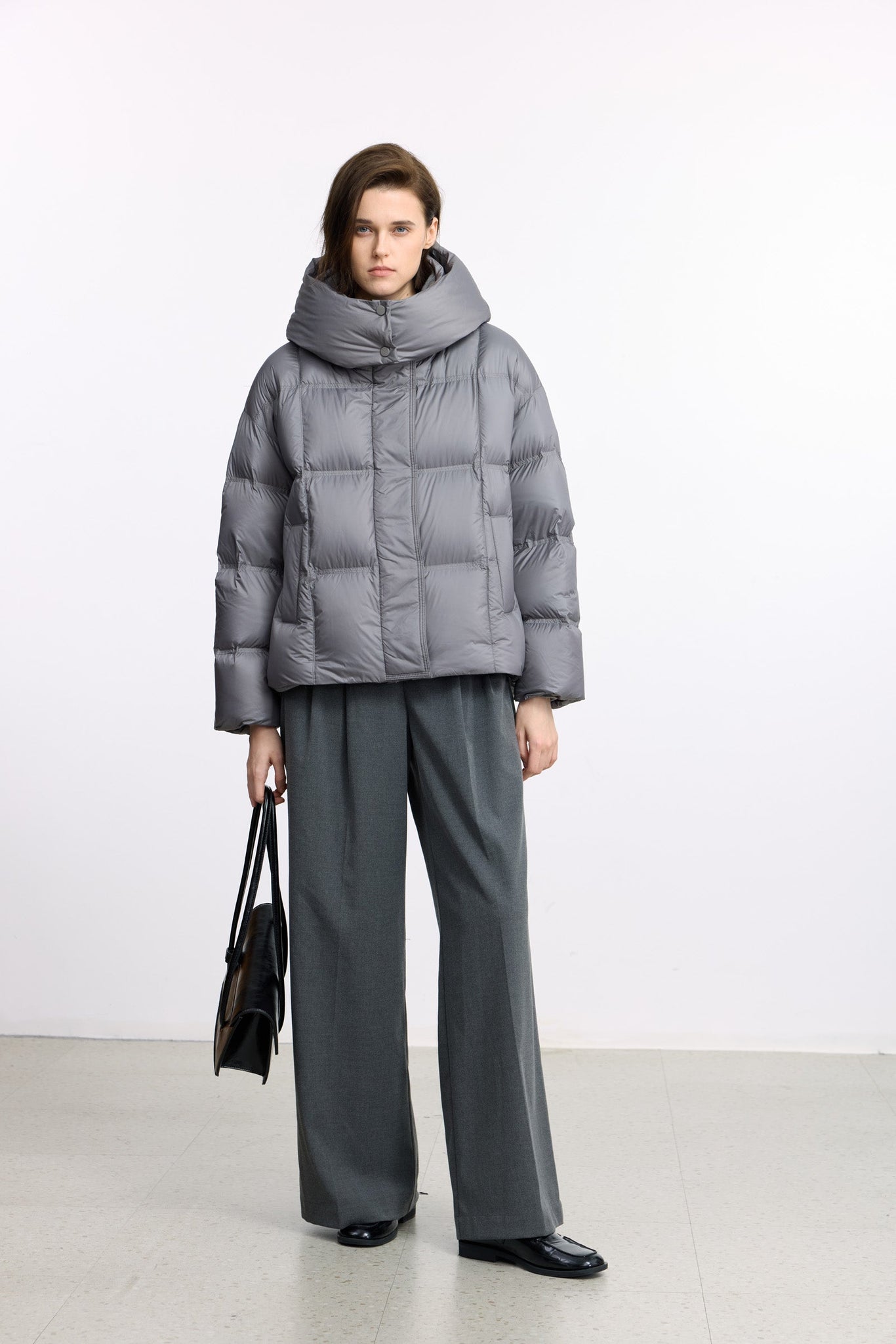 The latticework structure imbues the garment with three-dimensional depth, highlighting the crisp silhouette while creating a sense of simple order. The stand-up collar and hooded design combine warmth with a modern aura, projecting a refined and capable presence. The interweaving of a pine puff shape and a relaxed silhouette juxtaposes lightness and strength, showcasing a relaxed yet assertive, high-sense style.