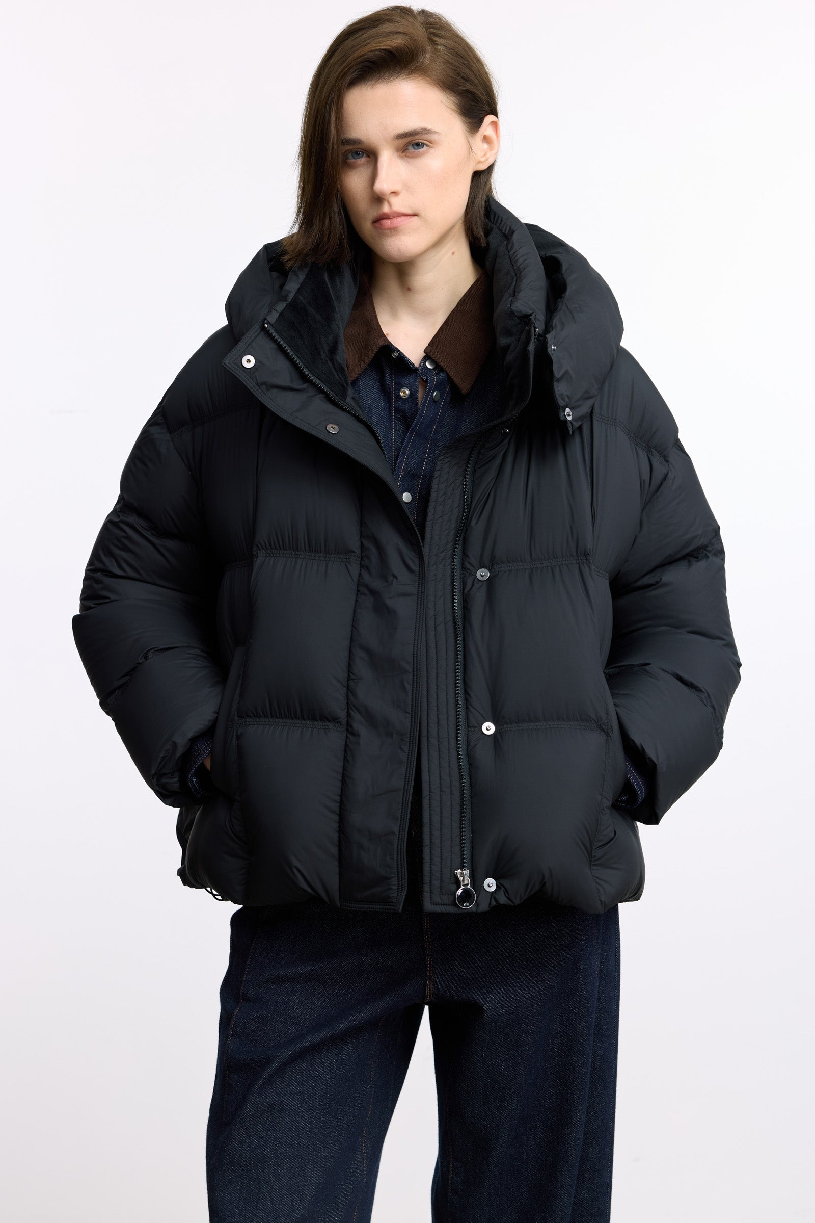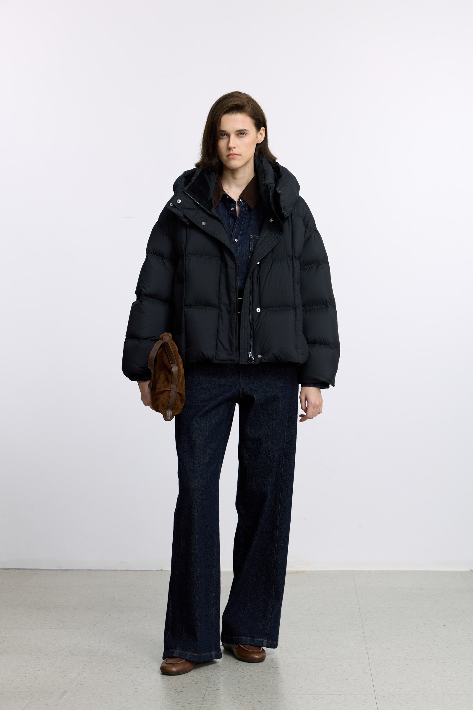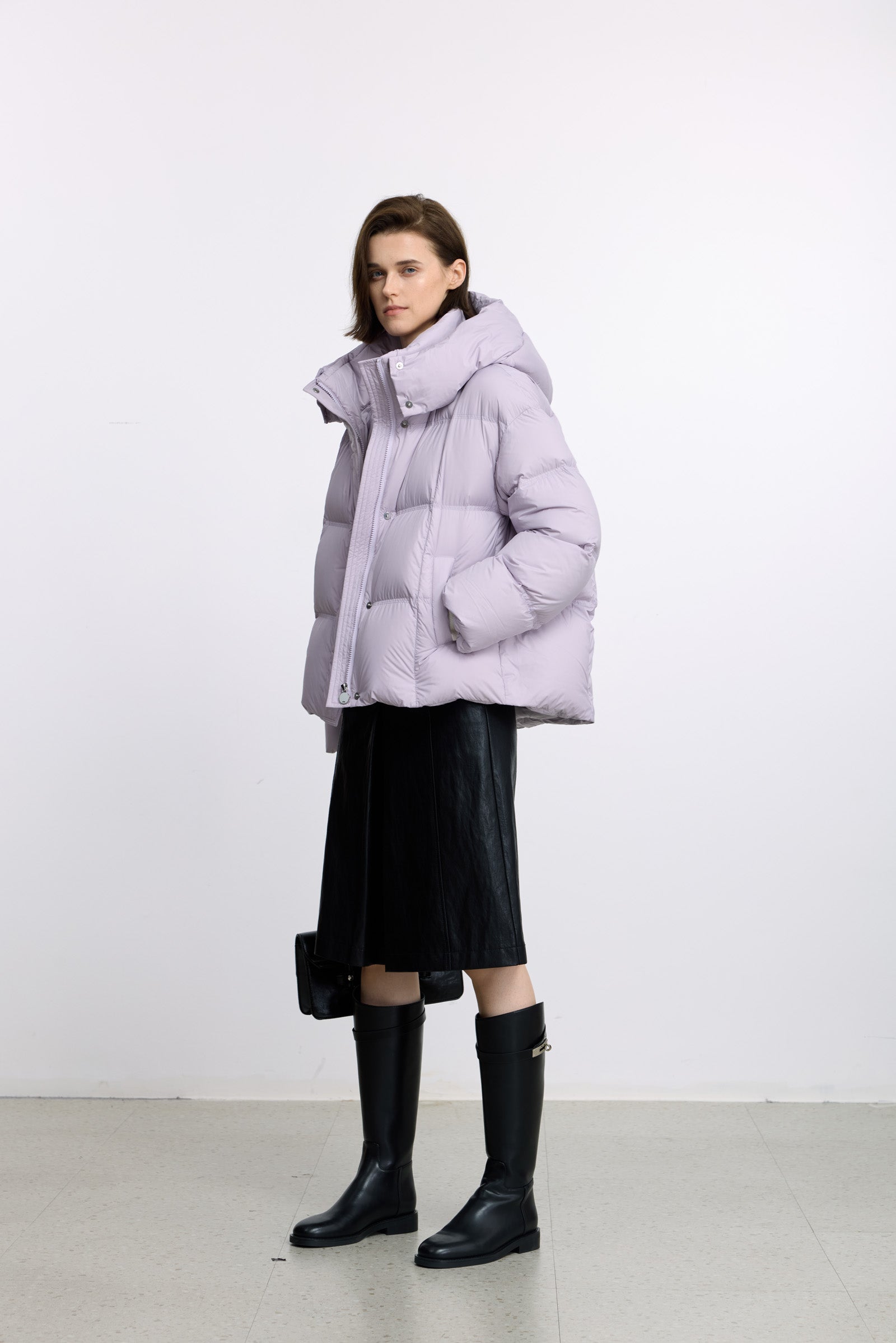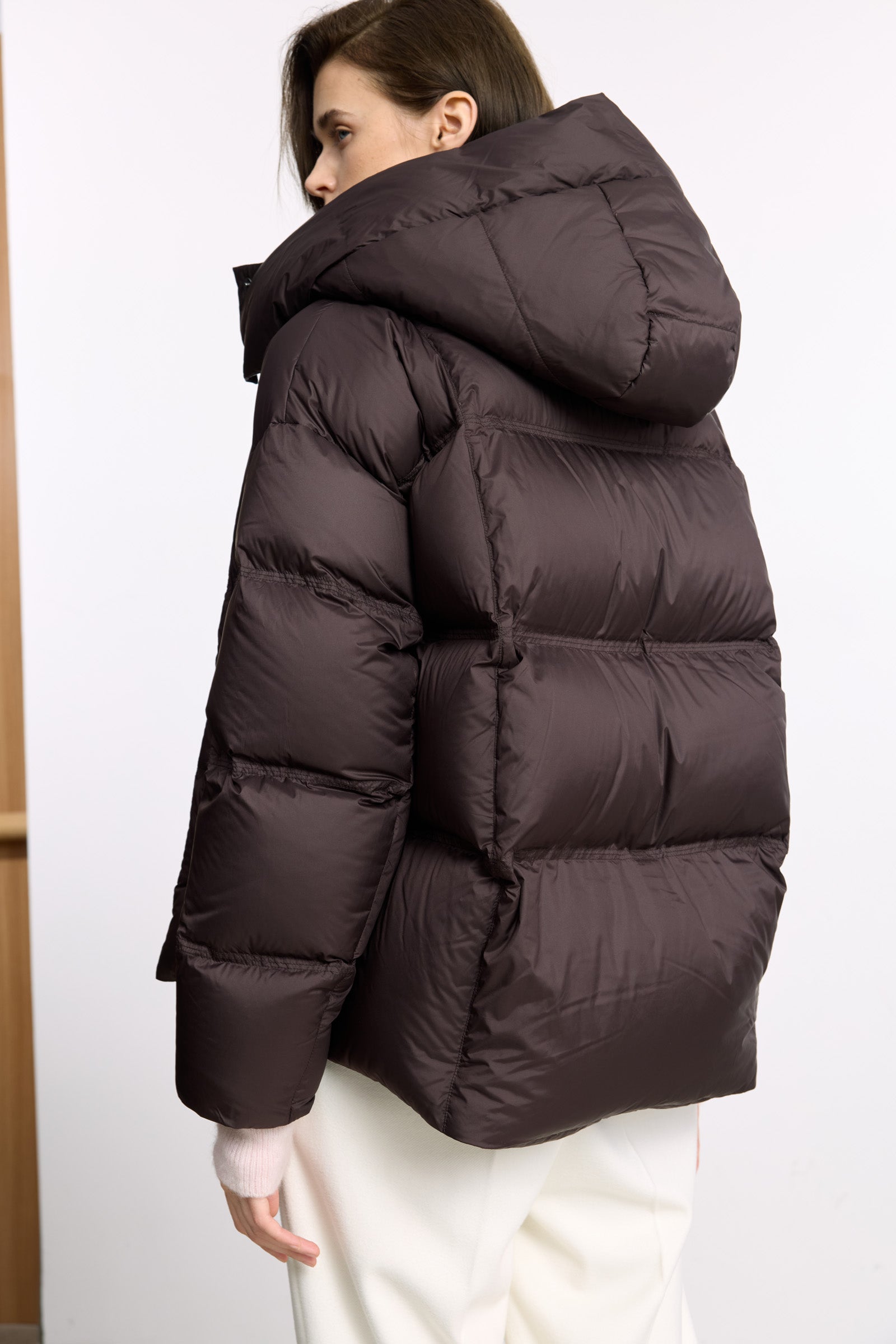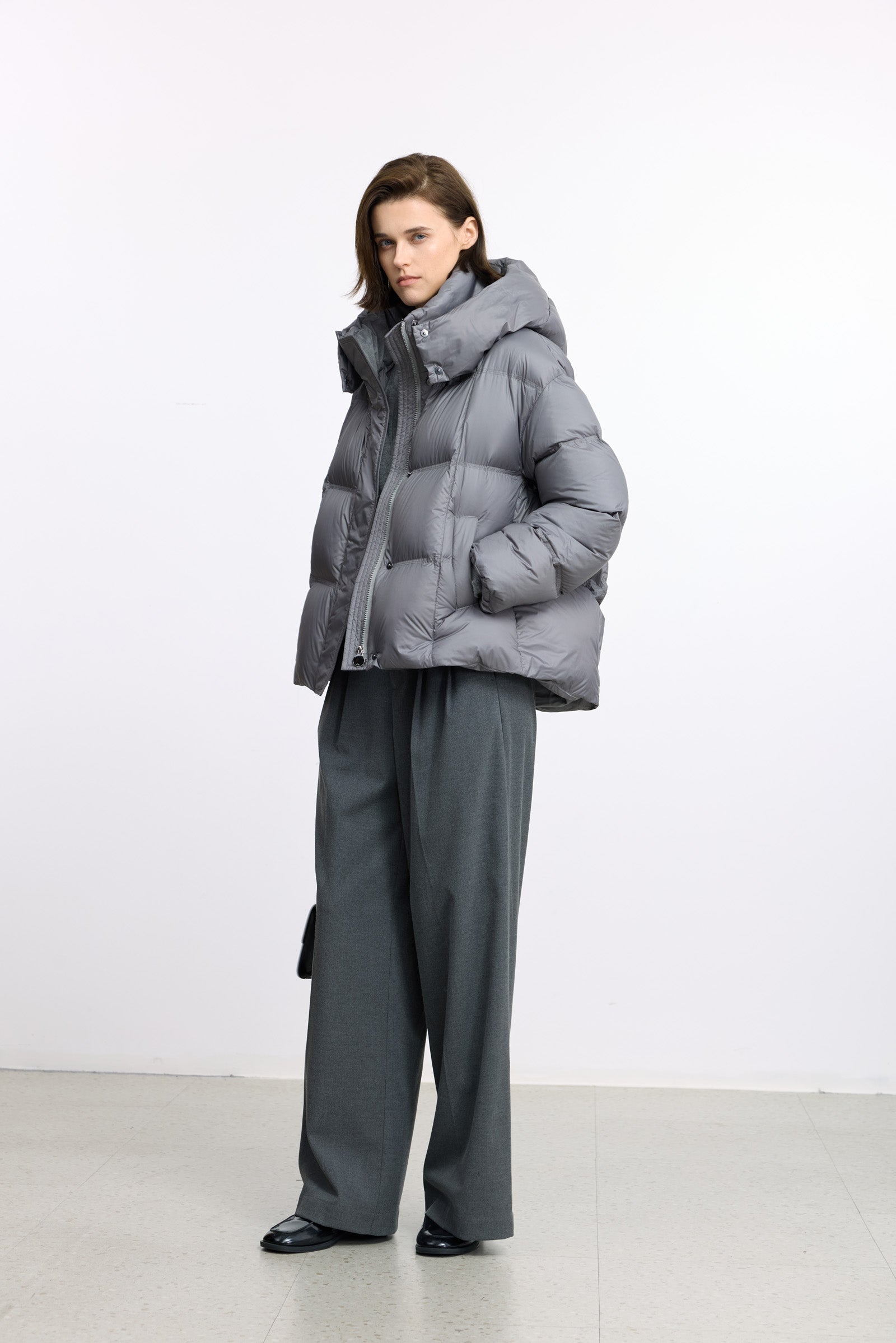 The latticework structure imbues the garment with three-dimensional depth, highlighting the crisp silhouette while creating a sense of simple order. The stand-up collar and hooded design combine warmth with a modern aura, projecting a refined and capable presence. The interweaving of a pine puff shape and a relaxed silhouette juxtaposes lightness and strength, showcasing a relaxed yet assertive, high-sense style.