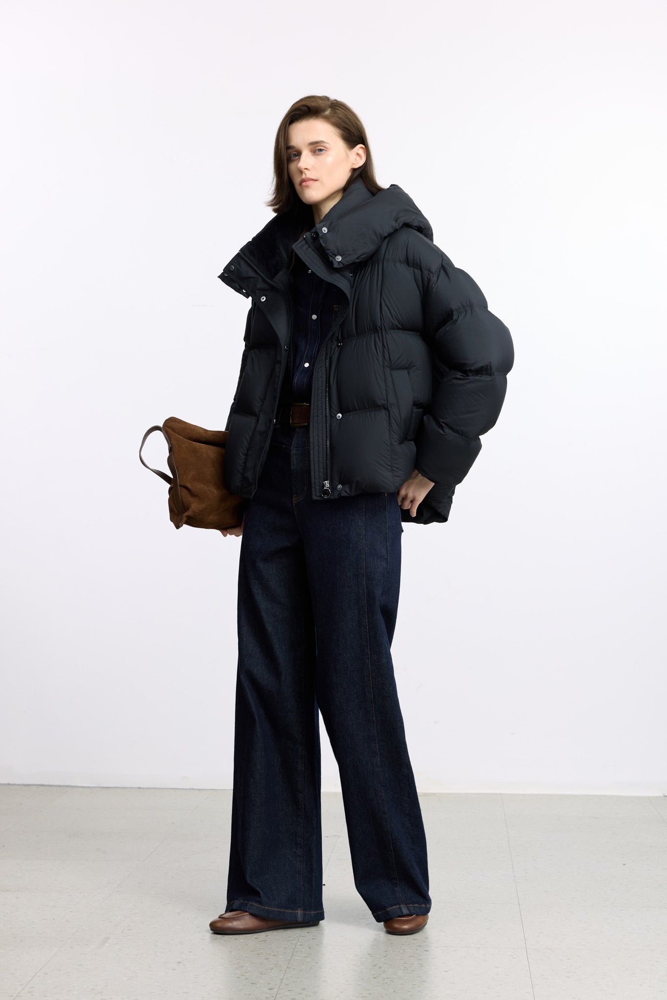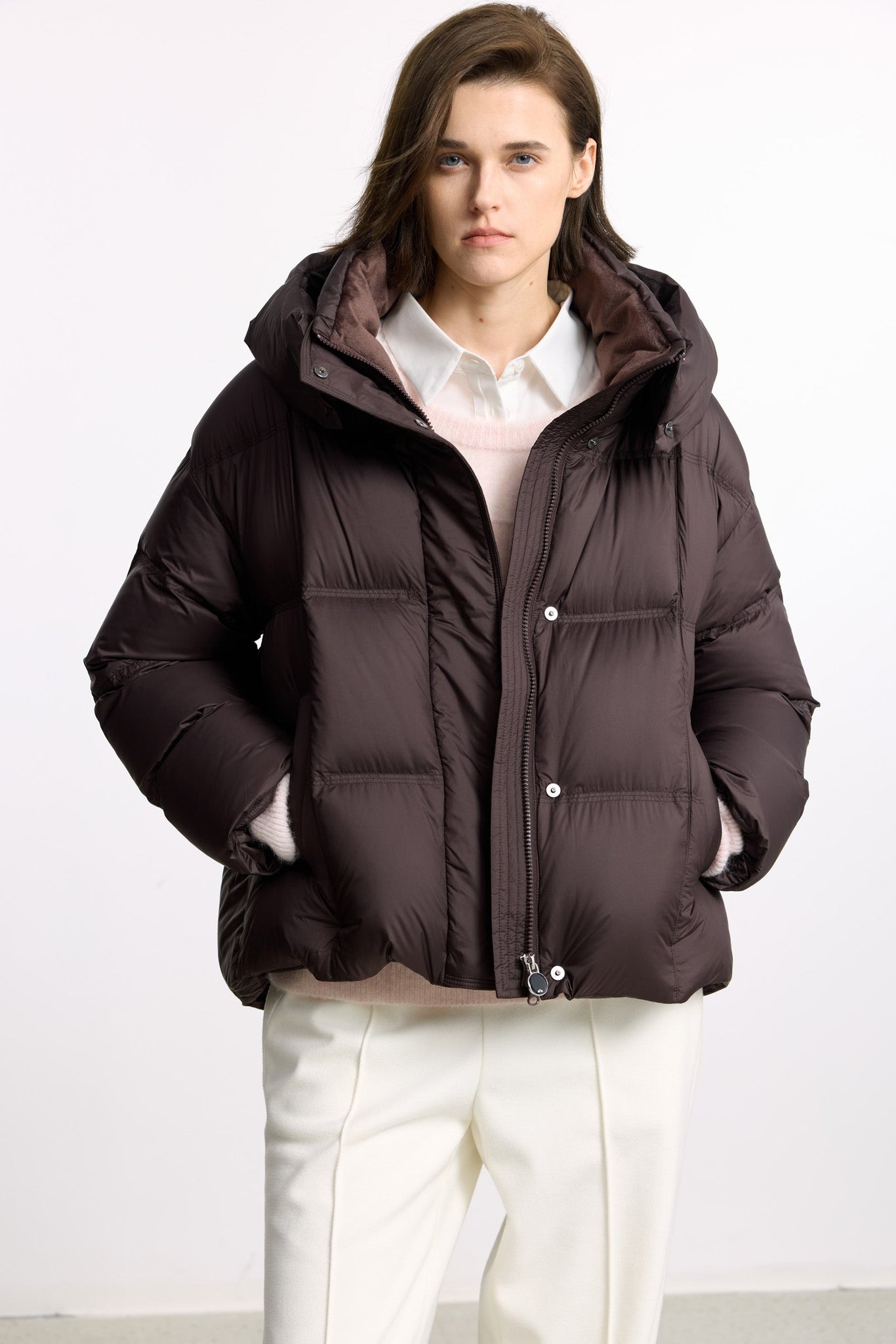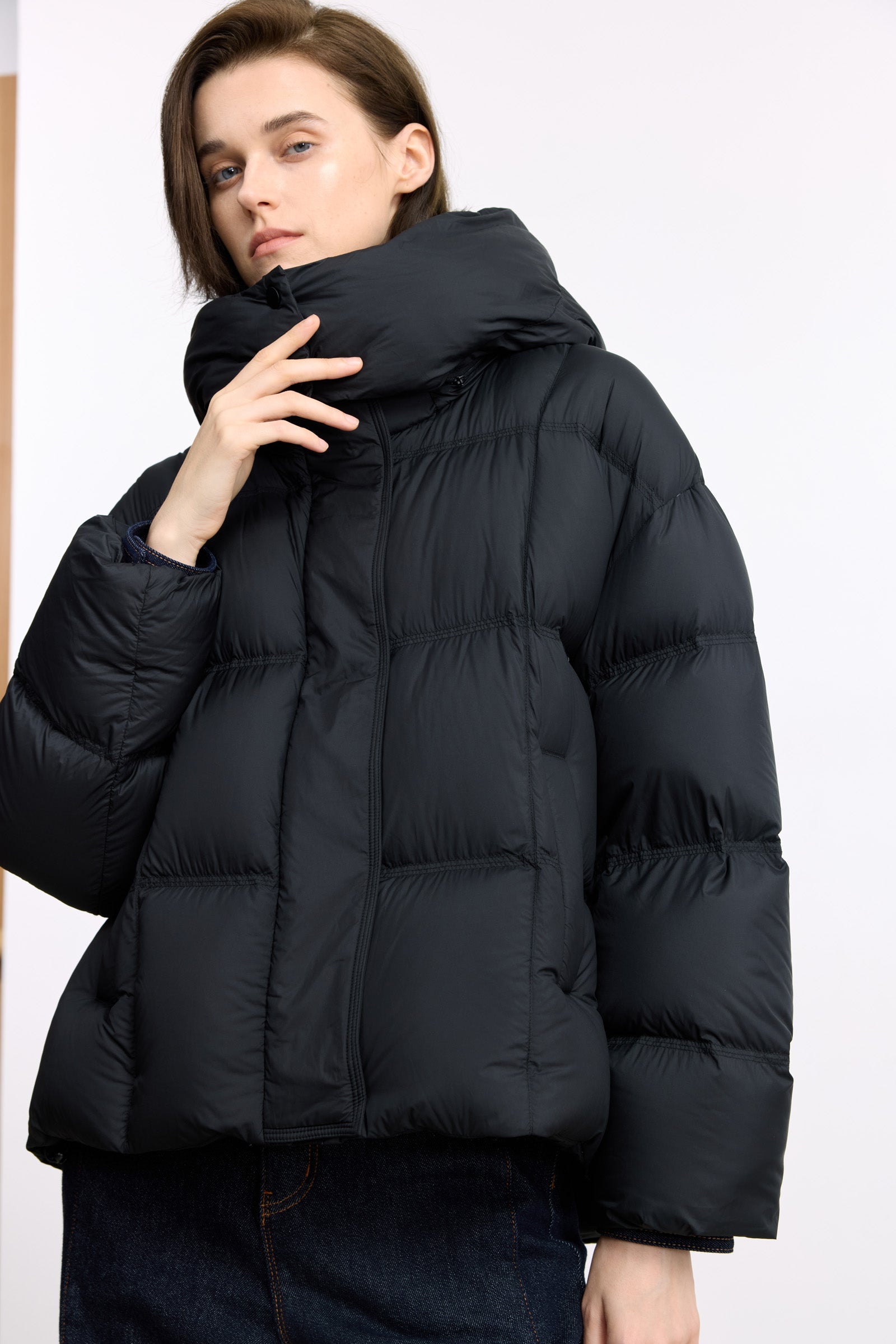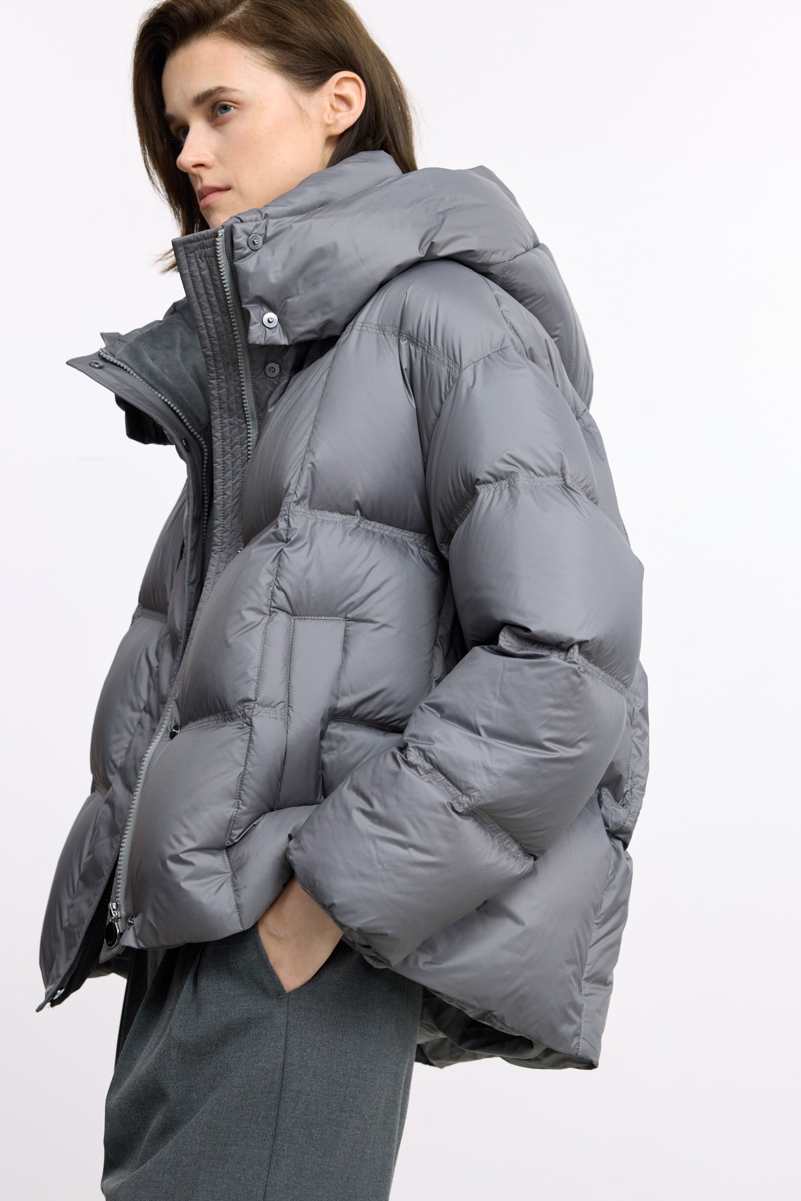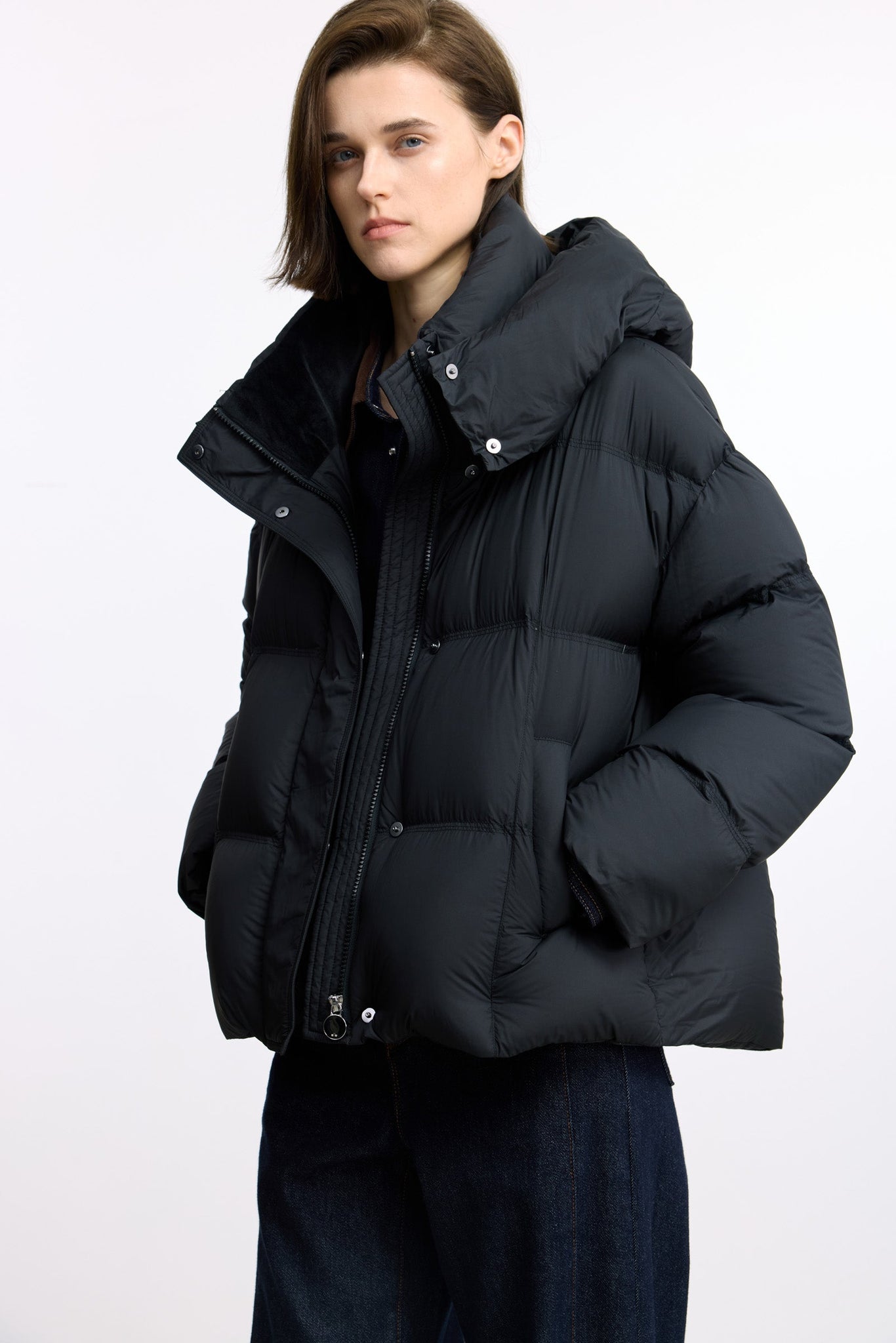 The latticework structure imbues the garment with three-dimensional depth, highlighting the crisp silhouette while creating a sense of simple order. The stand-up collar and hooded design combine warmth with a modern aura, projecting a refined and capable presence. The interweaving of a pine puff shape and a relaxed silhouette juxtaposes lightness and strength, showcasing a relaxed yet assertive, high-sense style.