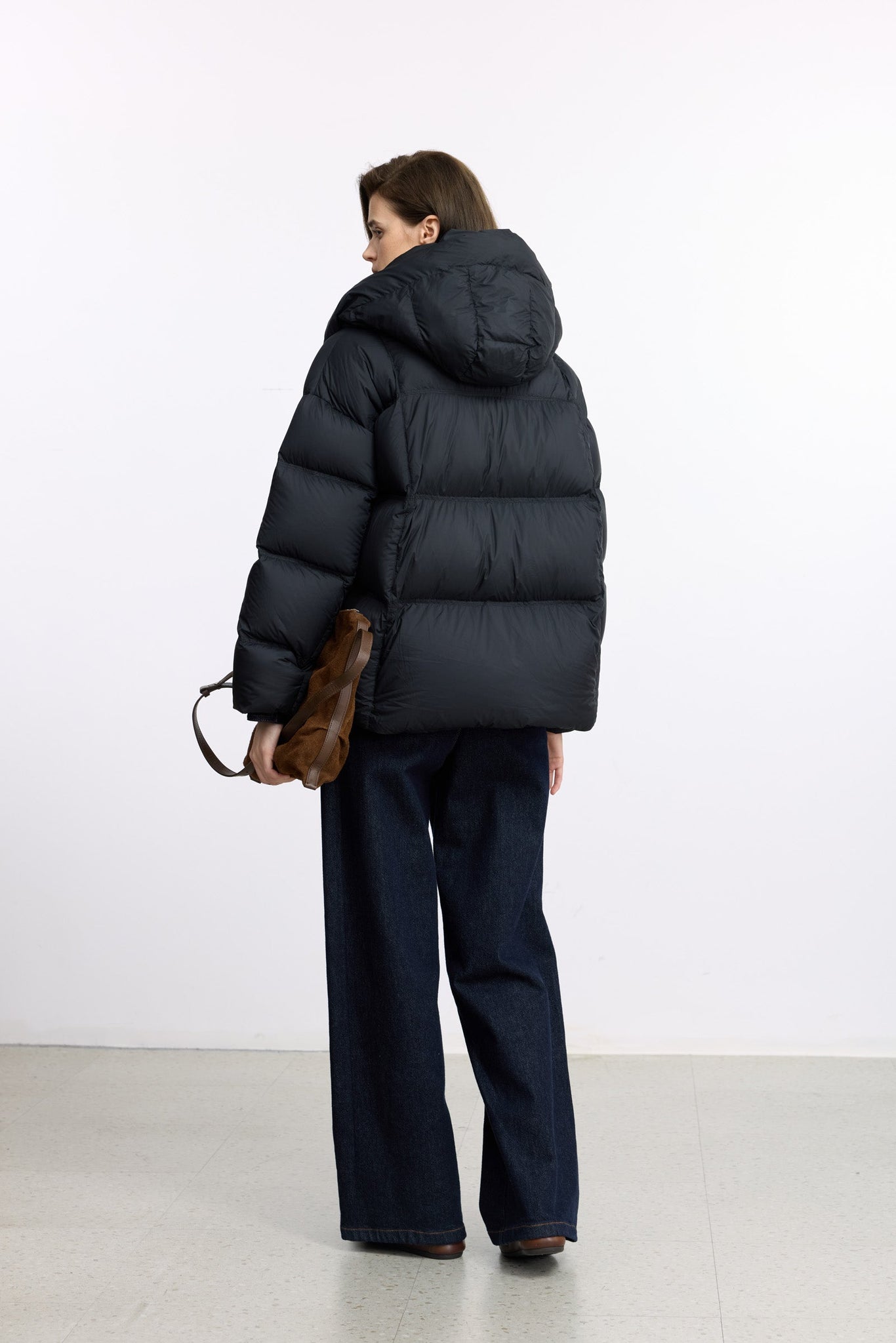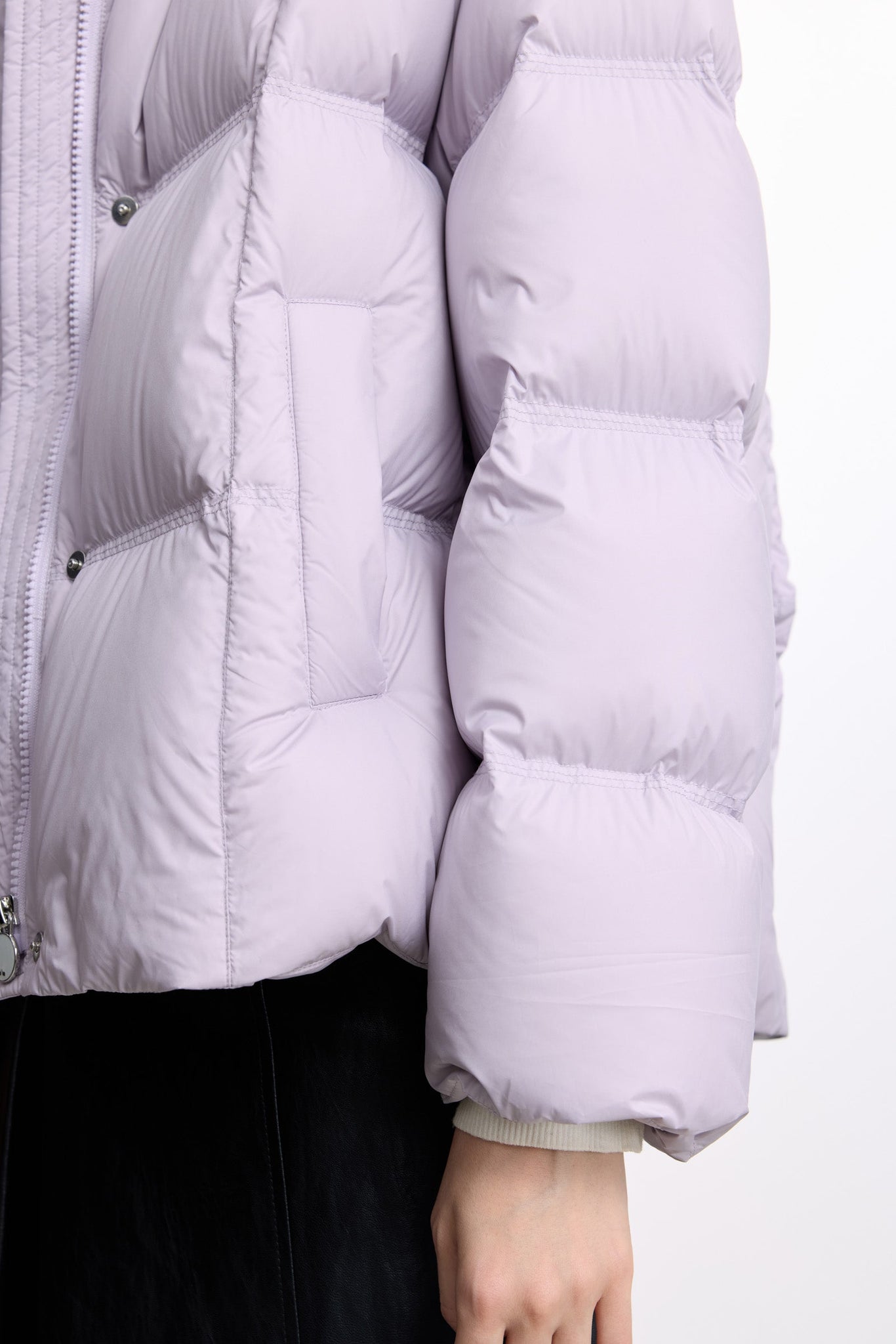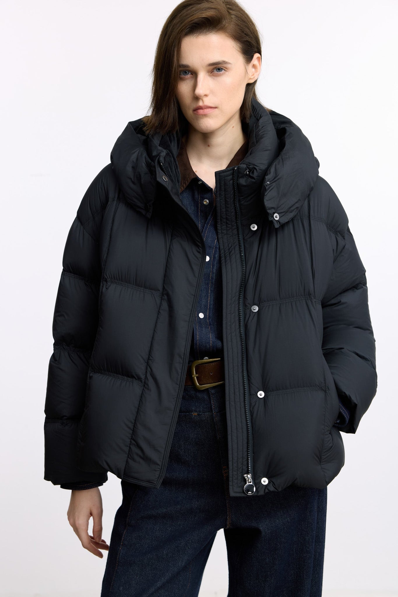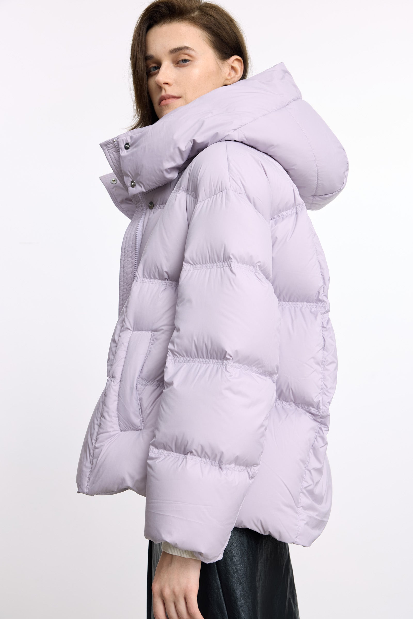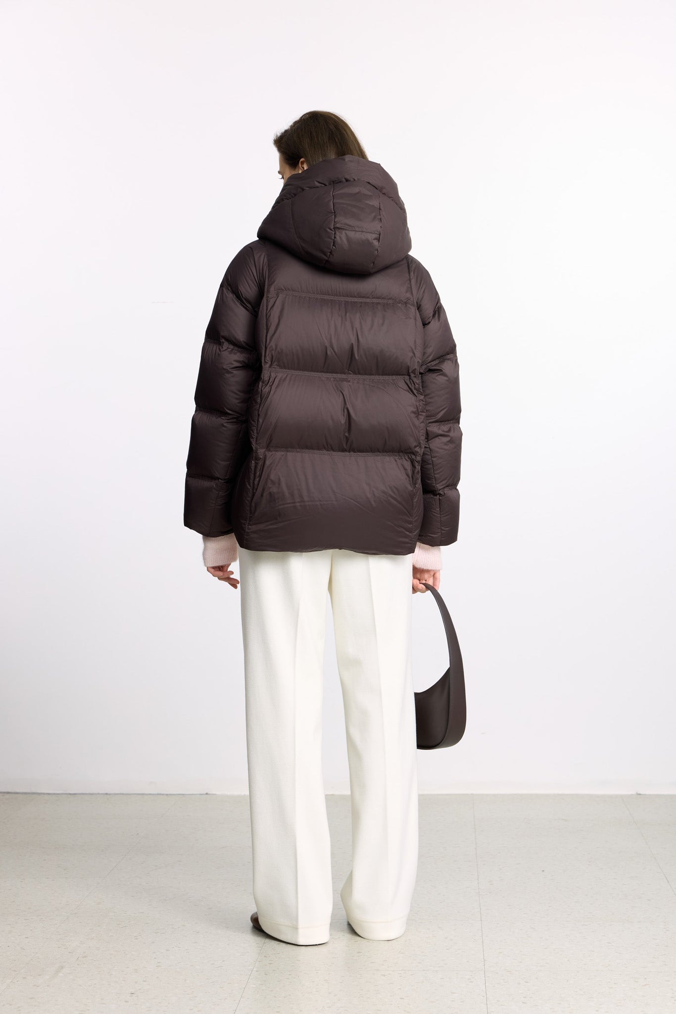 The latticework structure imbues the garment with three-dimensional depth, highlighting the crisp silhouette while creating a sense of simple order. The stand-up collar and hooded design combine warmth with a modern aura, projecting a refined and capable presence. The interweaving of a pine puff shape and a relaxed silhouette juxtaposes lightness and strength, showcasing a relaxed yet assertive, high-sense style.