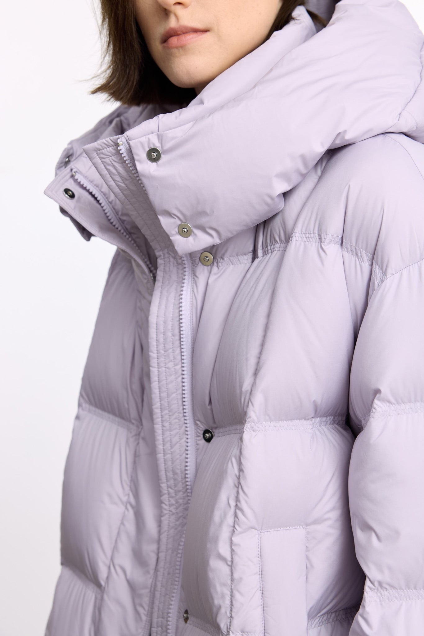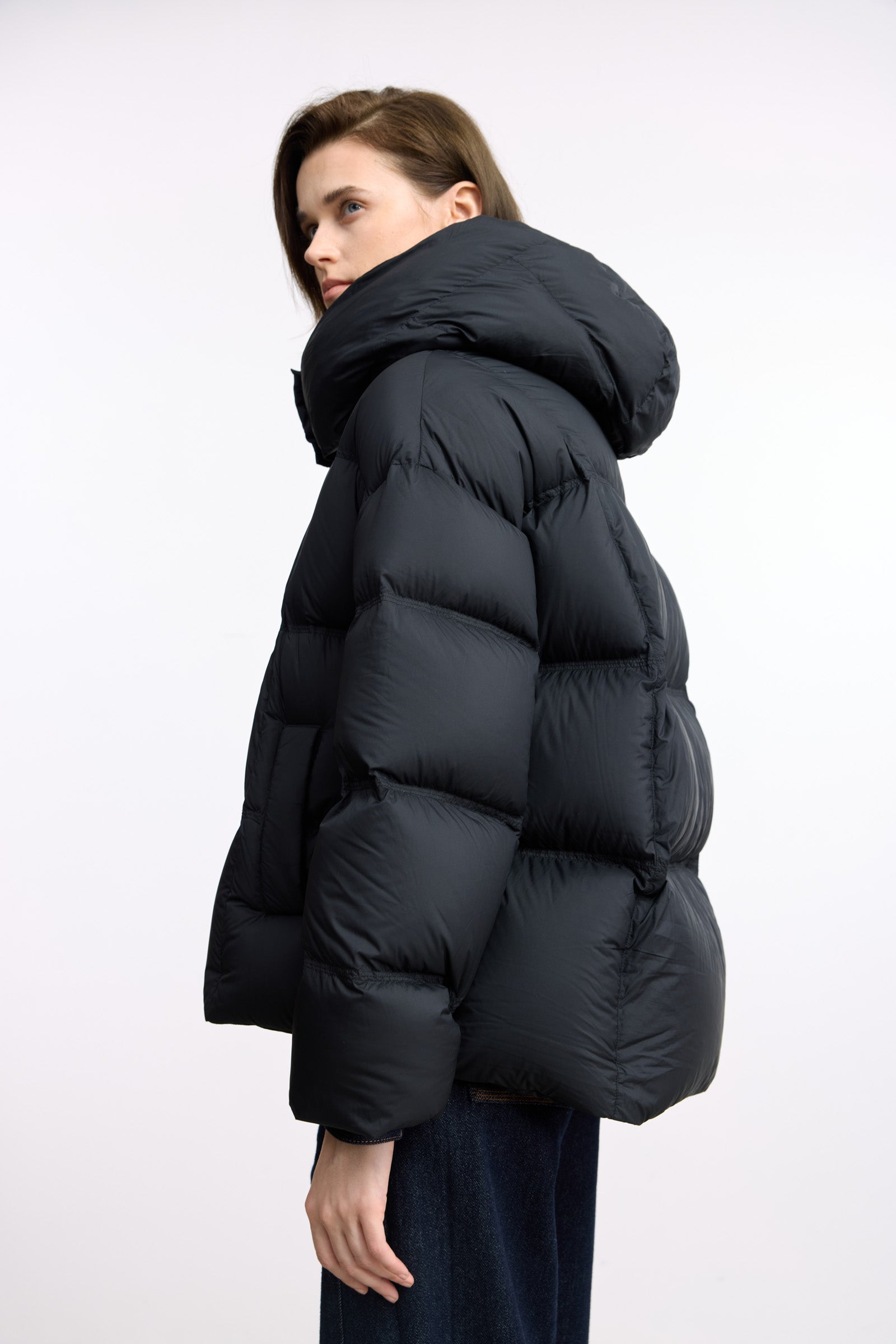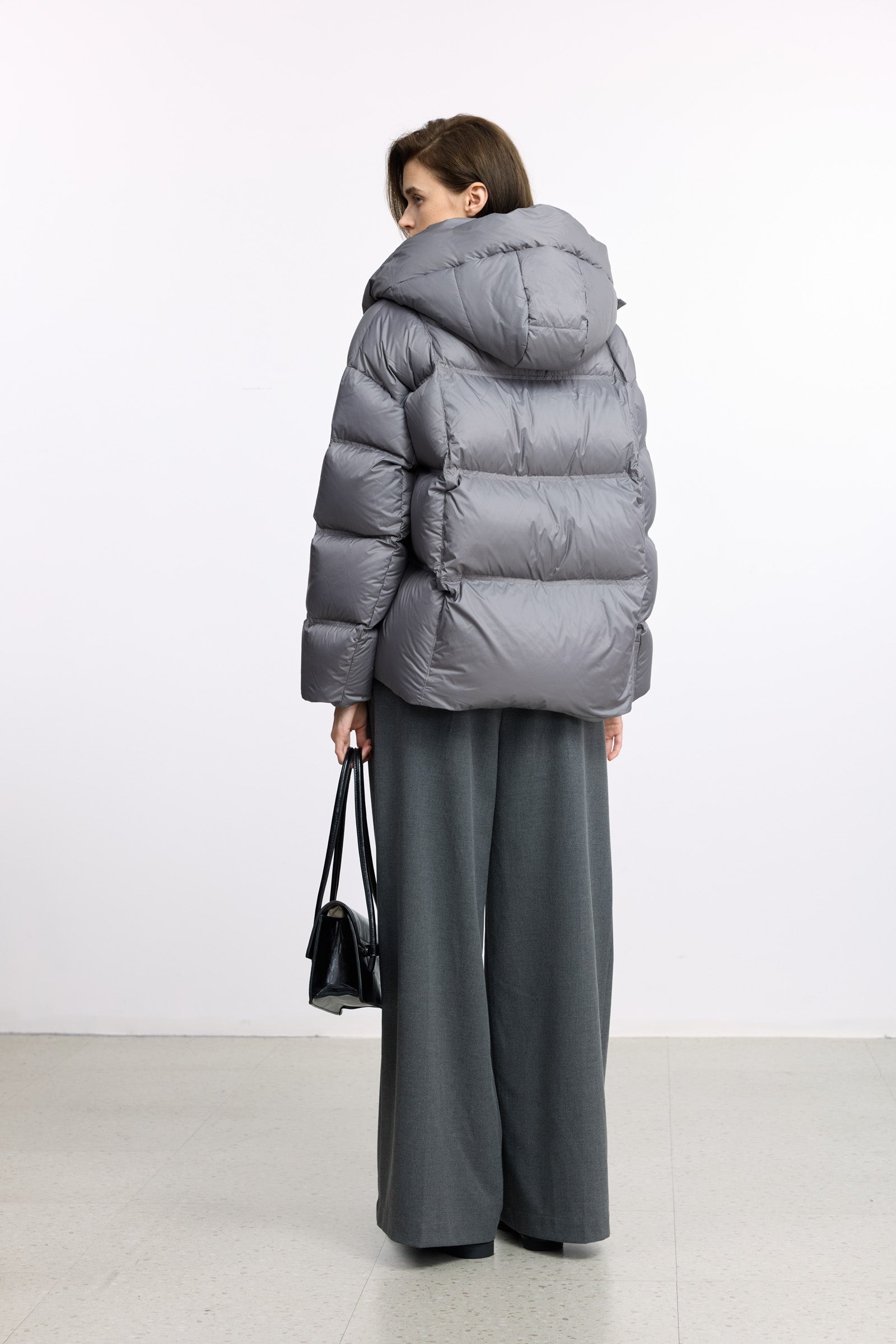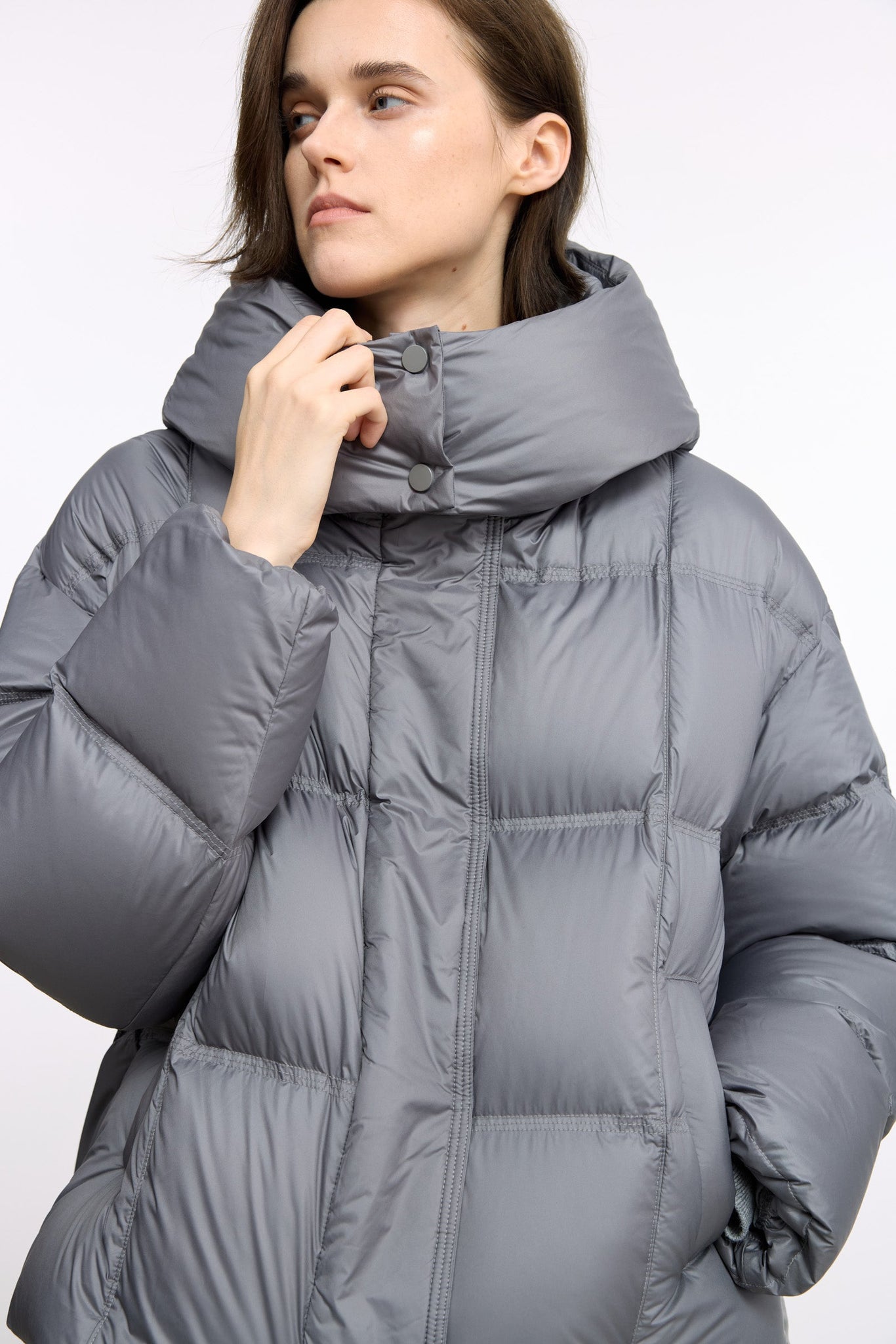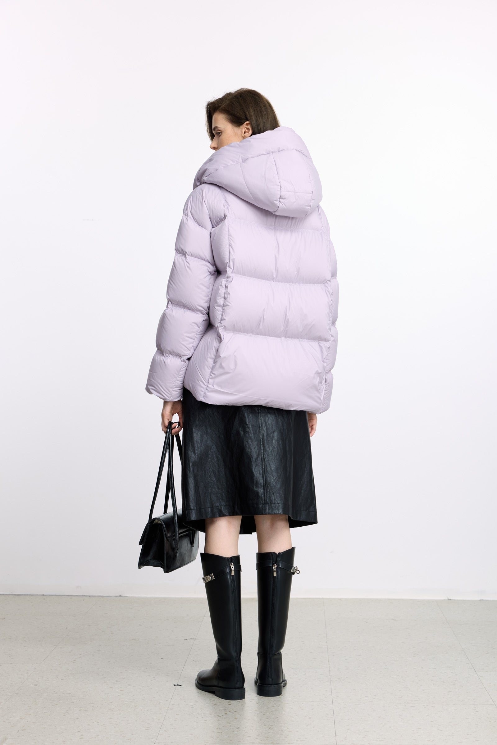 The latticework structure imbues the garment with three-dimensional depth, highlighting the crisp silhouette while creating a sense of simple order. The stand-up collar and hooded design combine warmth with a modern aura, projecting a refined and capable presence. The interweaving of a pine puff shape and a relaxed silhouette juxtaposes lightness and strength, showcasing a relaxed yet assertive, high-sense style.