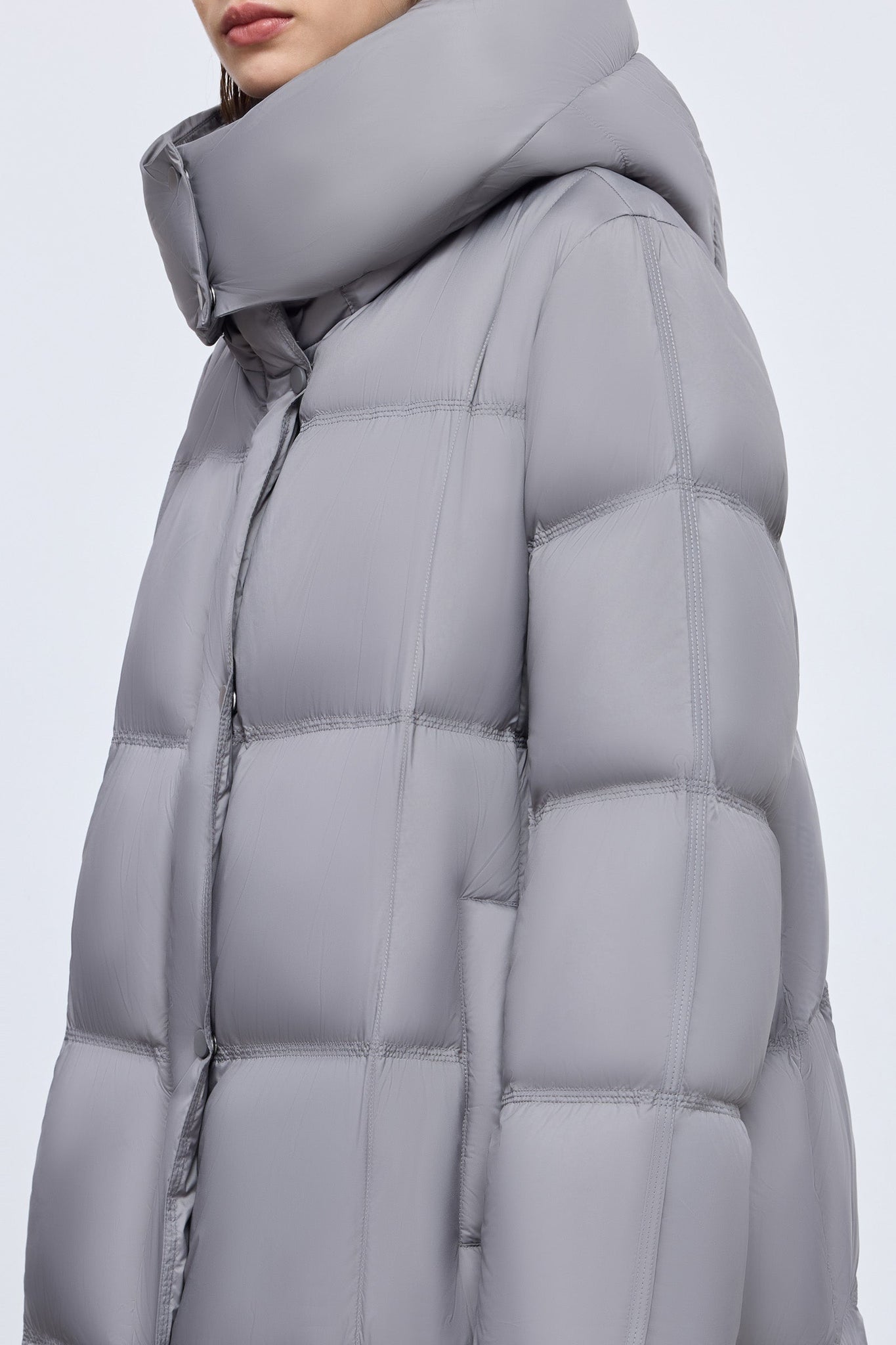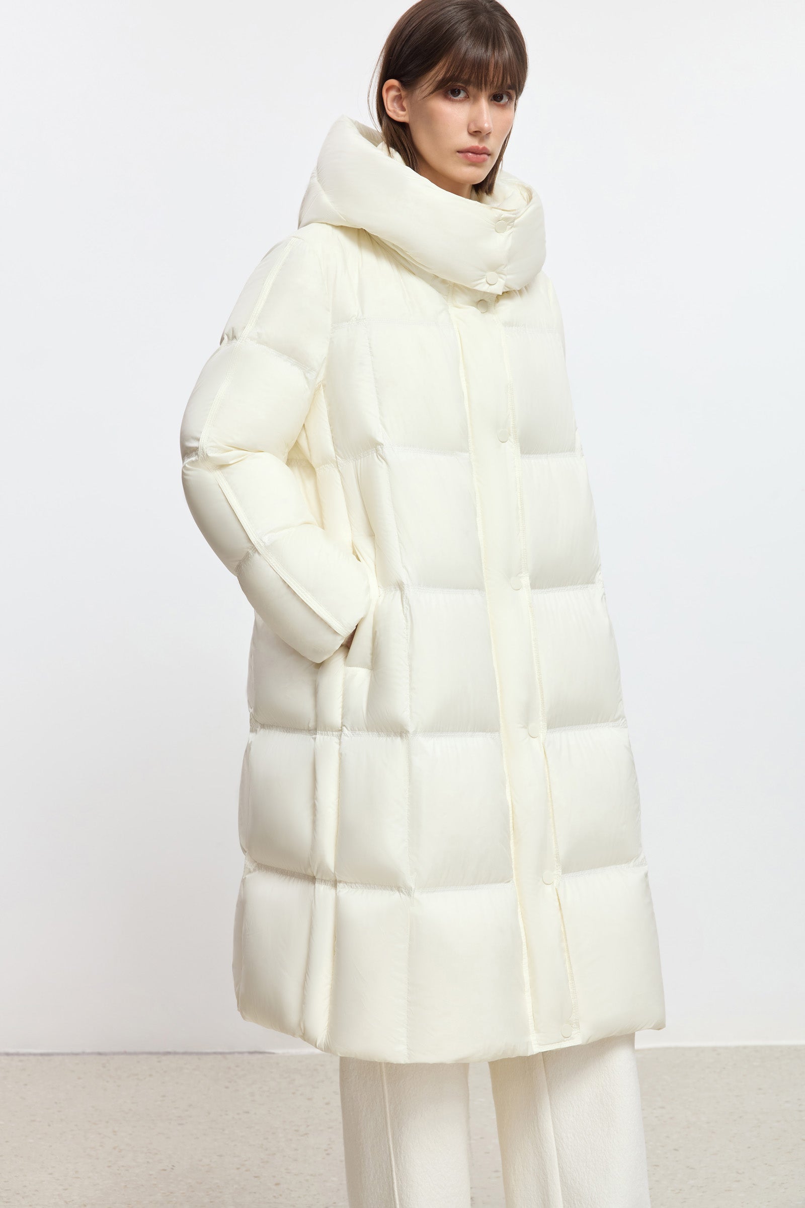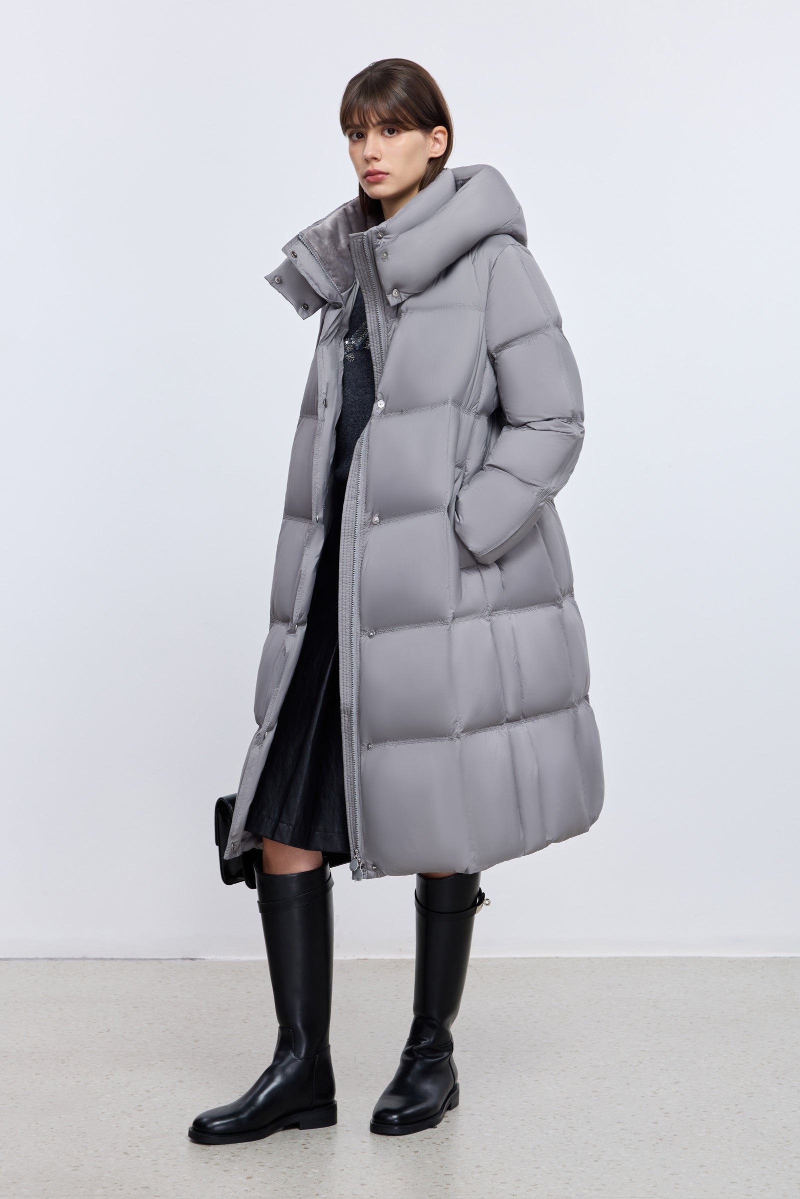 Rejecting the traditional bulky, clumsy feel of down jackets, this jacket introduces a French cocoon-shaped silhouette for the first time. Compared to the traditional H-shaped down jacket, this slightly looser cocoon shape offers greater comfort. The front is fitted, while the back flows smoothly from the shoulder line, extending downward to the hem, subtly flattering the figure. The slightly rounded center design softens the shoulders, creating a visually light and relaxed effect, adding a touch of French casualness and elegance, giving a down jacket the refined, relaxed feel of a coat.