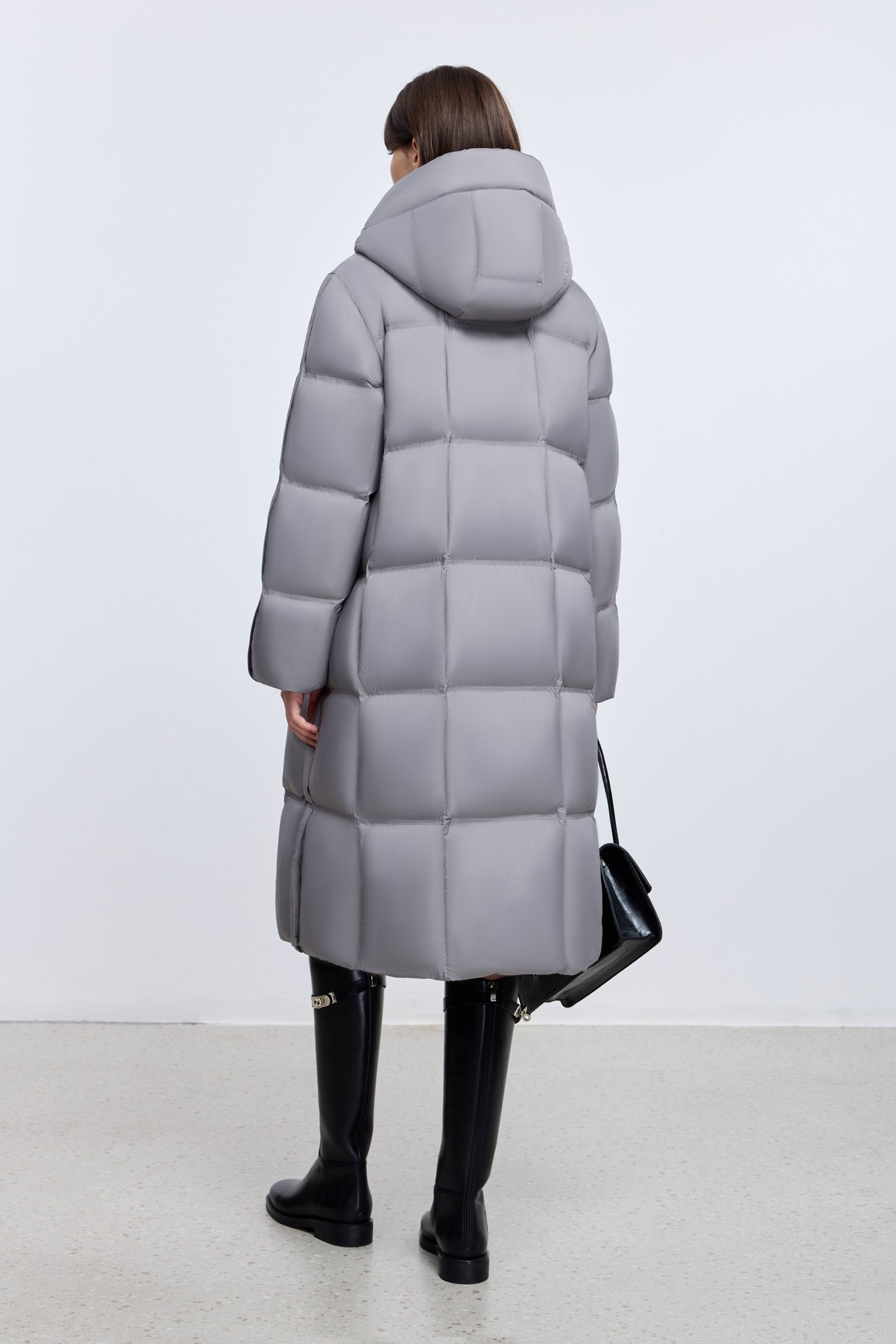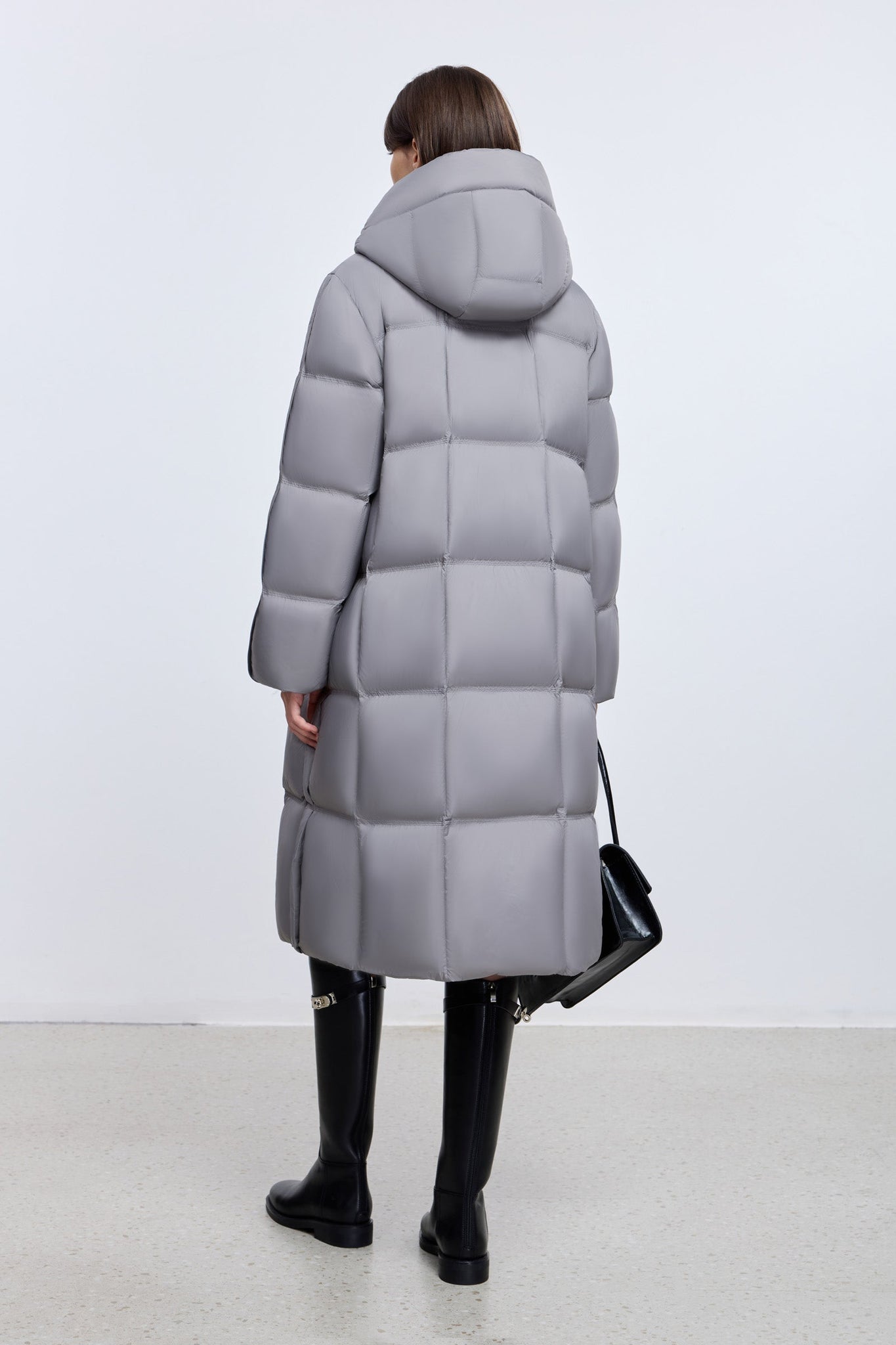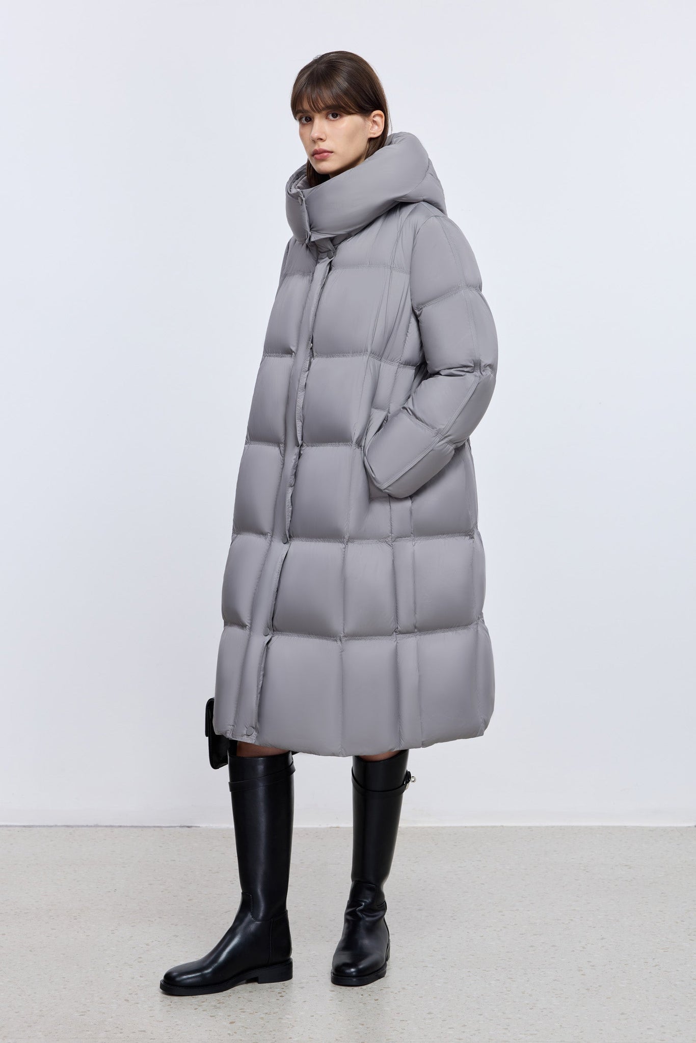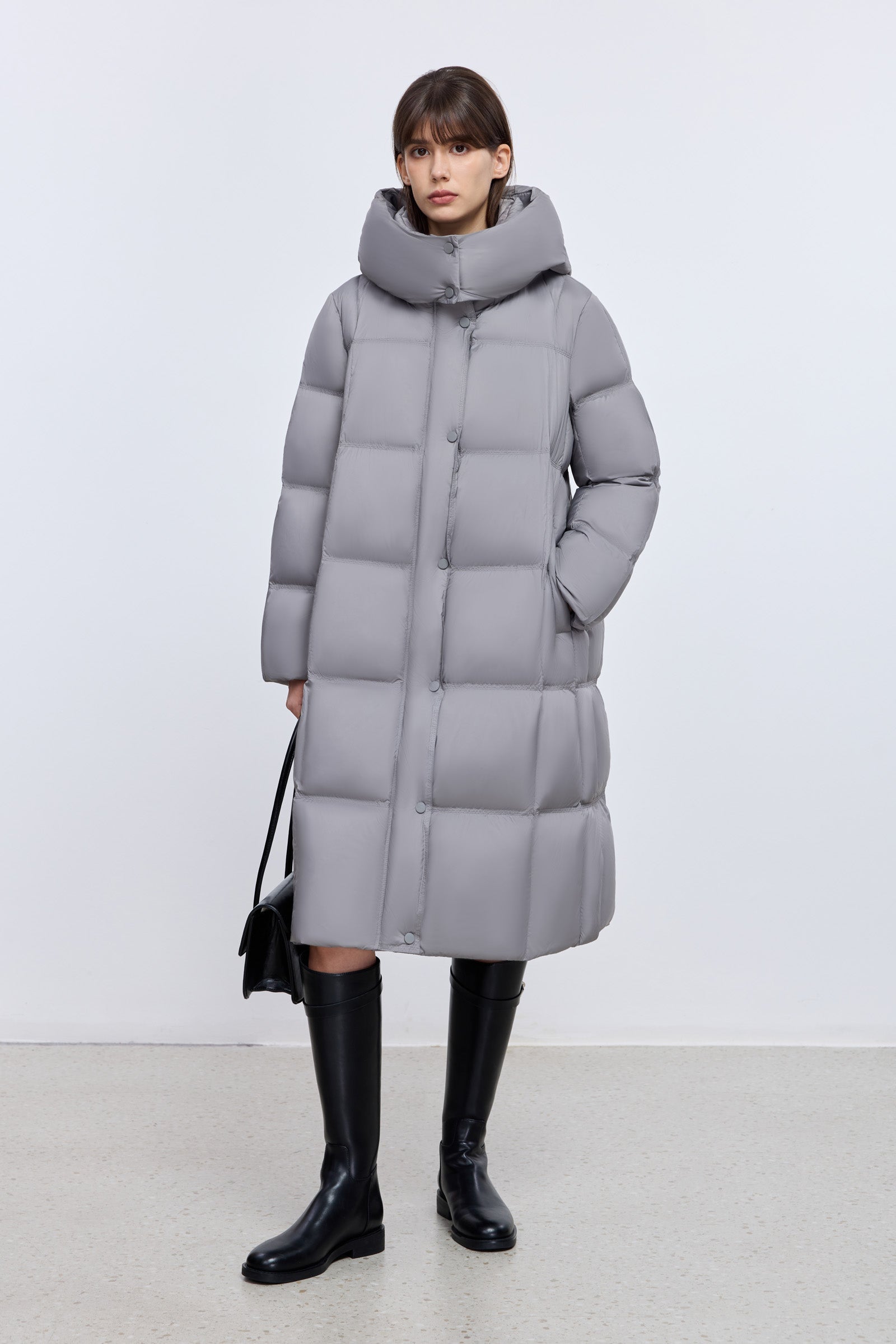 Rejecting the traditional bulky, clumsy feel of down jackets, this jacket introduces a French cocoon-shaped silhouette for the first time. Compared to the traditional H-shaped down jacket, this slightly looser cocoon shape offers greater comfort. The front is fitted, while the back flows smoothly from the shoulder line, extending downward to the hem, subtly flattering the figure. The slightly rounded center design softens the shoulders, creating a visually light and relaxed effect, adding a touch of French casualness and elegance, giving a down jacket the refined, relaxed feel of a coat.
