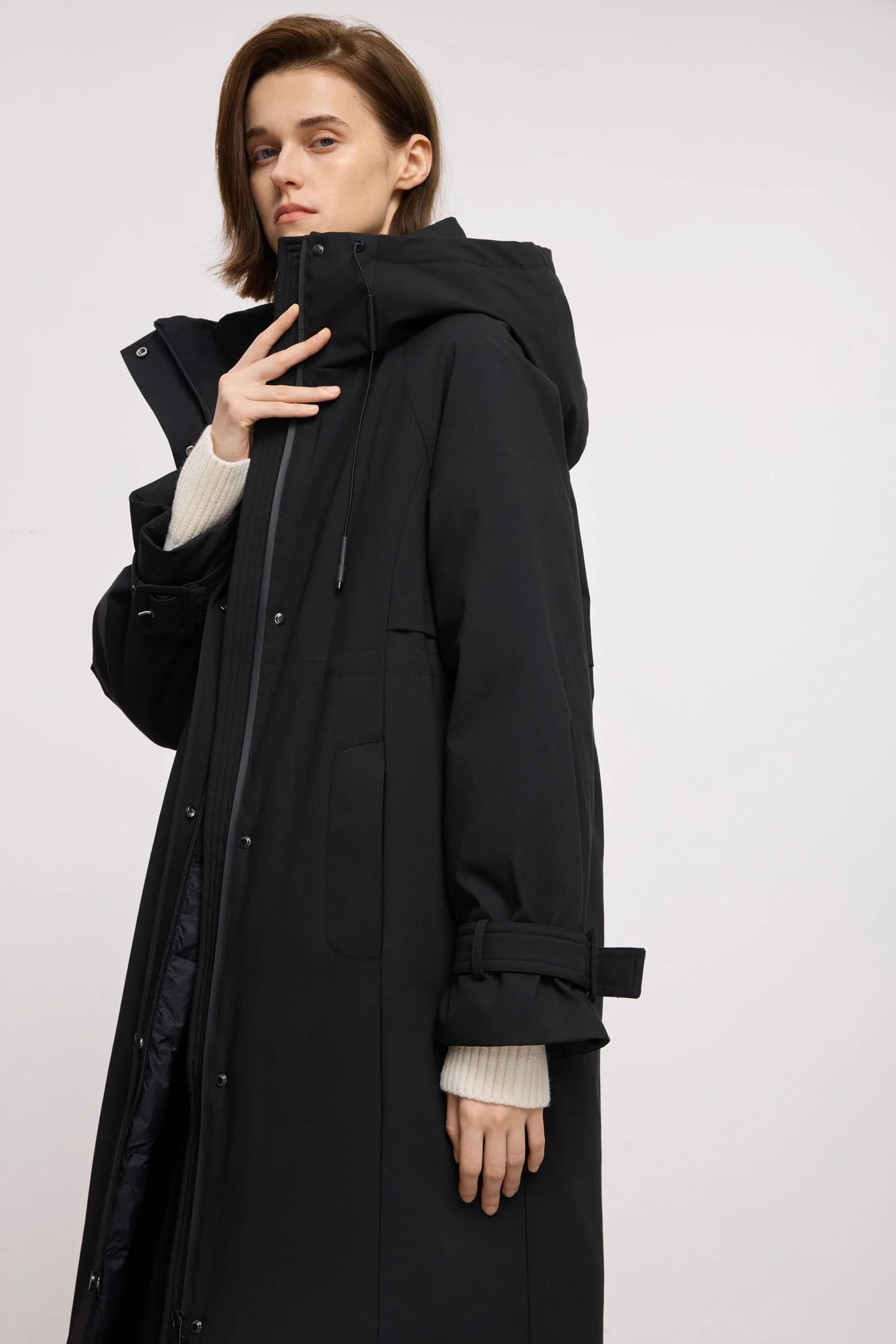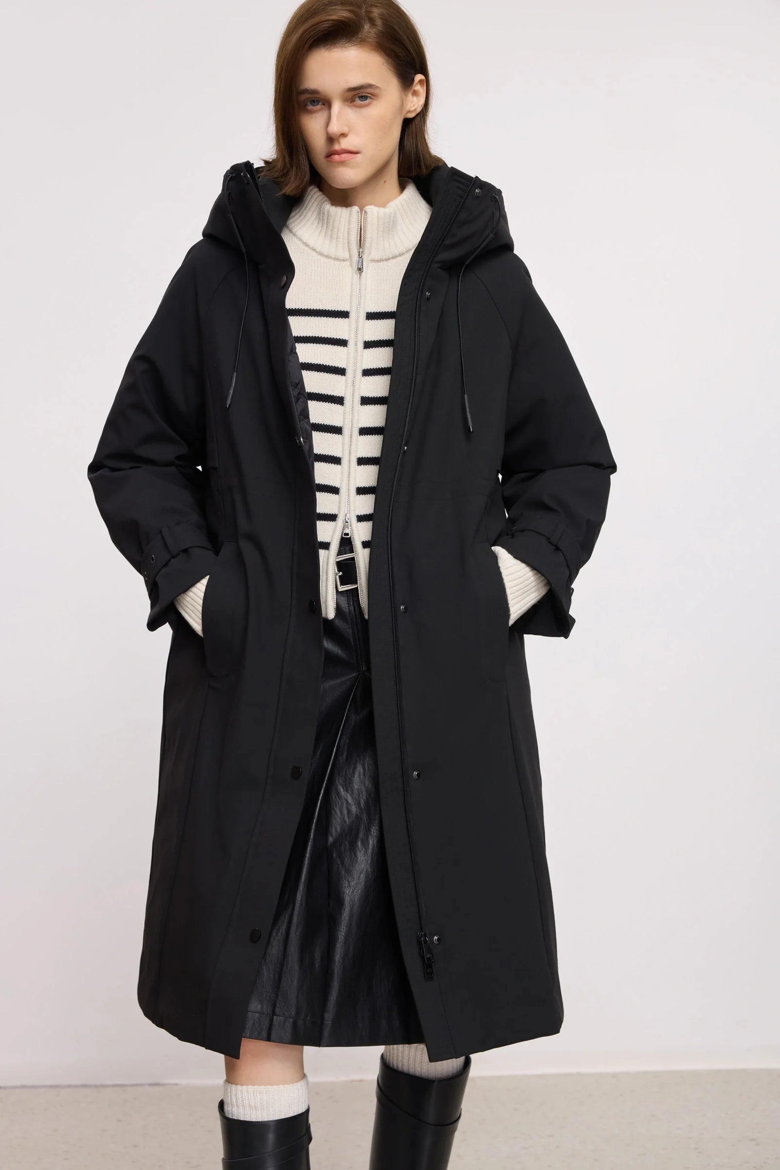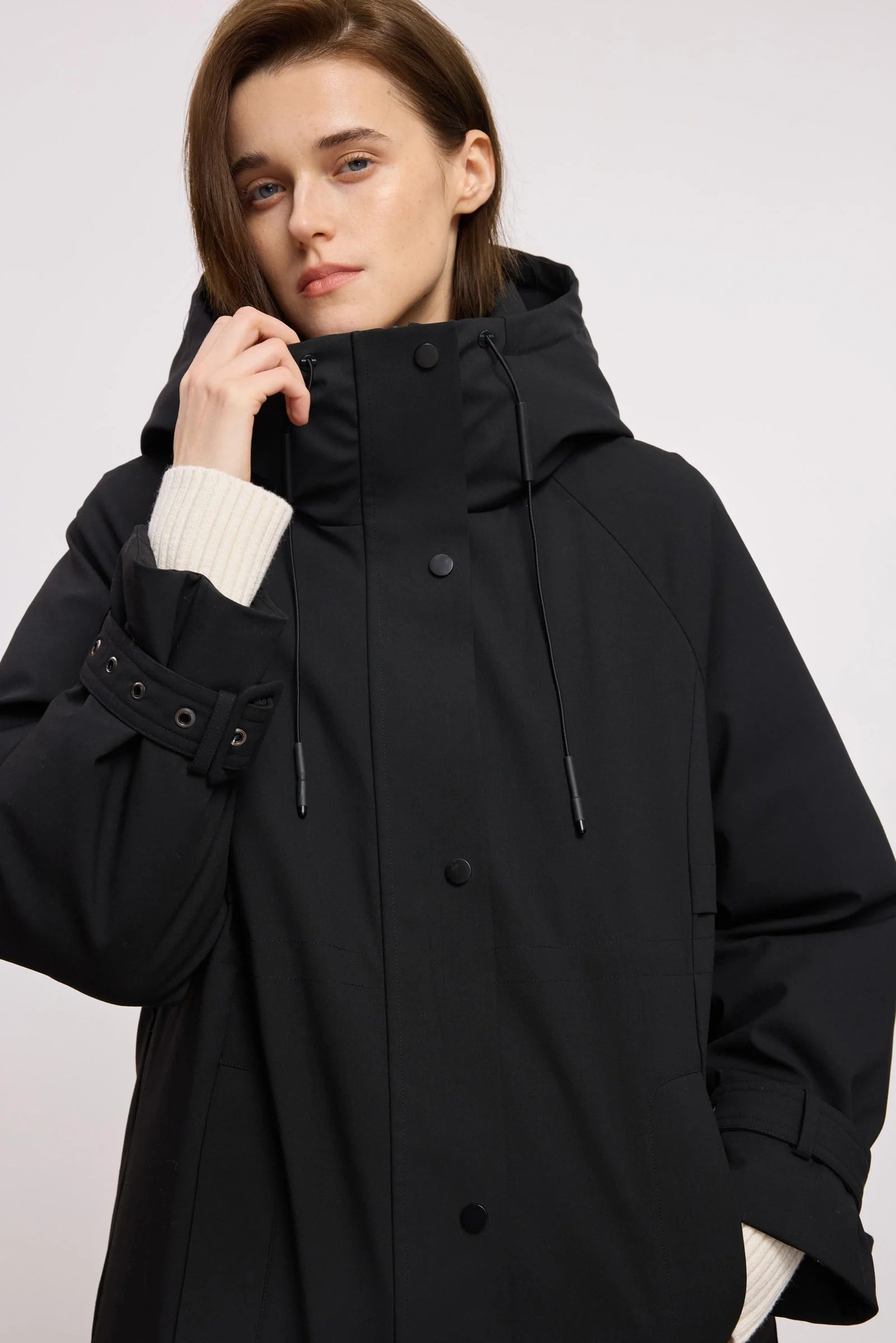 This stylish, black long down jacket is the foundation. Its loose, straight fit offers both a commanding presence and a comfortable fit, allowing you to maintain a sharp silhouette even in winter. The drawstring hood provides protection from the cold and allows for flexible adjustments. The adjustable cuffs, with meticulous attention to detail, offer a practical and effortless experience, making travel more effortless.
