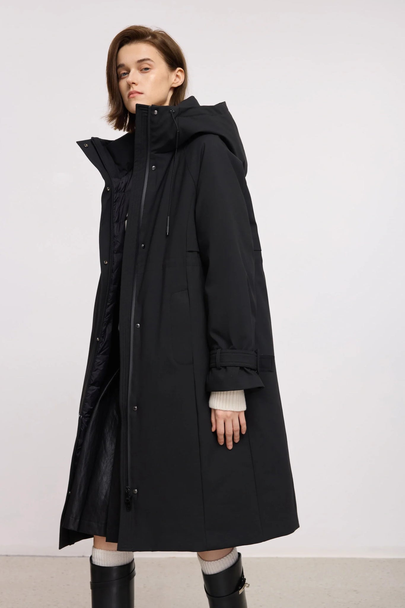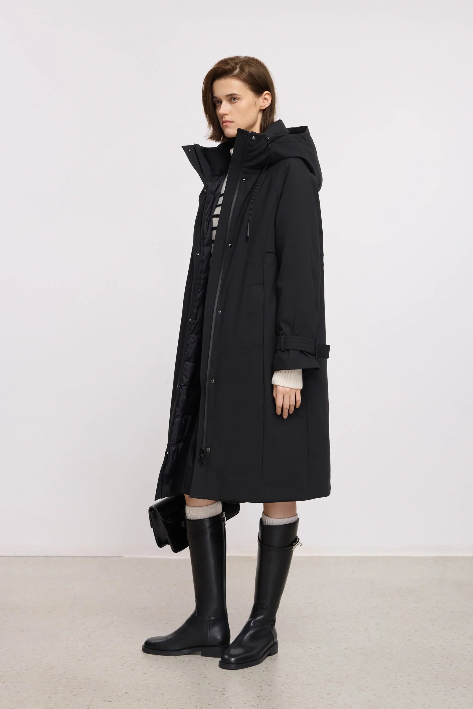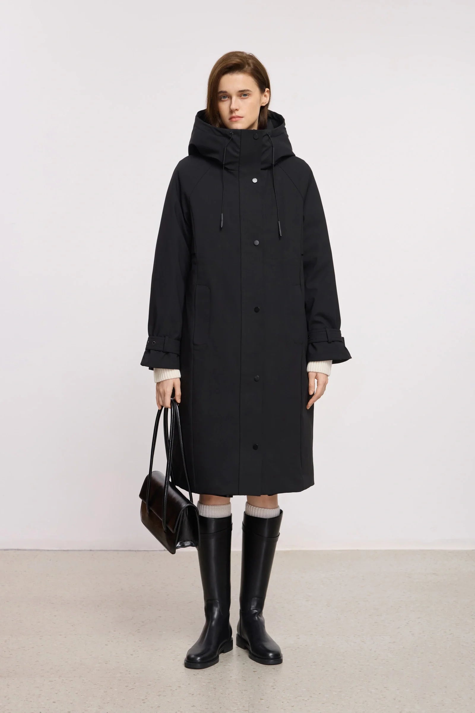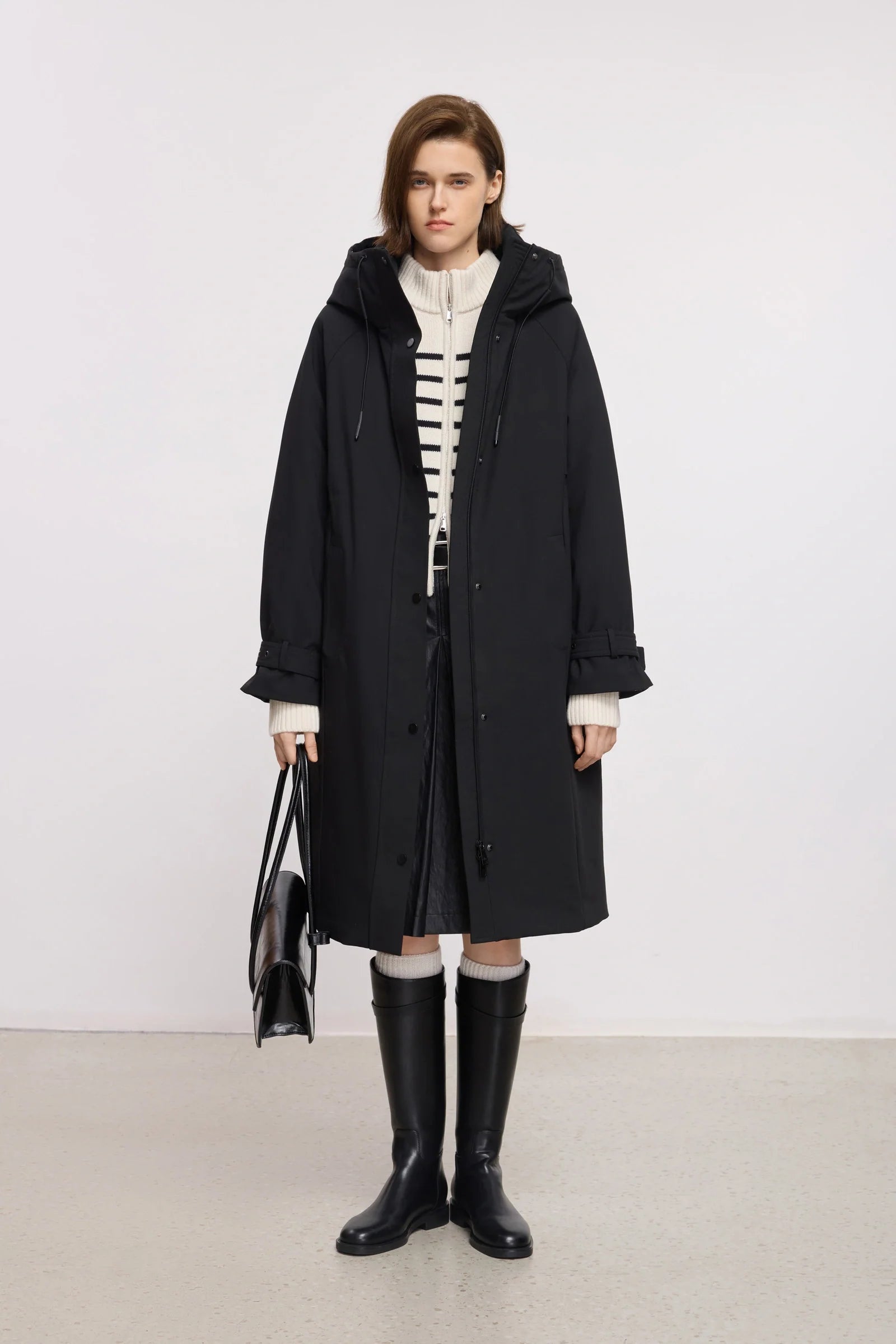 This stylish, black long down jacket is the foundation. Its loose, straight fit offers both a commanding presence and a comfortable fit, allowing you to maintain a sharp silhouette even in winter. The drawstring hood provides protection from the cold and allows for flexible adjustments. The adjustable cuffs, with meticulous attention to detail, offer a practical and effortless experience, making travel more effortless.